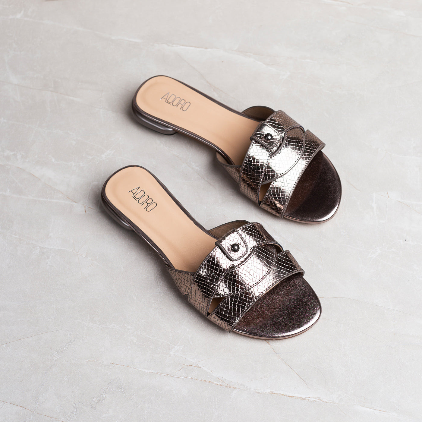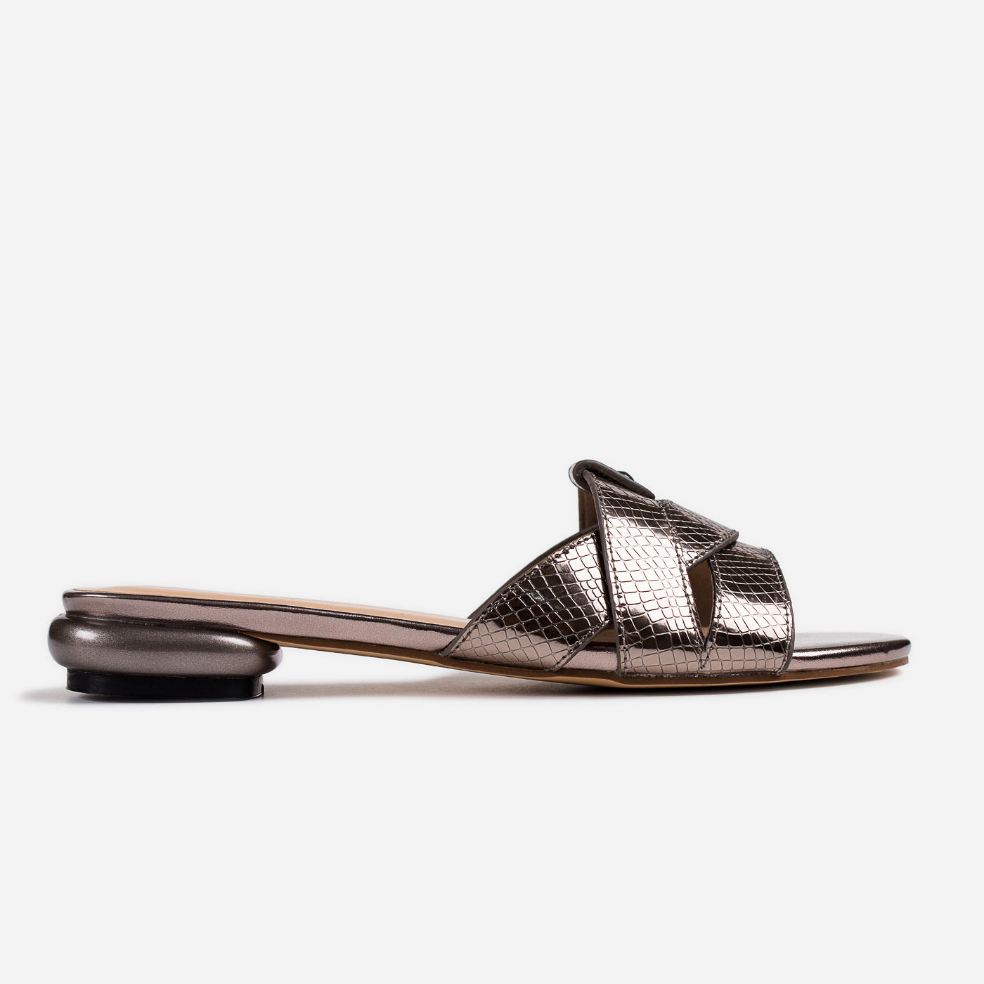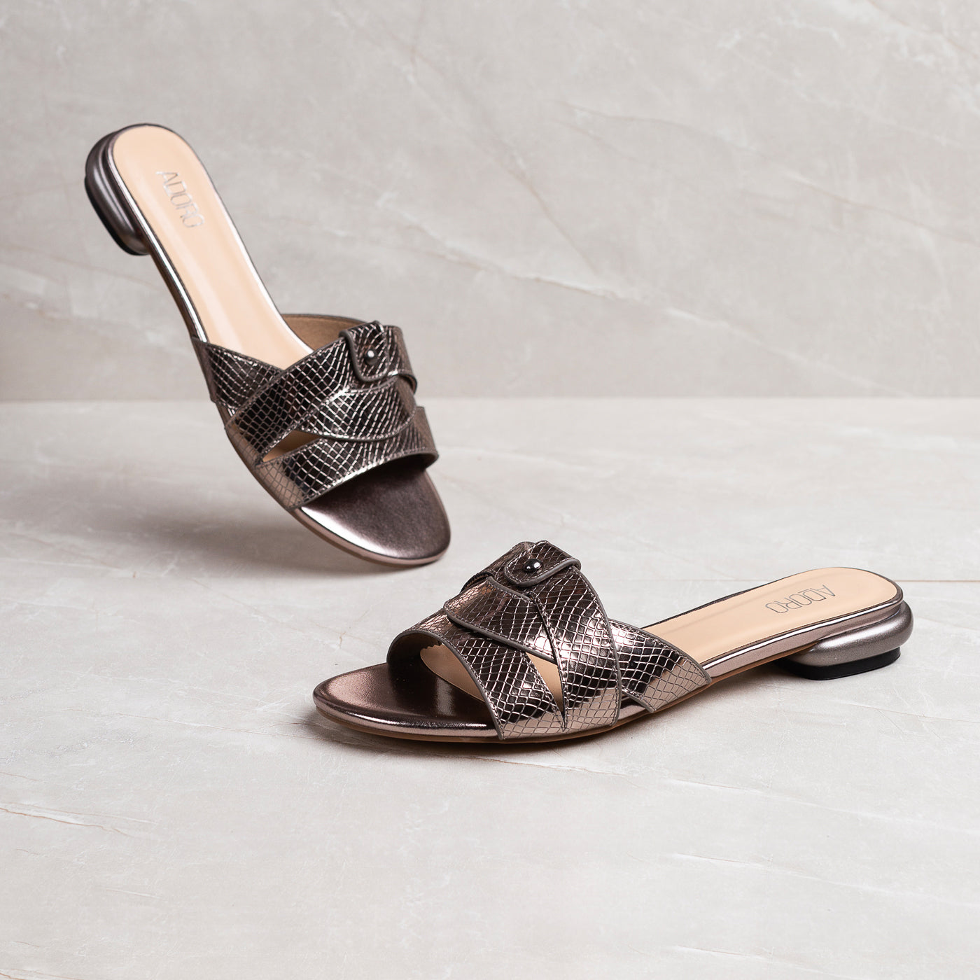 These metallic slides redefine casual chic marrying a subtle snake-skin texture with a sculptural buckle accent. The soft sheen catches light with quiet confidence, while the effortless slip-on silhouette ensures comfort meets couture ease.