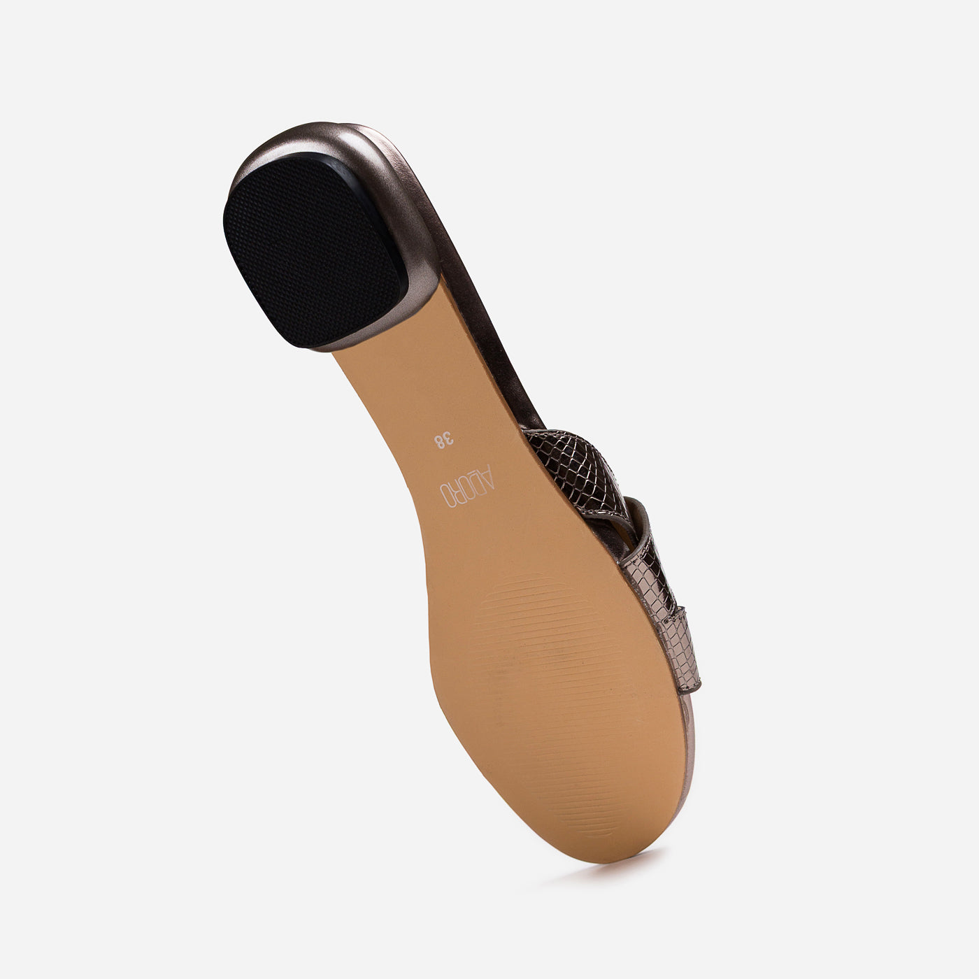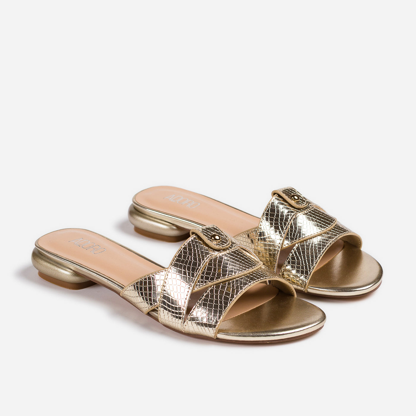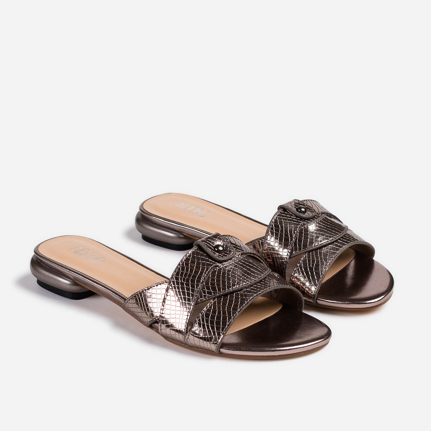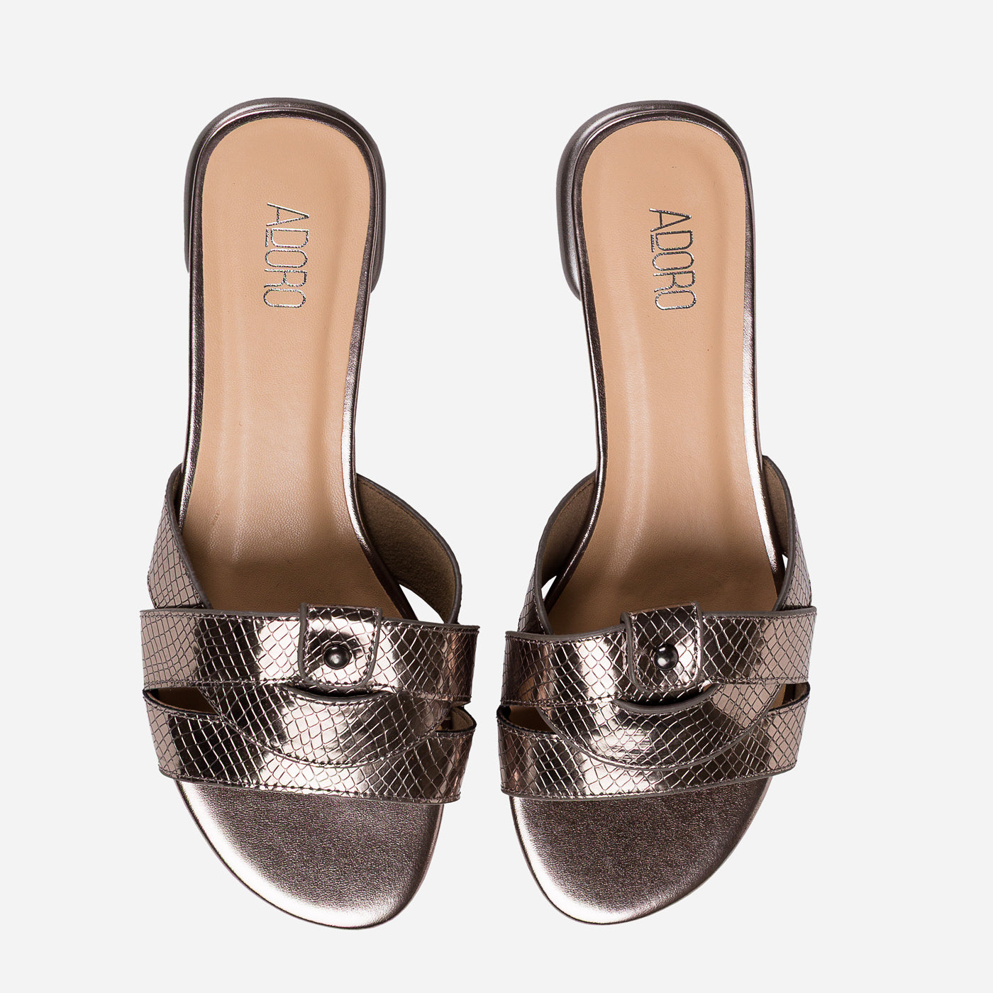 These metallic slides redefine casual chic marrying a subtle snake-skin texture with a sculptural buckle accent. The soft sheen catches light with quiet confidence, while the effortless slip-on silhouette ensures comfort meets couture ease.
