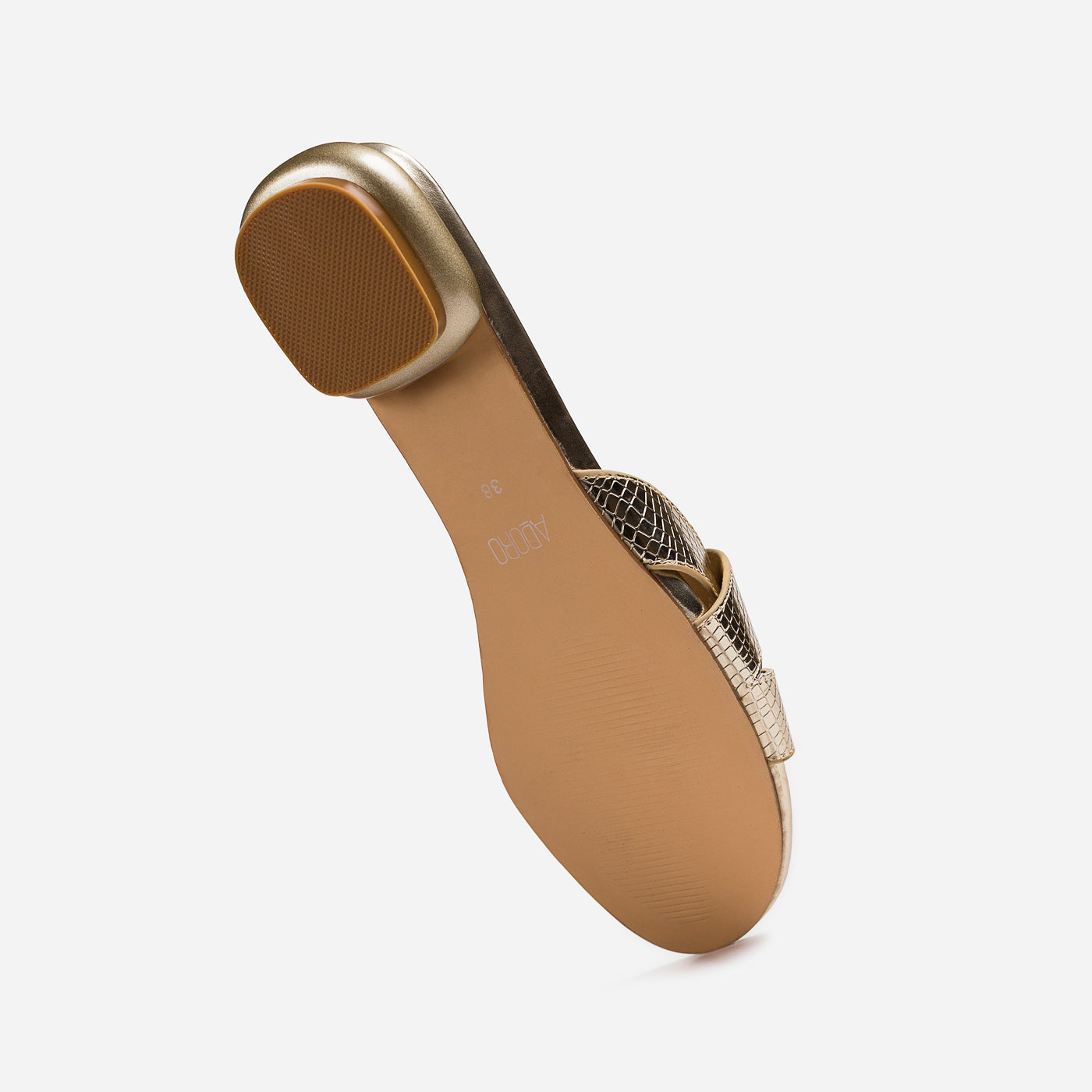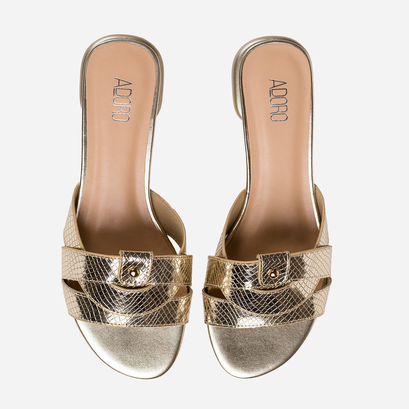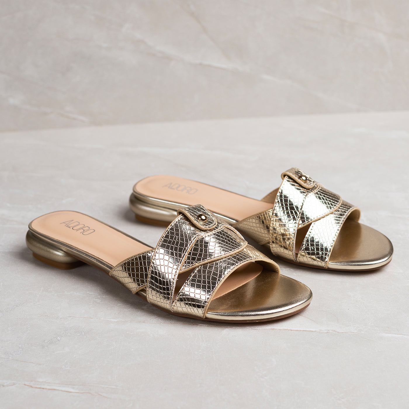 These luminous slides strike the perfect balance between refined glamour and effortless ease. A sculpted strap with an artful metallic texture catches the light like liquid gold, while the sleek, minimalist silhouette keeps the look timeless and polished. Slip them on for an elevated everyday moment an understated indulgence that feels quietly extravagant with every step.