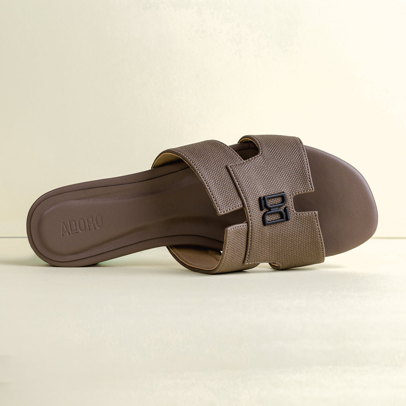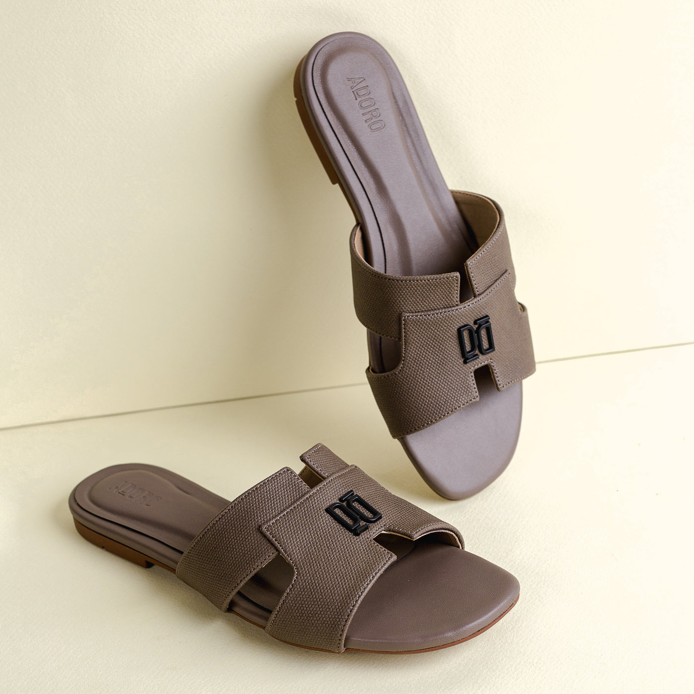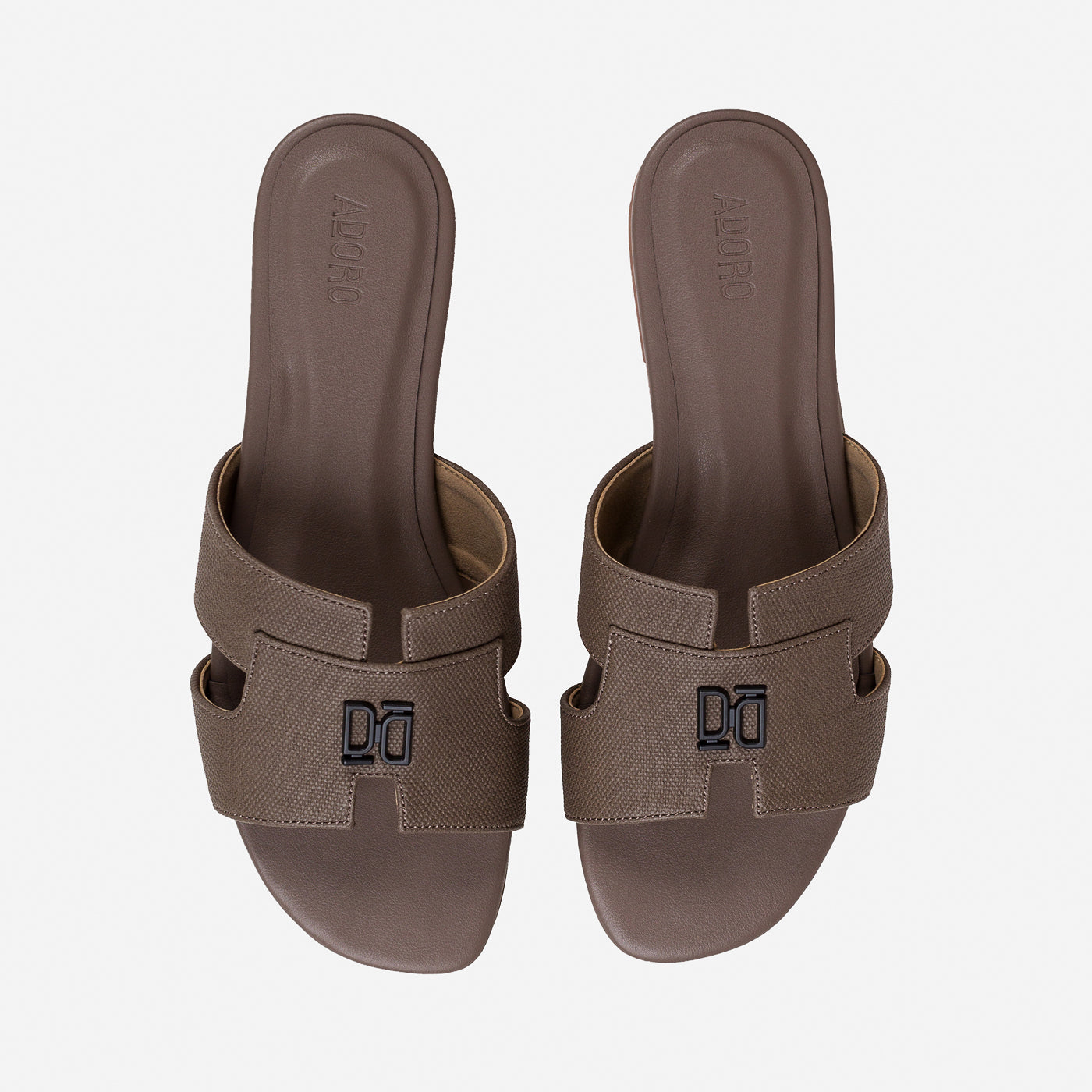 Designed with sculptural precision, the Adoro “Verve” slide blends strength and simplicity in one form. Its broad textured straps offer a grounded, confident profile while the understated monogram detail adds signature refinement. Crafted for all-day ease with a contoured footbed, this versatile pair complements tailored ensembles and relaxed edits alike—proof that minimalism can still make a statement.