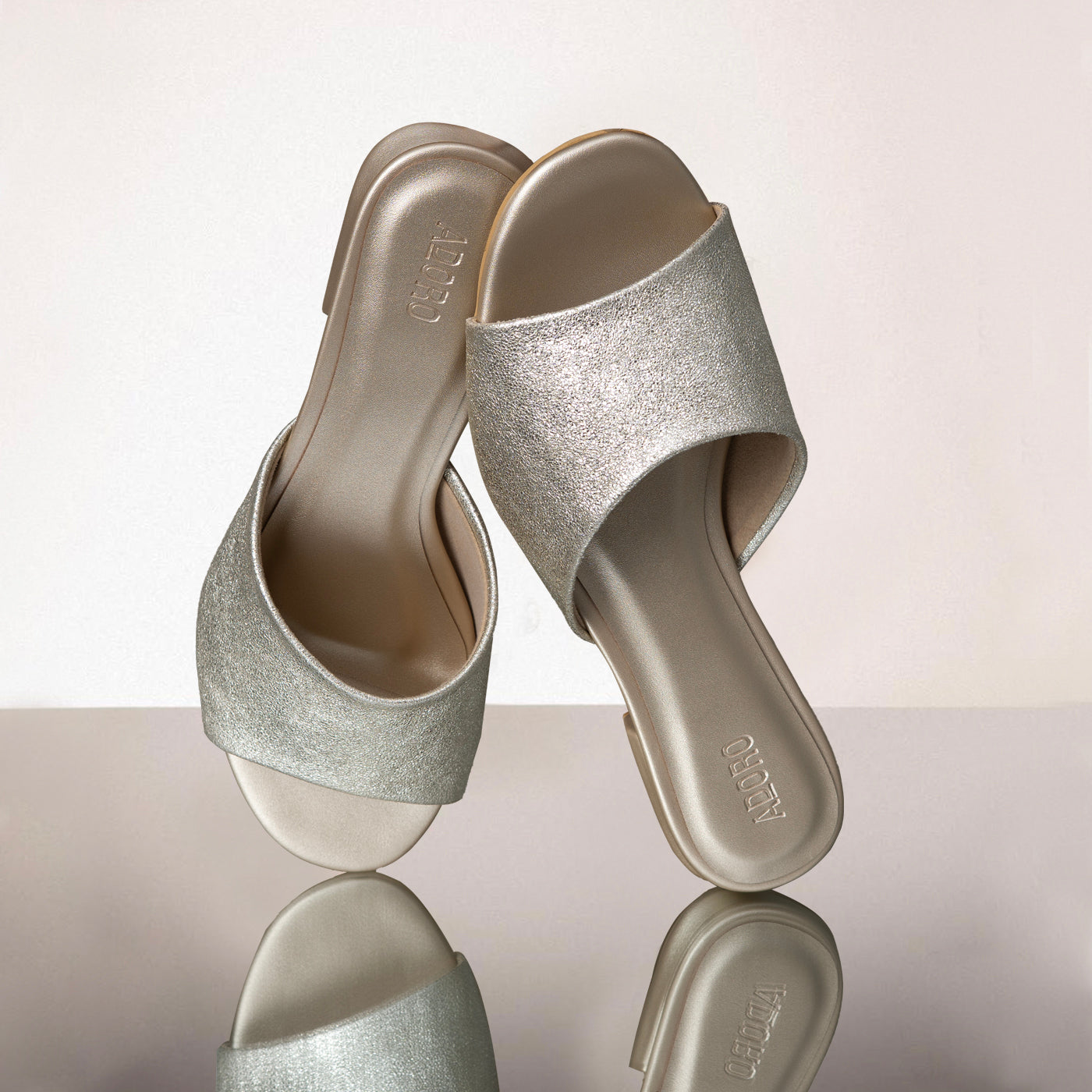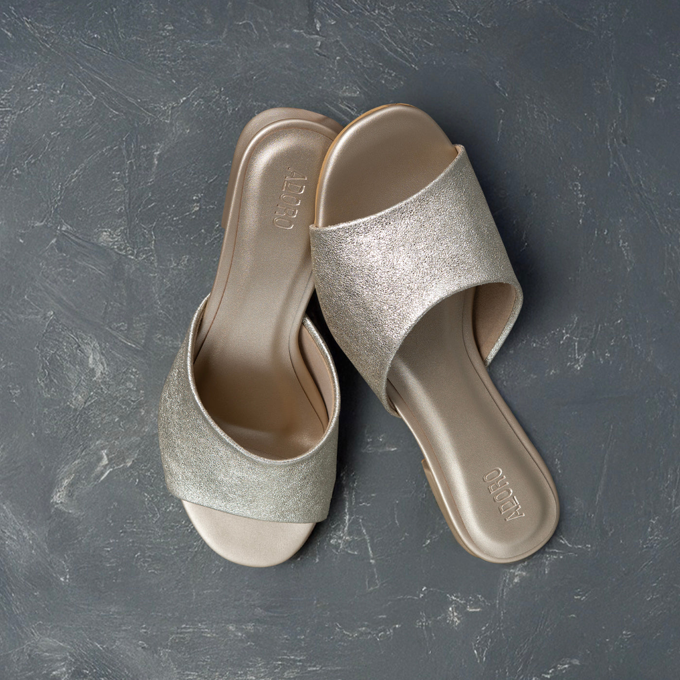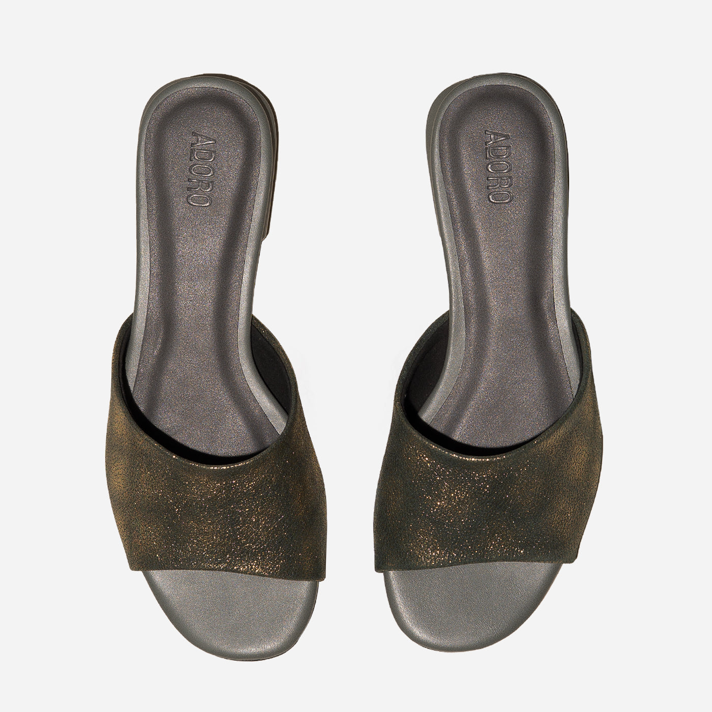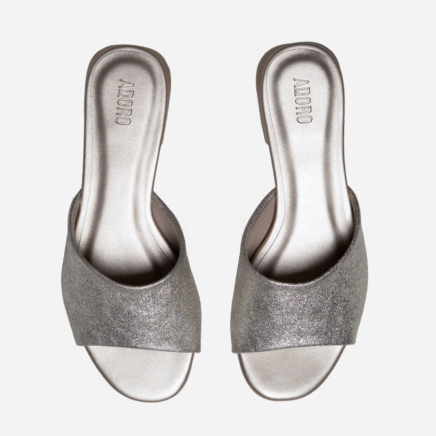 Shine with understated elegance in Adoro’s "Dusk Shimmer" Slides. A shimmering synthetic upper and open round toe give these flats a polished, versatile look. Set on a sleek geometric heel and finished with a padded insole, they offer a stylish yet comfortable fit. From brunch dates to evening strolls, these slides are designed to keep you glowing all day.