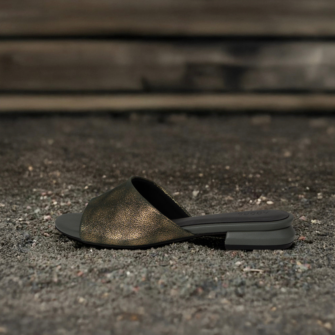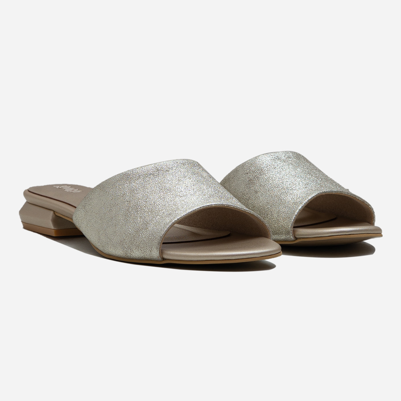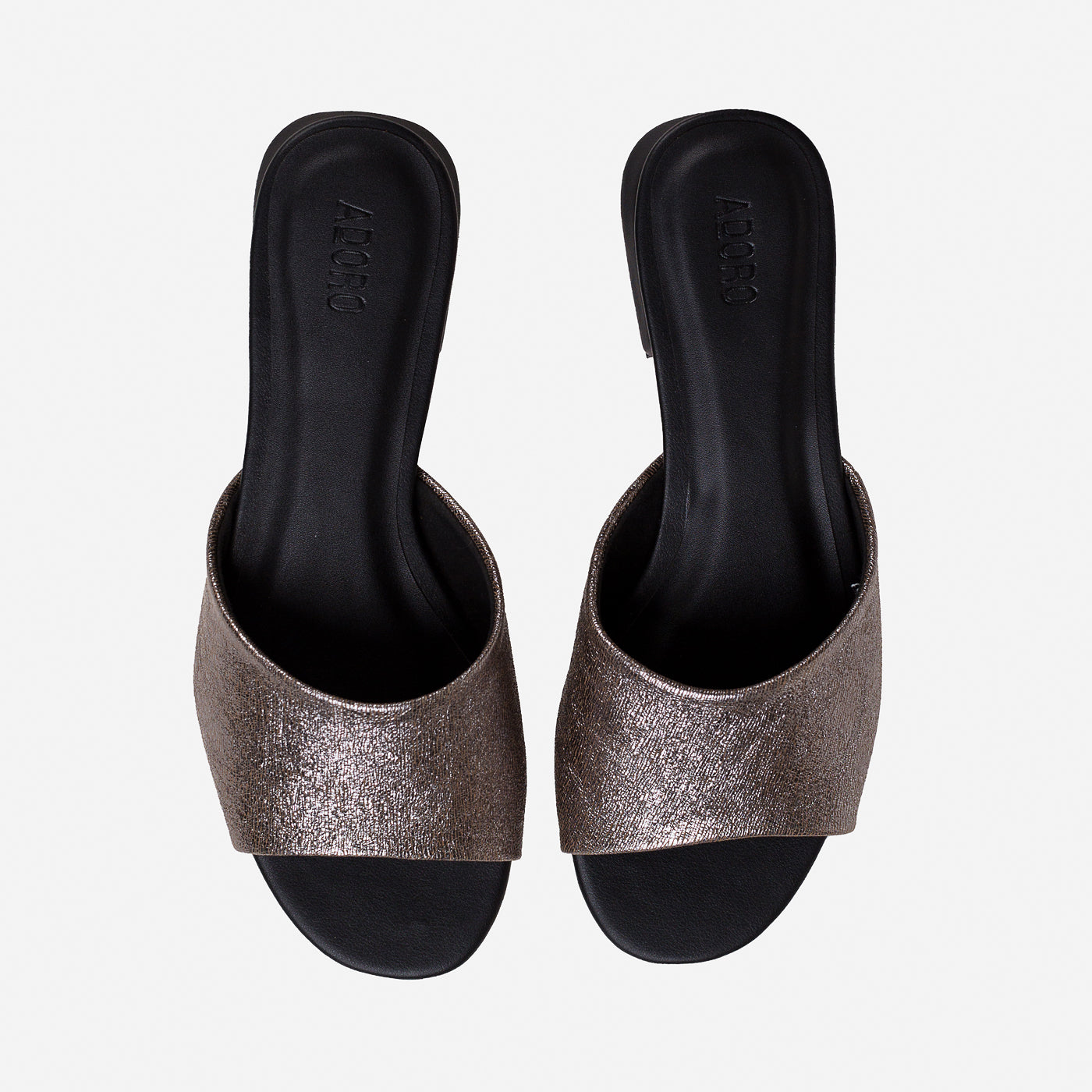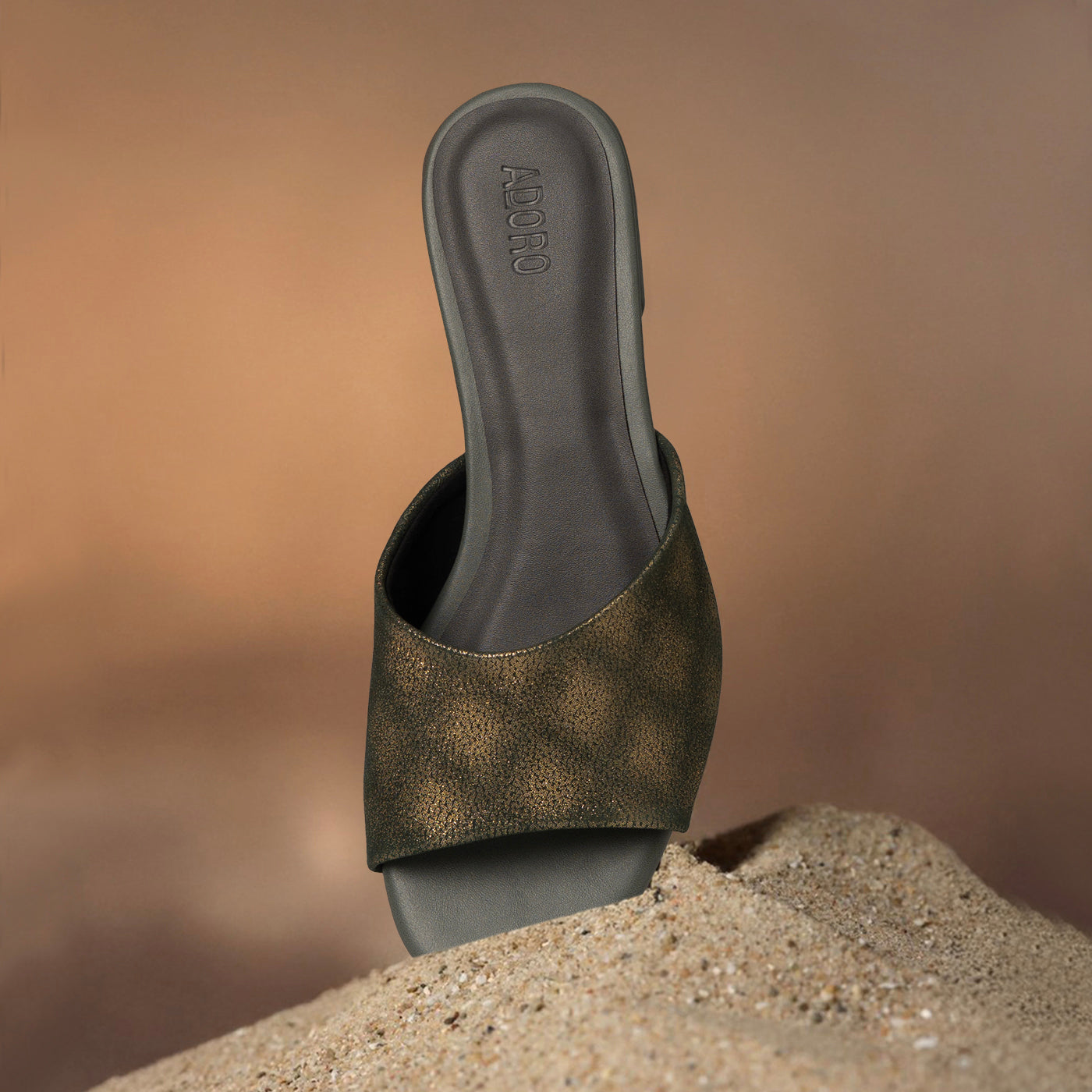 Shine with understated elegance in Adoro’s "Dusk Shimmer" Slides. A shimmering synthetic upper and open round toe give these flats a polished, versatile look. Set on a sleek geometric heel and finished with a padded insole, they offer a stylish yet comfortable fit. From brunch dates to evening strolls, these slides are designed to keep you glowing all day.