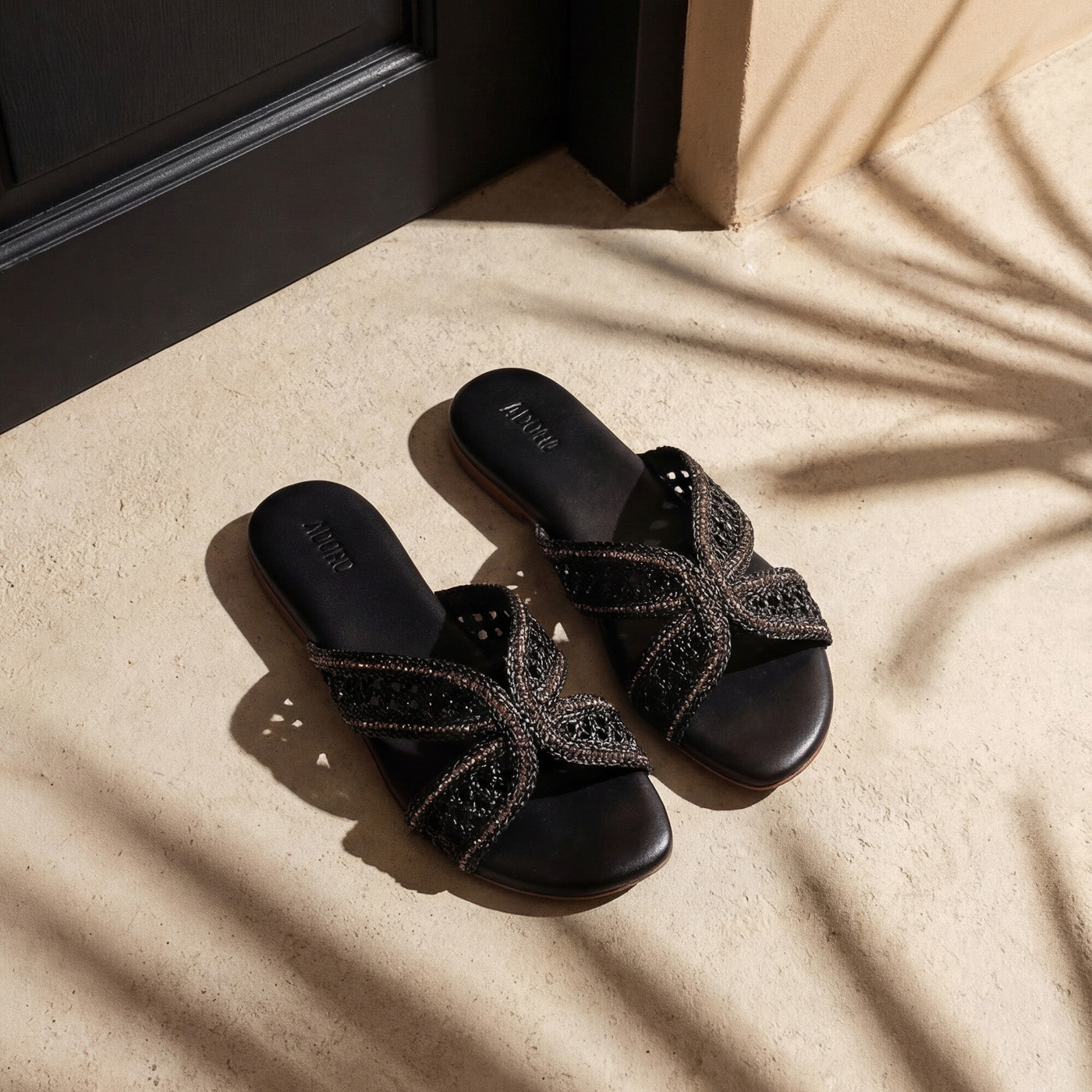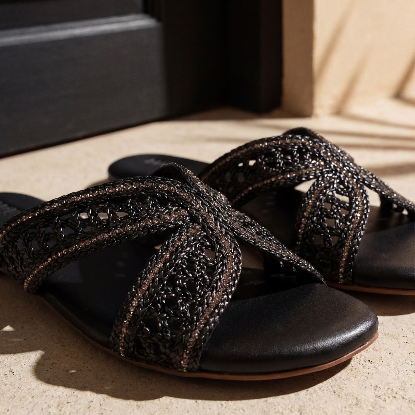 These elegant slides feature intricate crystal embellished straps in a sophisticated crossover design. The black beaded detailing creates subtle sparkle that elevates casual wear, while the smooth leather footbed ensures all day comfort. The flat silhouette offers easy wearability with a touch of luxury. Perfect for relaxed outings, brunch gatherings, and casual events where comfort meets refined style.