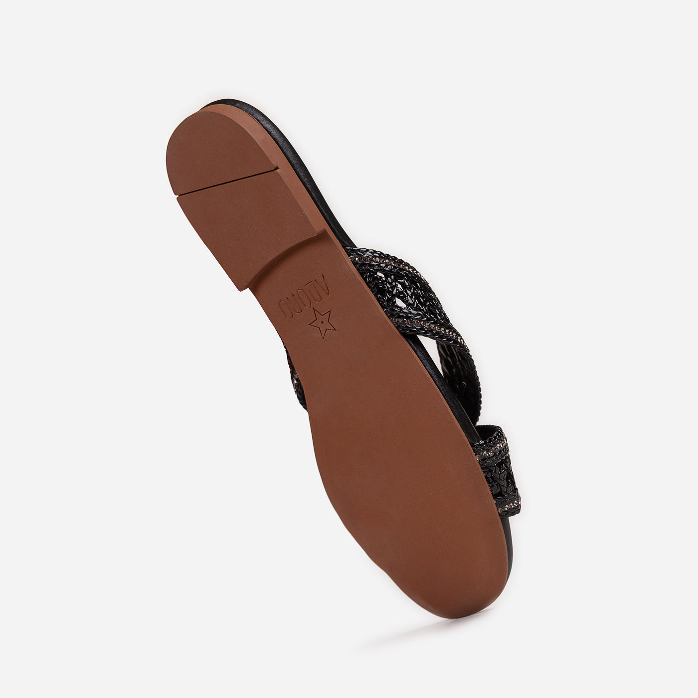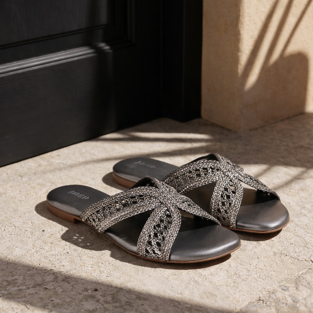 Stylish and easygoing, these flat sandals feature intricately woven metallic straps that cross elegantly over the foot, adding texture and subtle shine to an everyday silhouette. Designed for comfort and versatility, they offer a relaxed fit with a modern finish perfect for effortless day to evening wear.