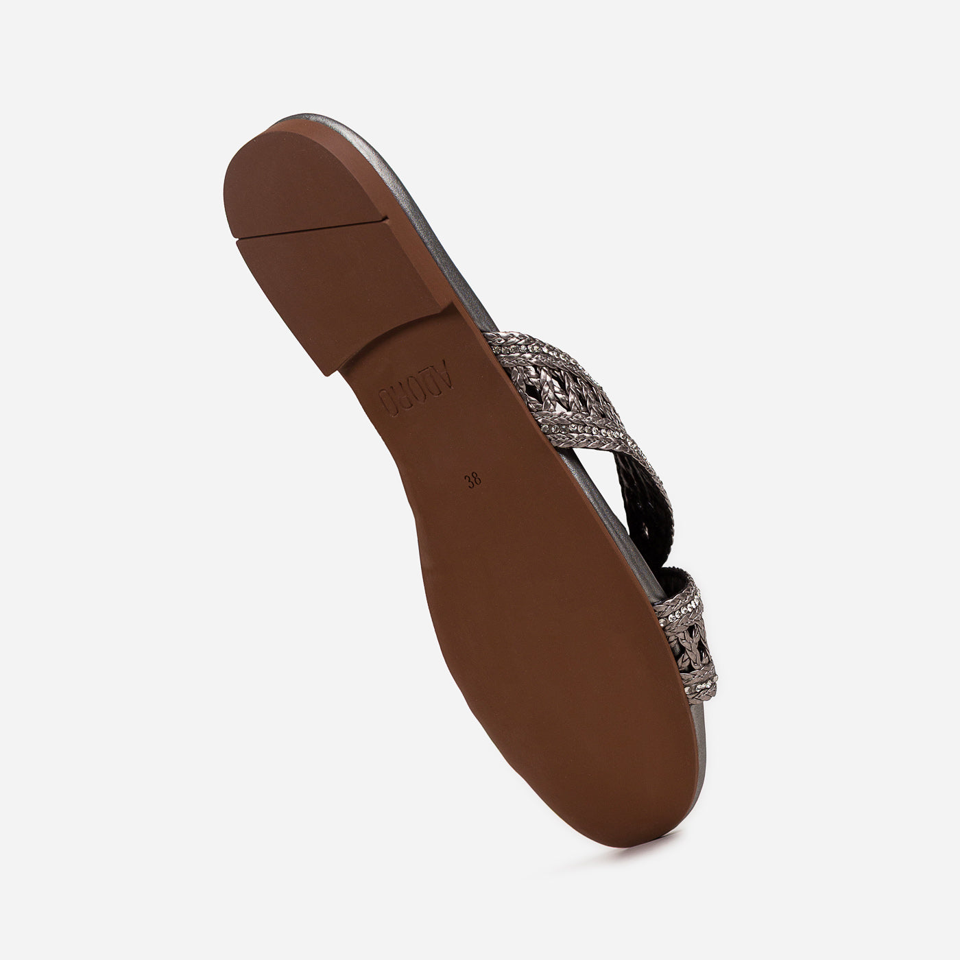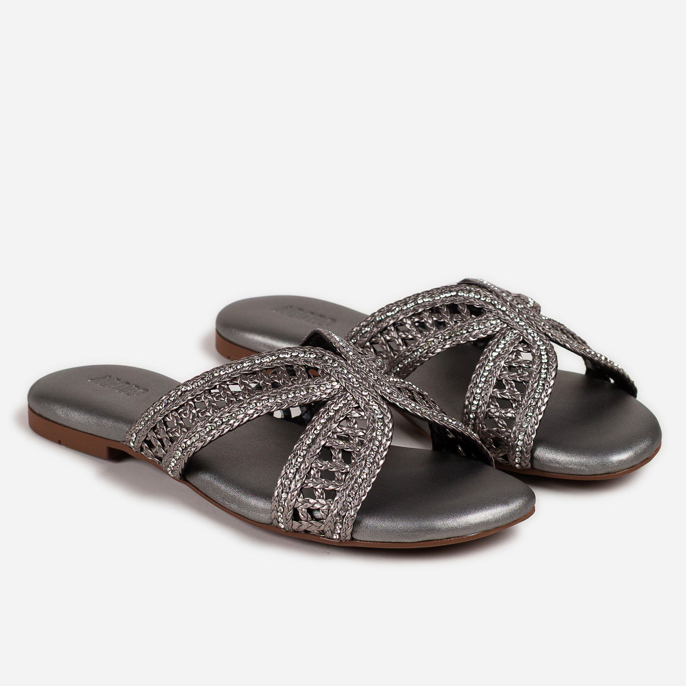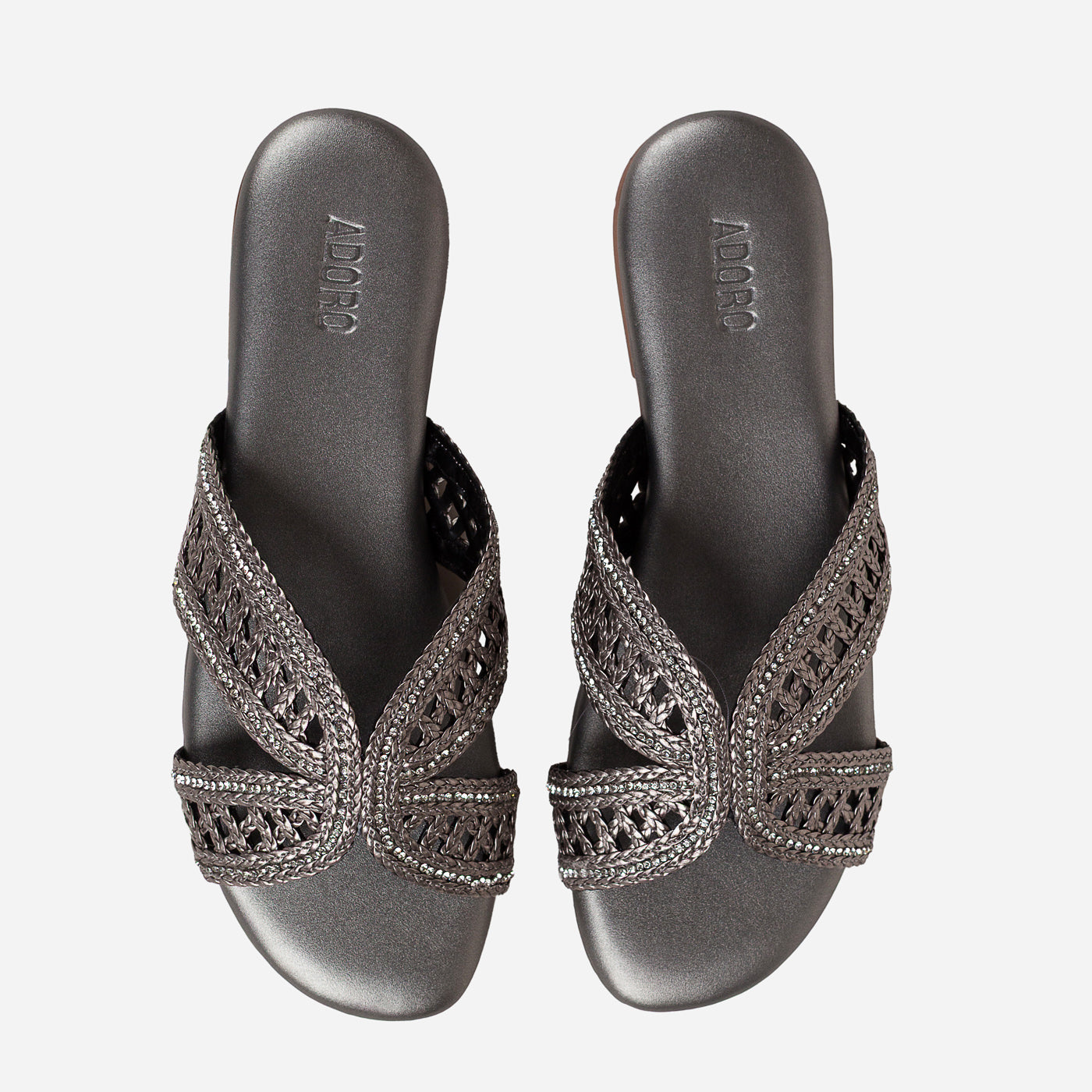 These chic slides showcase delicate grey crystal adorned straps in an elegant crossover pattern. The neutral metallic tones create versatile appeal, while the beaded texture adds dimensional interest. The cushioned footbed and flat sole provide comfortable wear for extended periods. Ideal for daytime events, casual meetings, and weekend activities that call for polished simplicity.