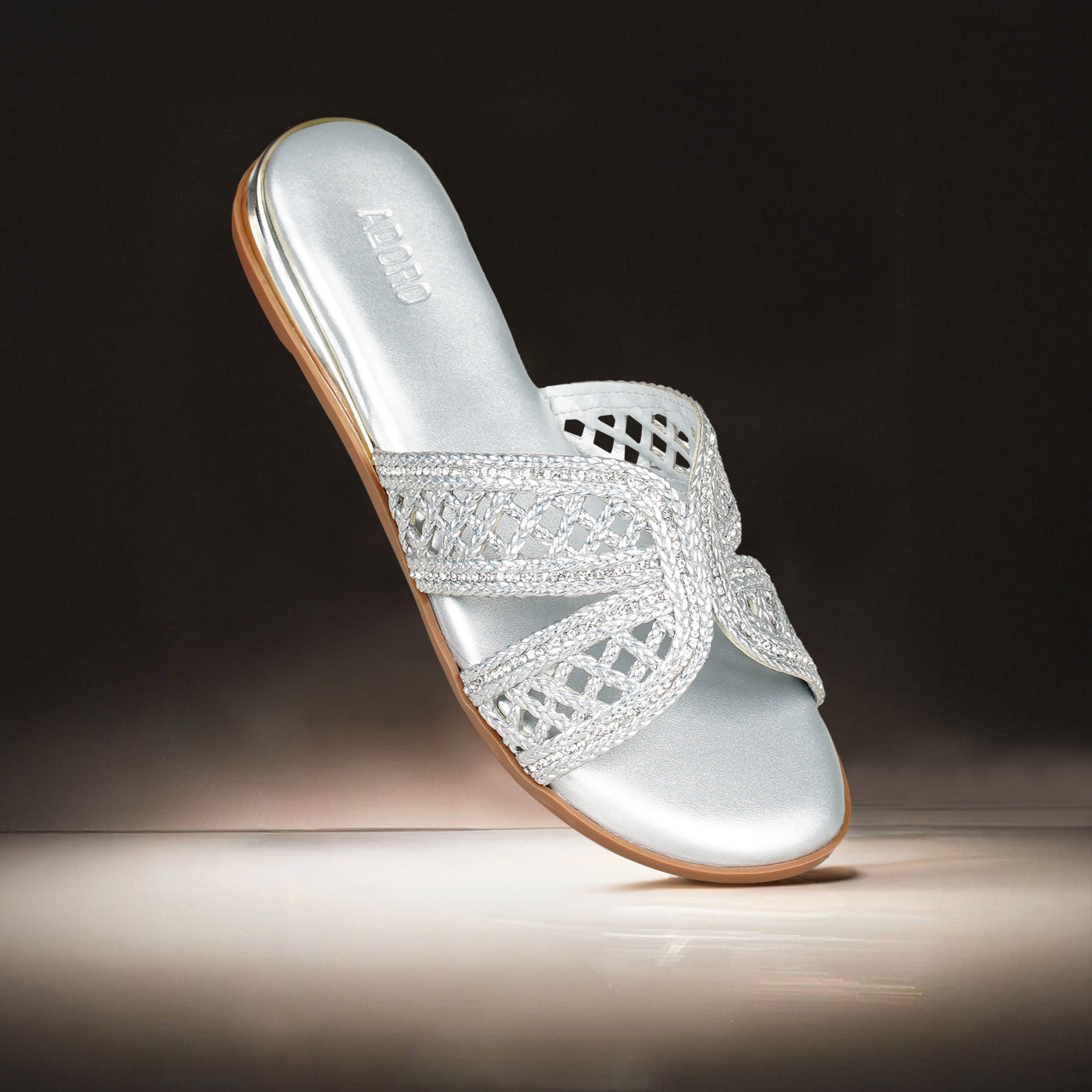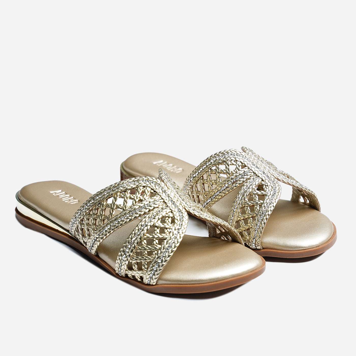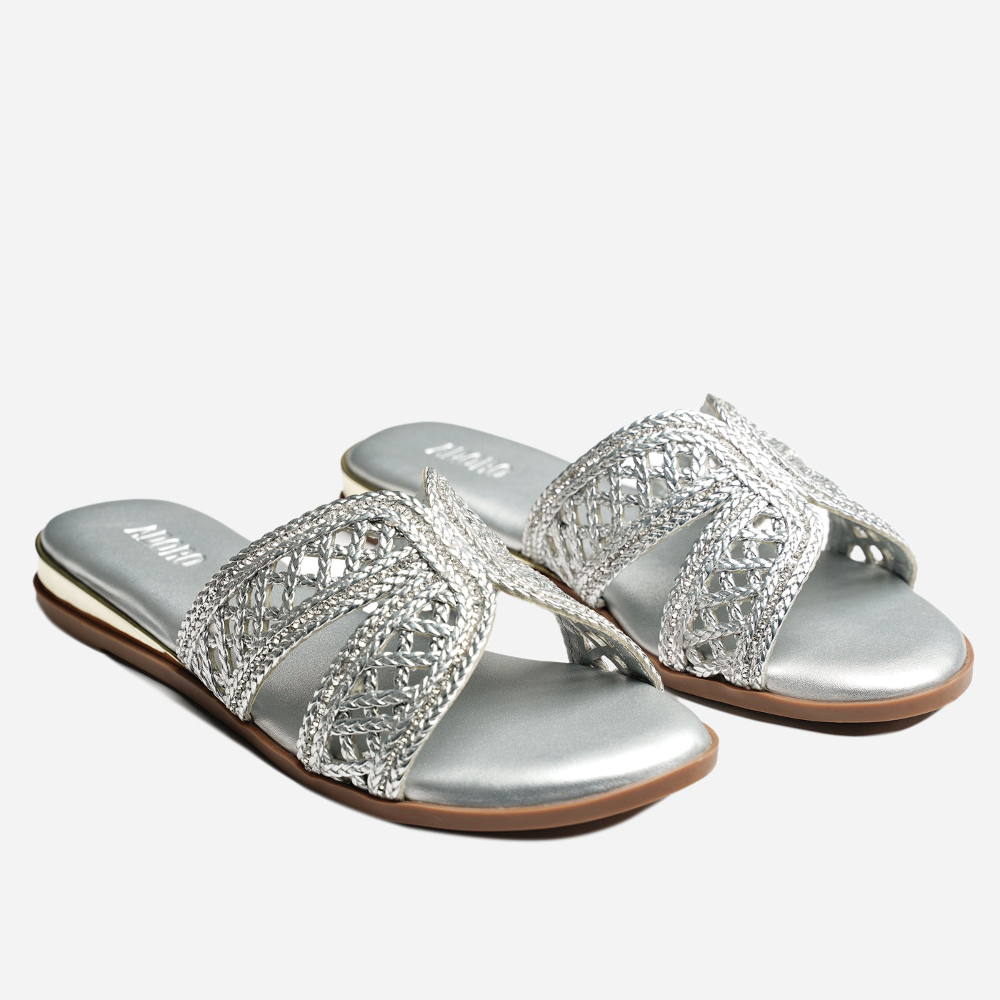 Luxurious sparkle in an intricately woven silhouette. This piece features metallic braided straps in crisscross design, creating dazzling dimensional texture and artisanal appeal. The slip-on design offers effortless wear, while the cushioned footbed ensures all-day comfort. Flat sole provides easy walkability.