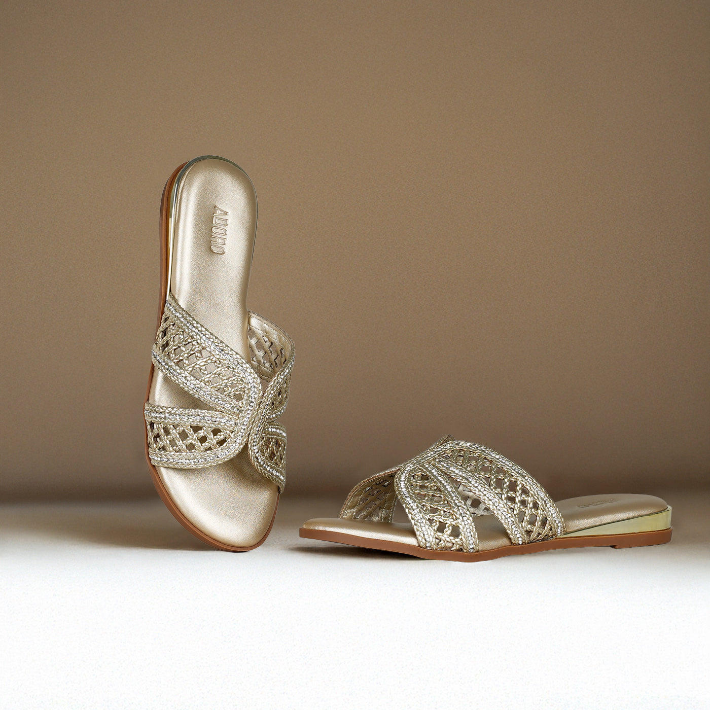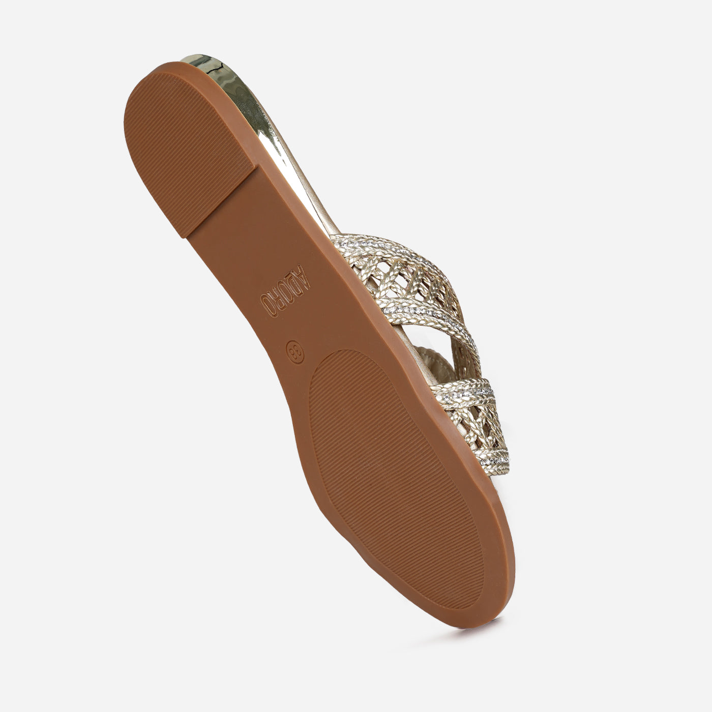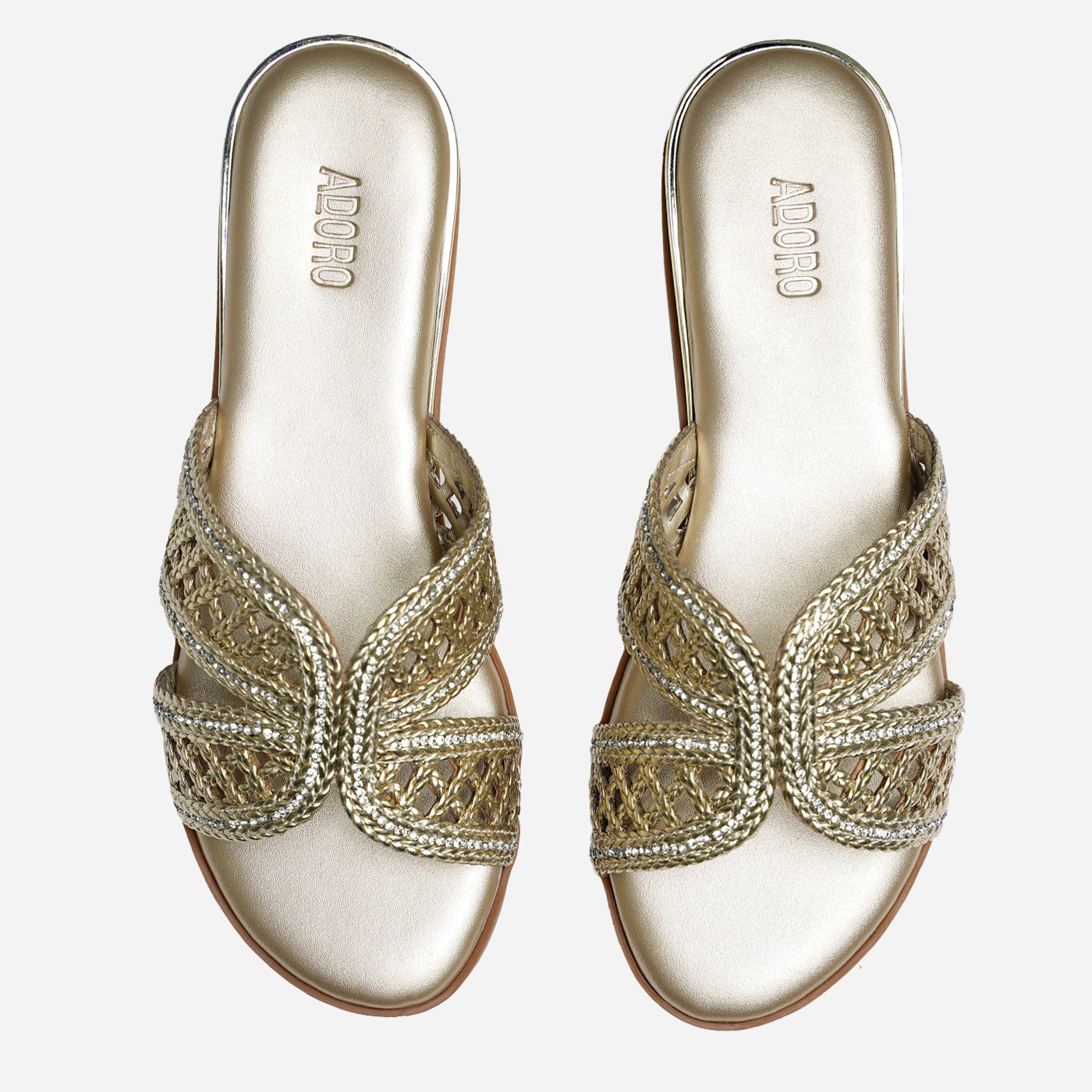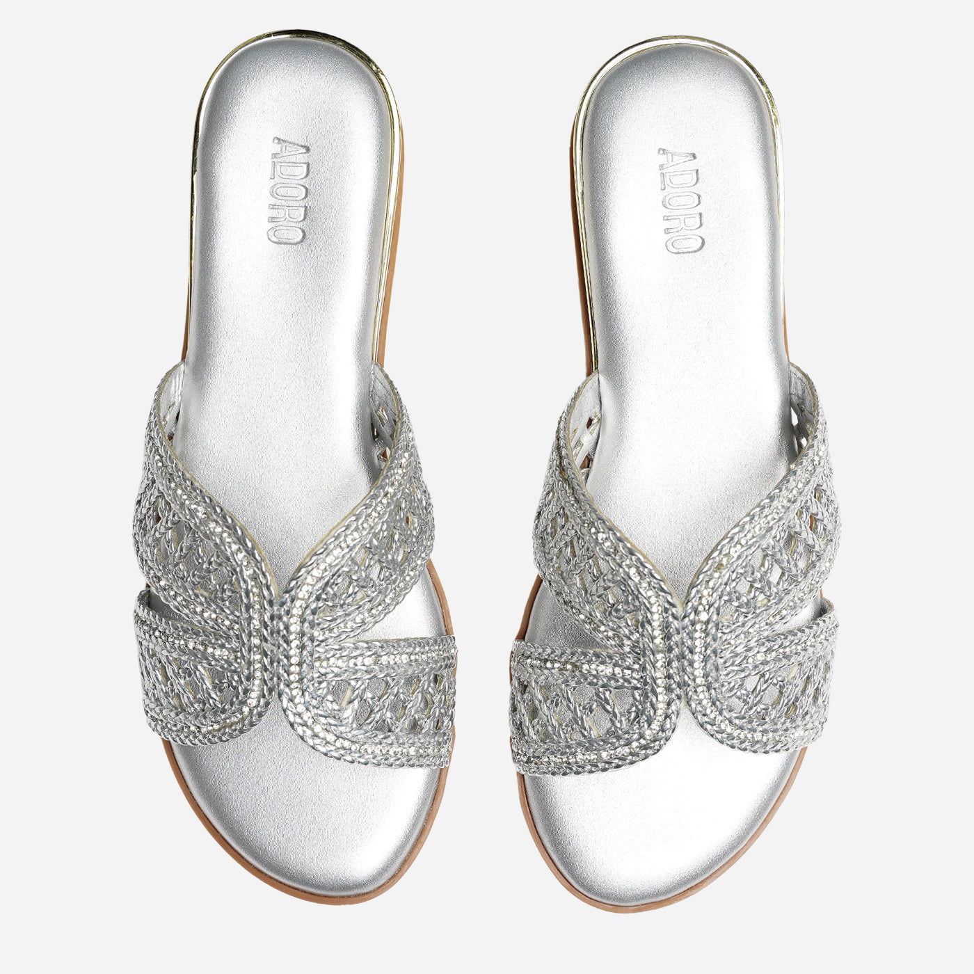 Luxurious sparkle in an intricately woven silhouette. This piece features metallic braided straps in crisscross design, creating dazzling dimensional texture and artisanal appeal. The slip-on design offers effortless wear, while the cushioned footbed ensures all-day comfort. Flat sole provides easy walkability.