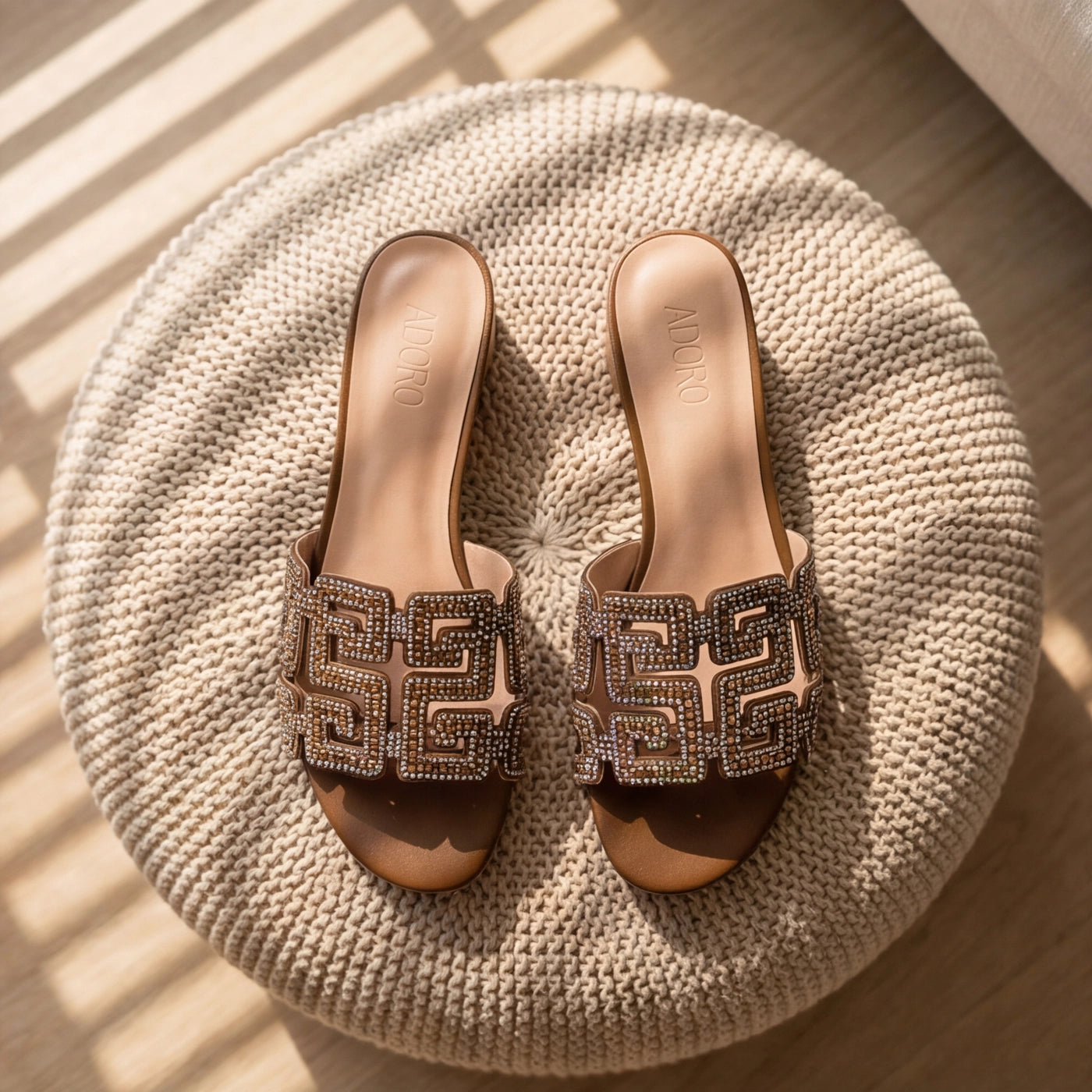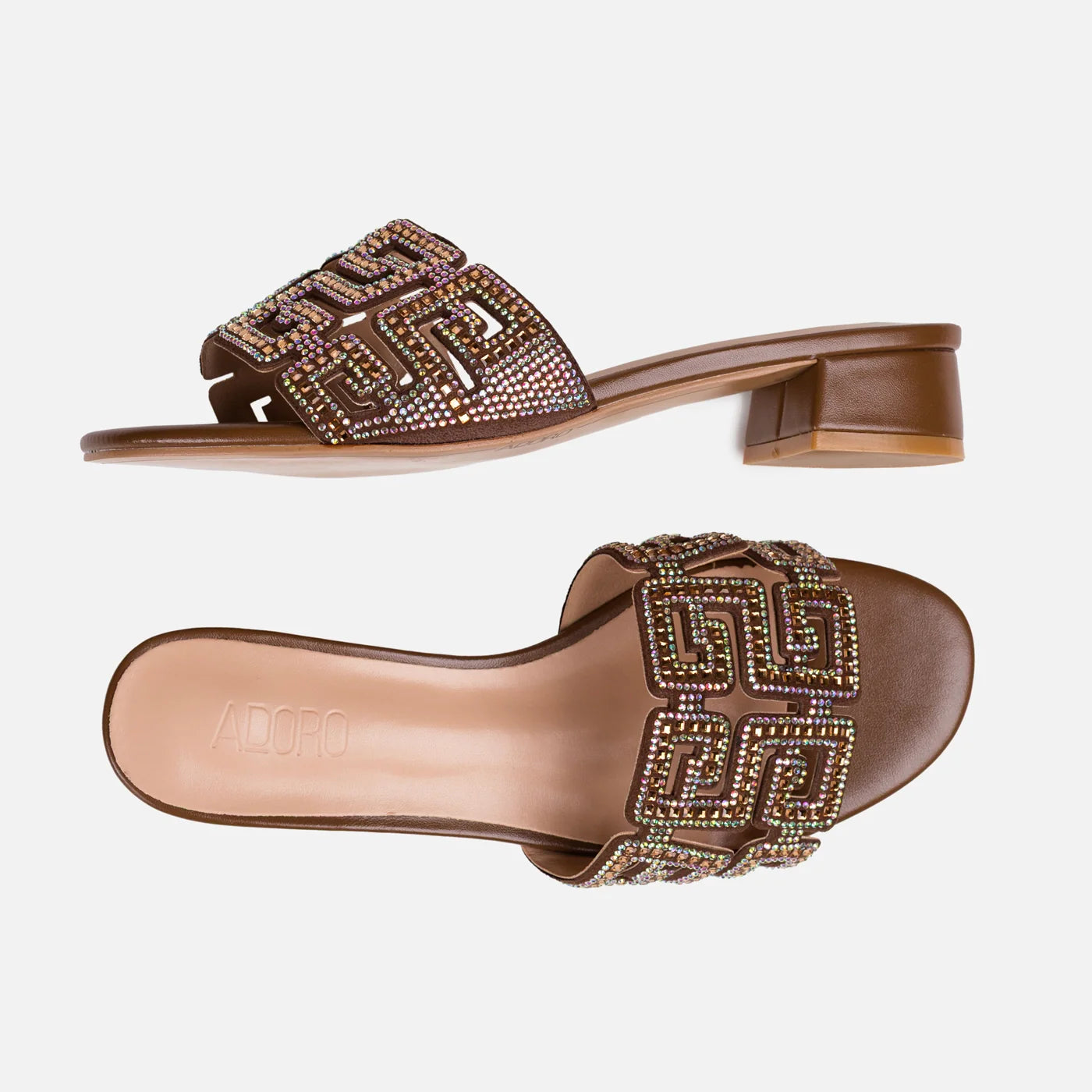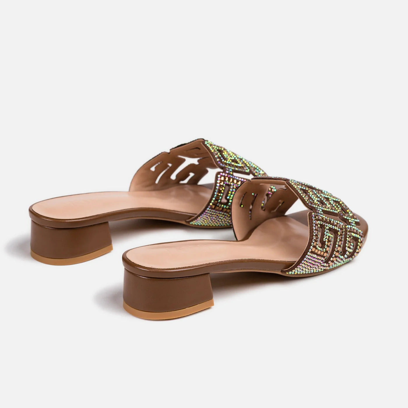 - Design: Slip-on silhouette with intricate geometric detail and low block heel