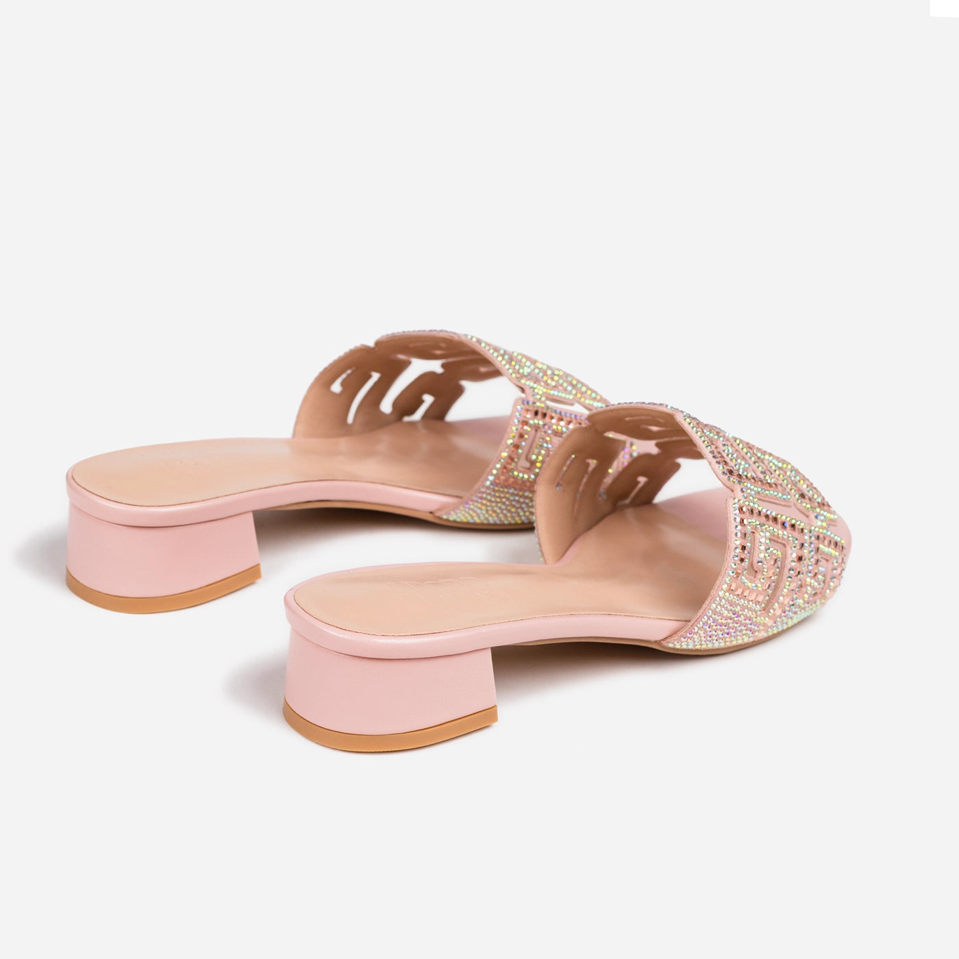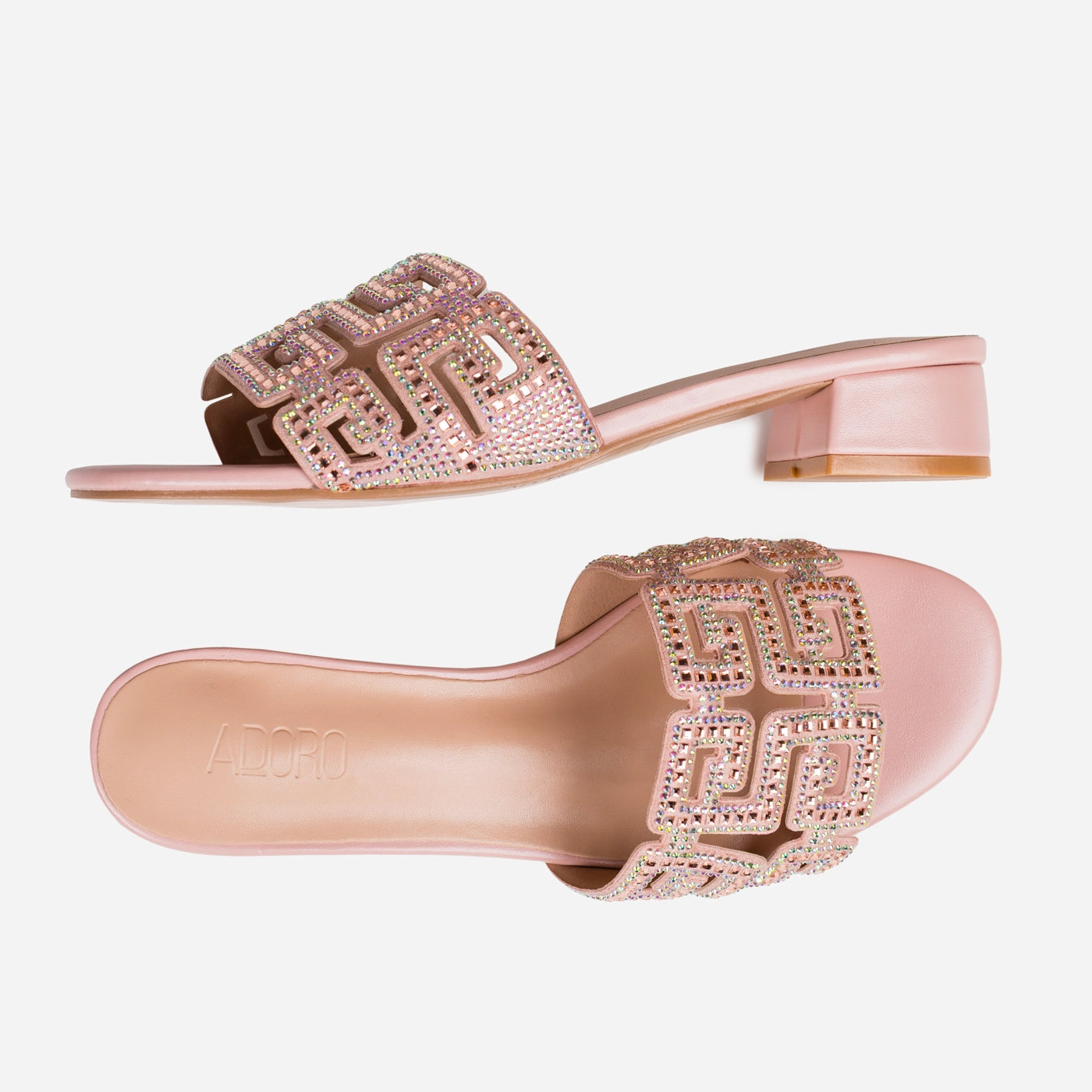 Luxurious glamour in a sophisticated block heel silhouette. This piece features intricate crystal-embellished geometric pattern creating dazzling dimensional sparkle and modern artistic appeal. The slip-on design offers effortless wear, while the cushioned footbed ensures all-day comfort. Low block heel provides subtle elevation with stability.