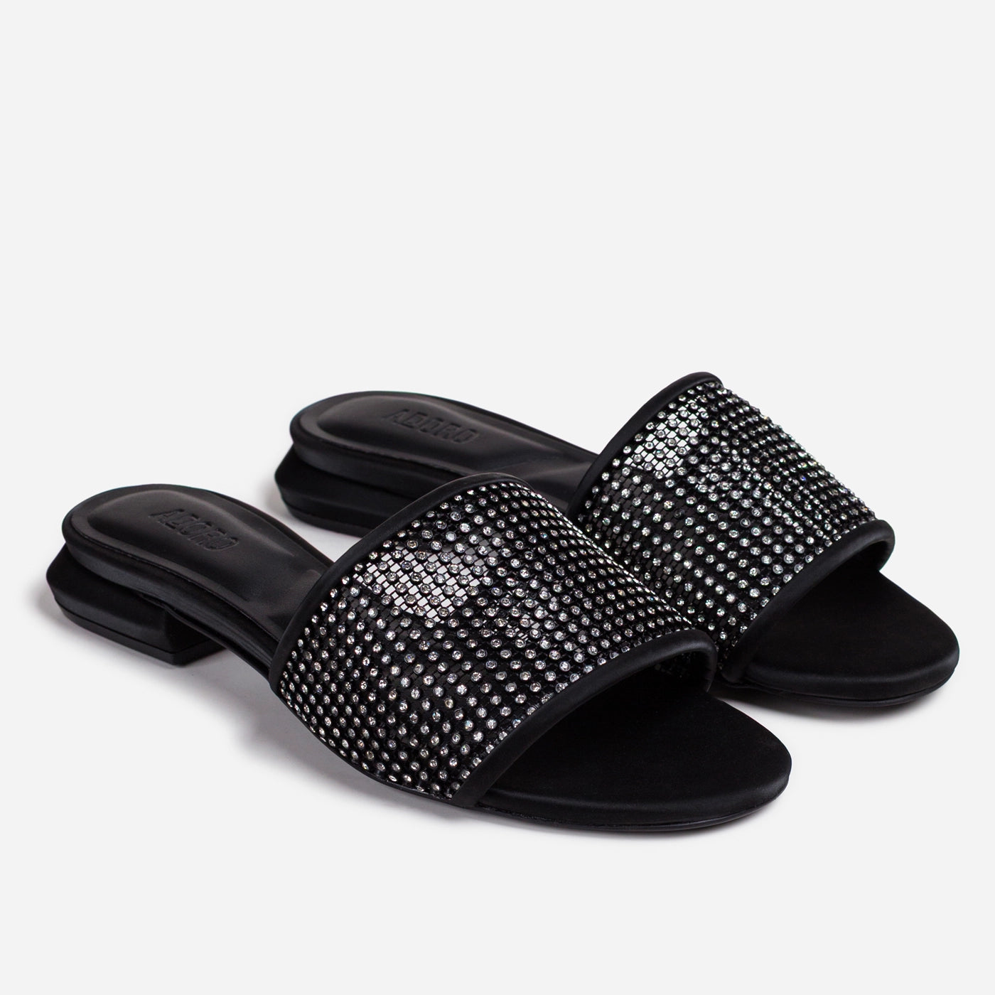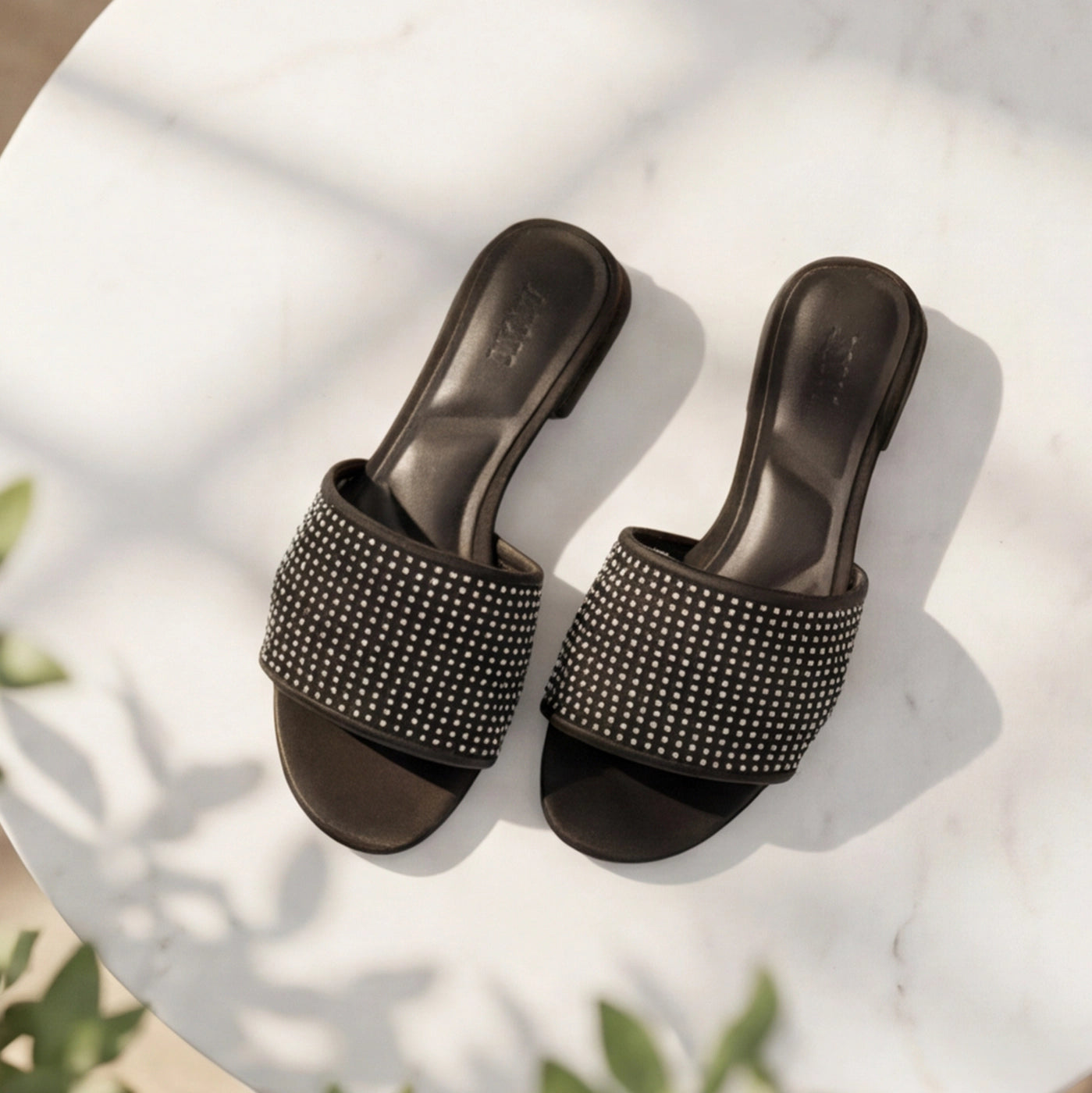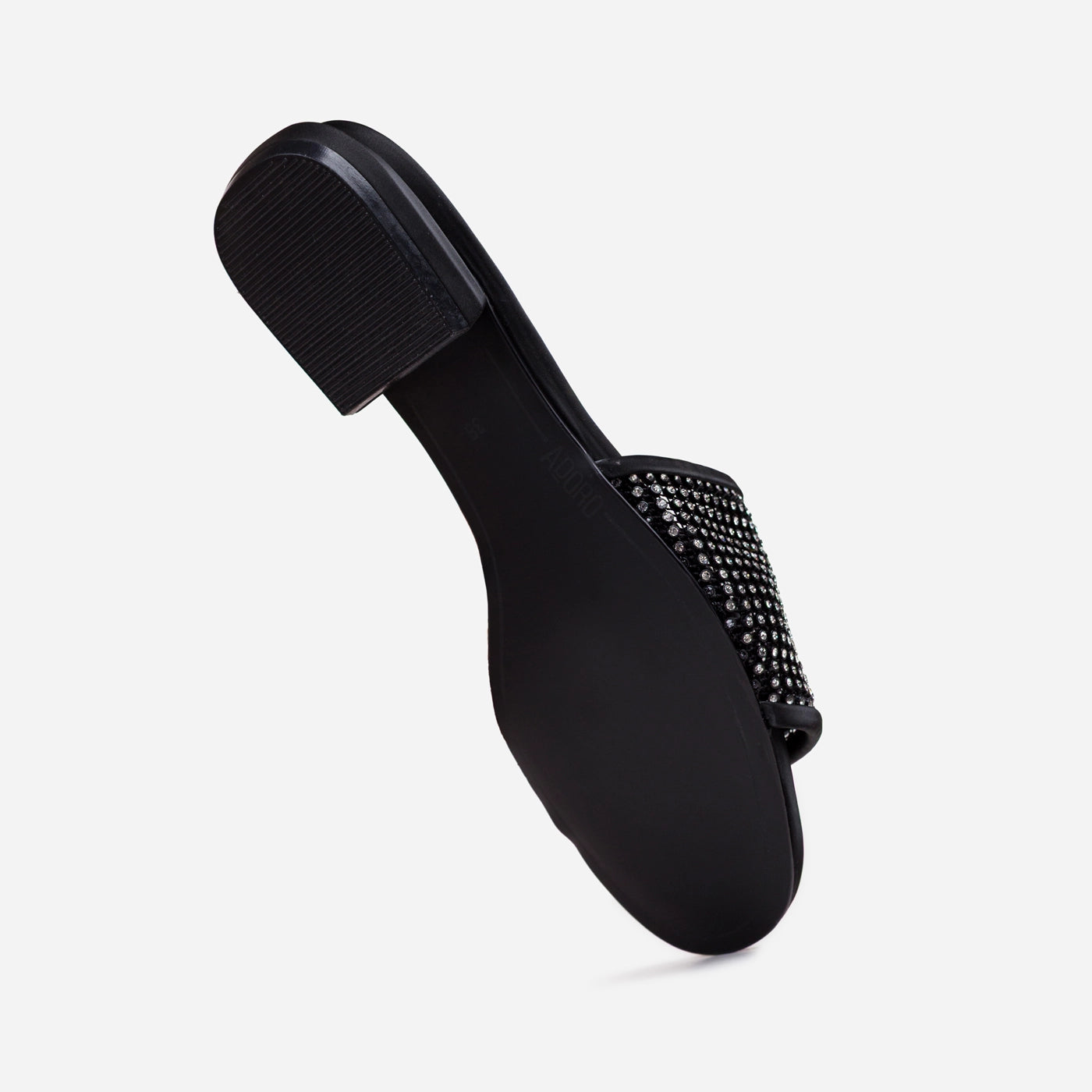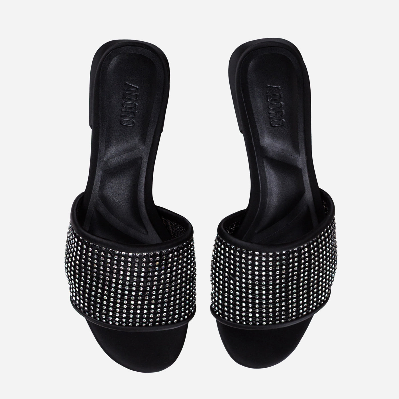 Luxurious sparkle in a sleek slide silhouette. These flat sandals feature a wide strap adorned with intricate crystal embellishments in gradient pattern, creating dazzling dimensional sparkle. The slip-on design offers effortless wear, while the cushioned footbed ensures all-day comfort. Low block heel provides subtle elevation with stability.