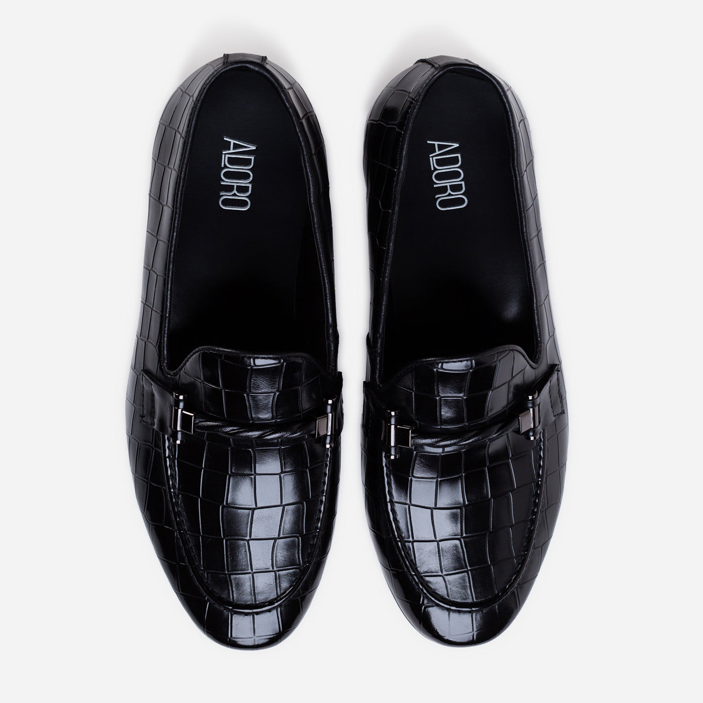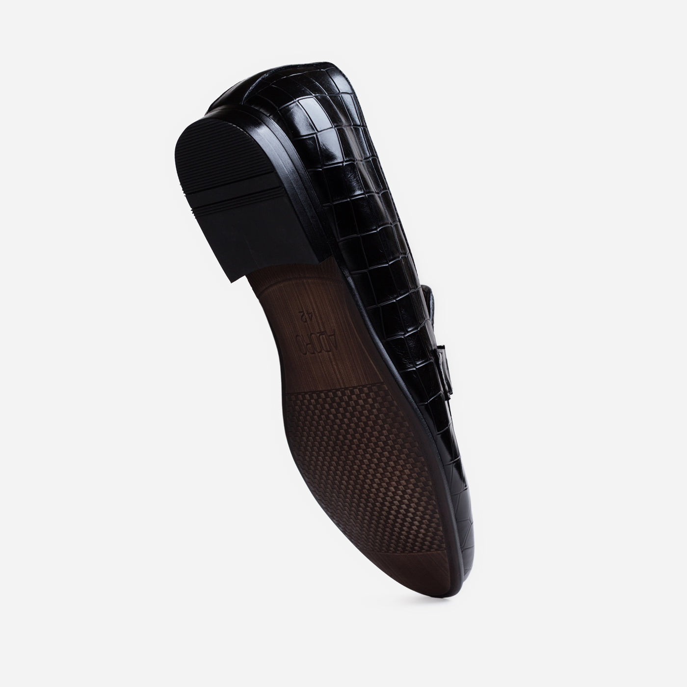 Presenting our Men's Partywear Loafer, the epitome of style and sophistication. Crafted with meticulous detail, this footwear enhances your party ensemble with premium cow leather featuring an exquisite crocodile texture. The twisted saddle on the plug adds a sense of artistry and uniqueness, highlighting the craftsmanship. Available in classic black and tan, with the tan variant featuring a sophisticated two-tone finish, adding an extra layer of depth and refinement.
