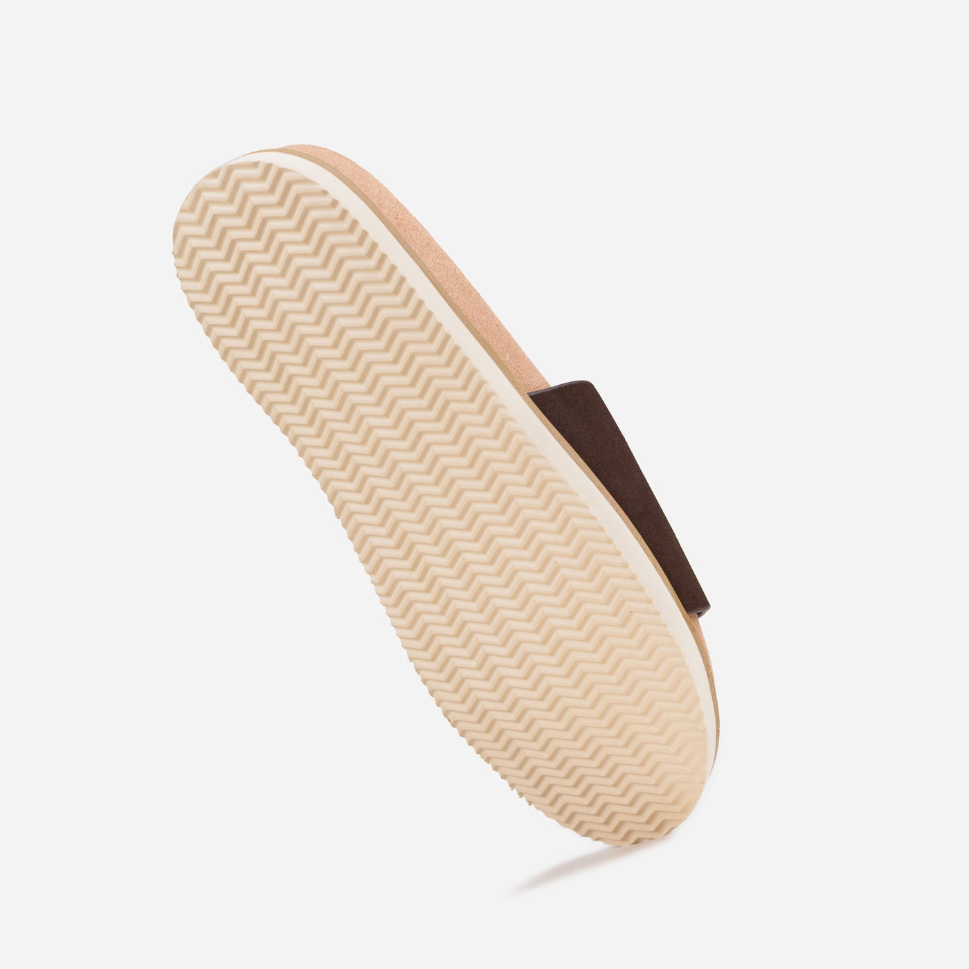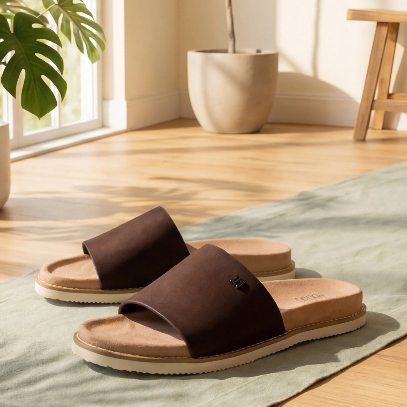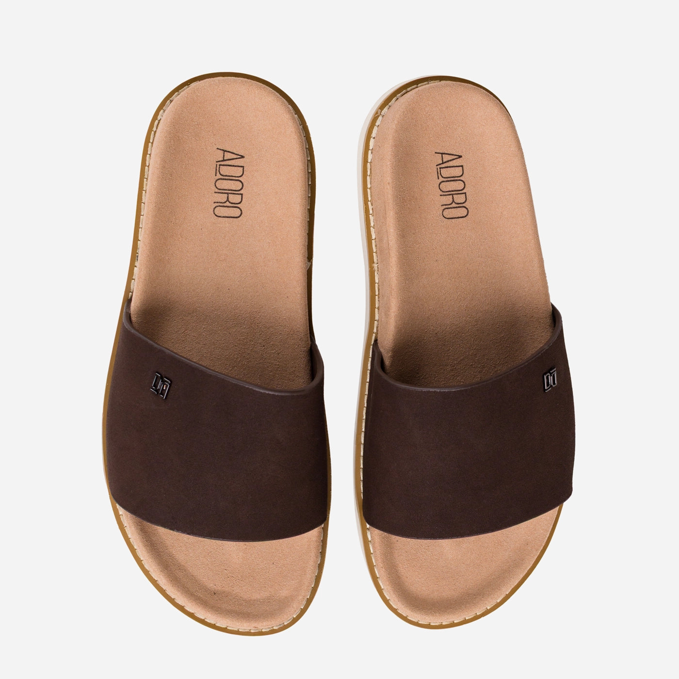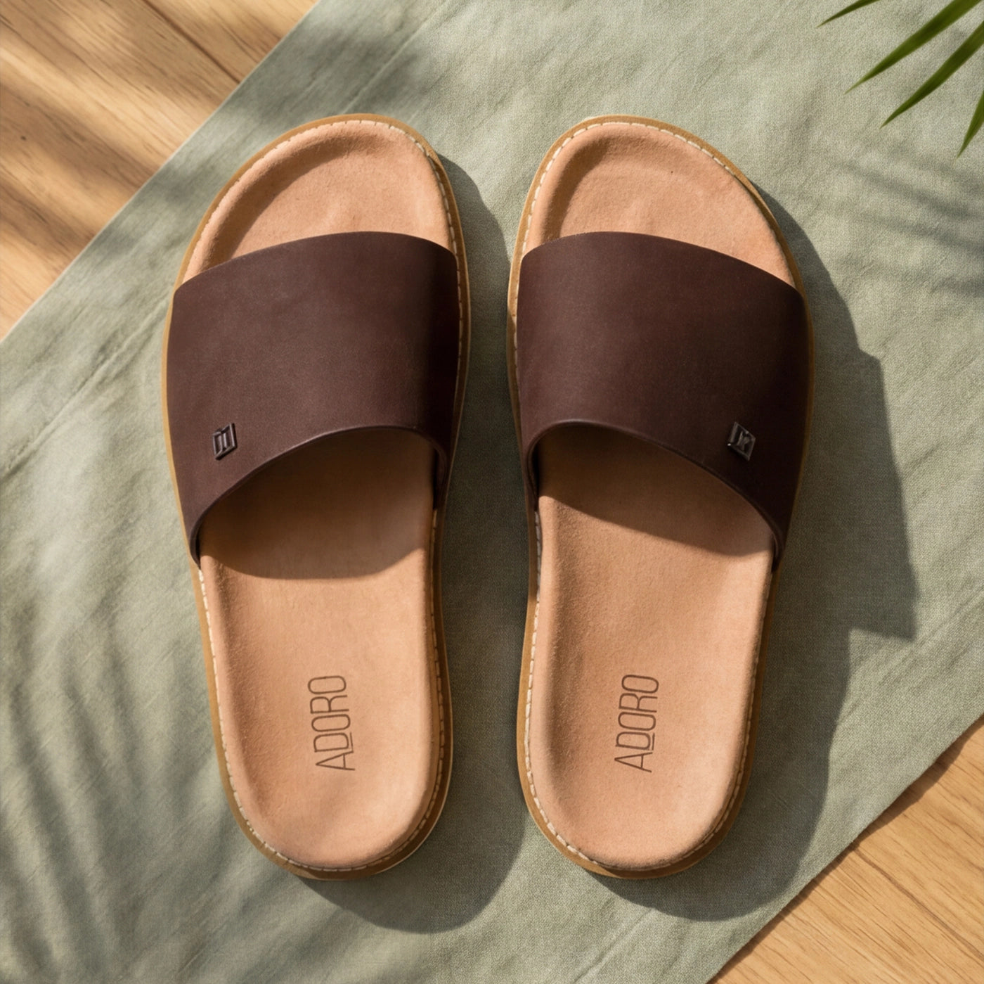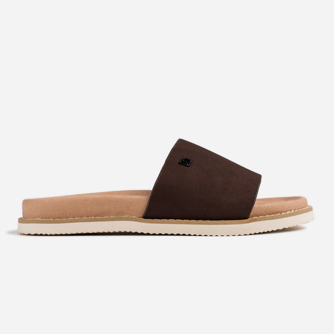 These elegant slides feature a wide chocolate brown leather strap with clean, simple lines. The smooth leather construction creates a refined look, while the cushioned footbed ensures all day comfort. Subtle logo detailing and contrast stitching add quality touches. Perfect for casual wear, relaxed weekends, and everyday moments that call for effortless style with superior comfort.