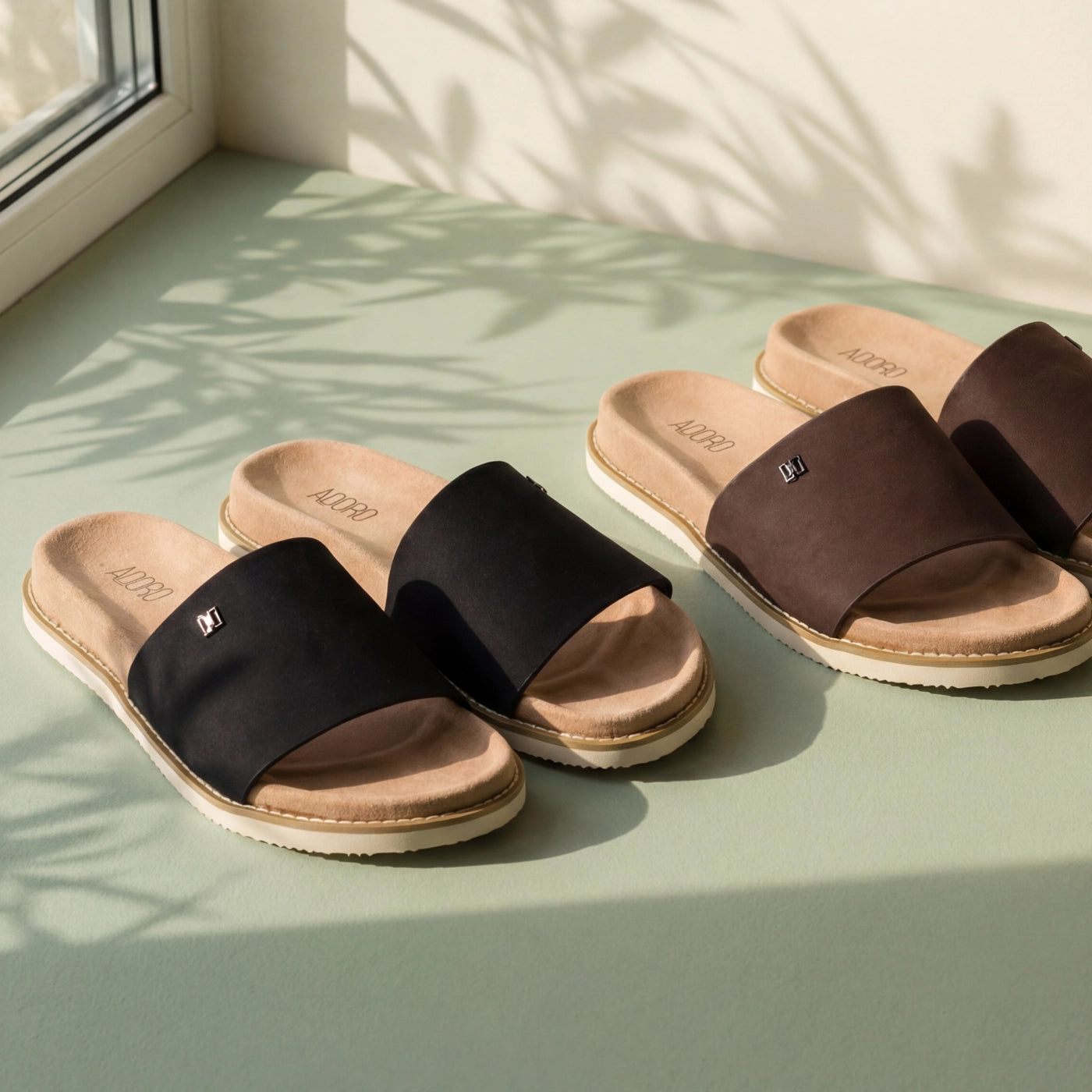 This versatile slide collection features two timeless shades deep black and warm chocolate brown. Each pair showcases a wide single leather strap with clean lines and cushioned footbeds for superior comfort. The minimalist aesthetic with subtle branding maintains refined appeal. Perfect for building a foundational summer wardrobe with comfortable, stylish footwear that transitions effortlessly across casual settings.
