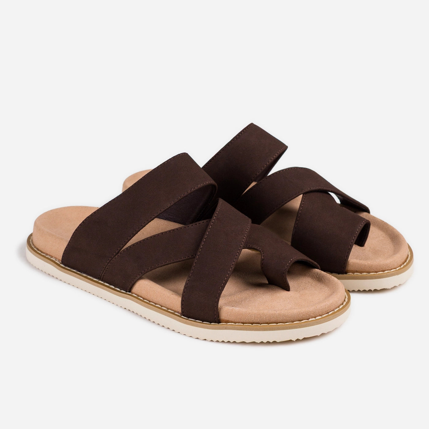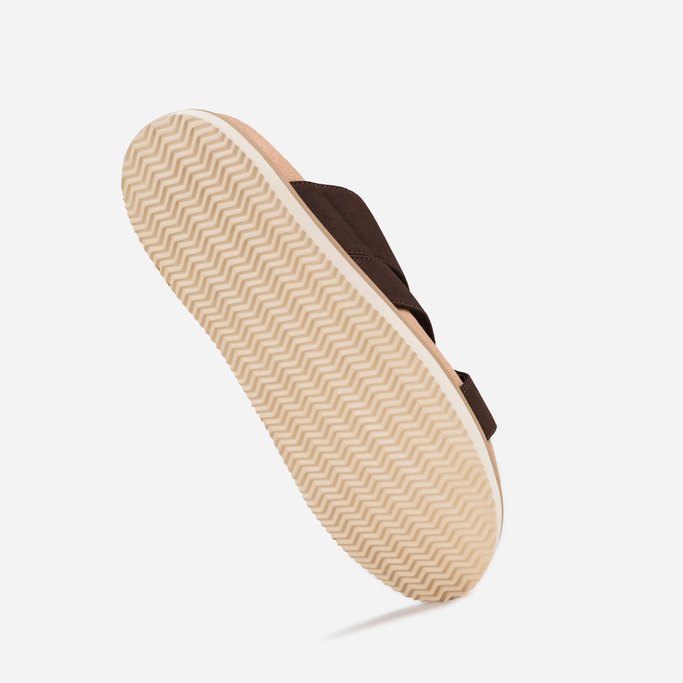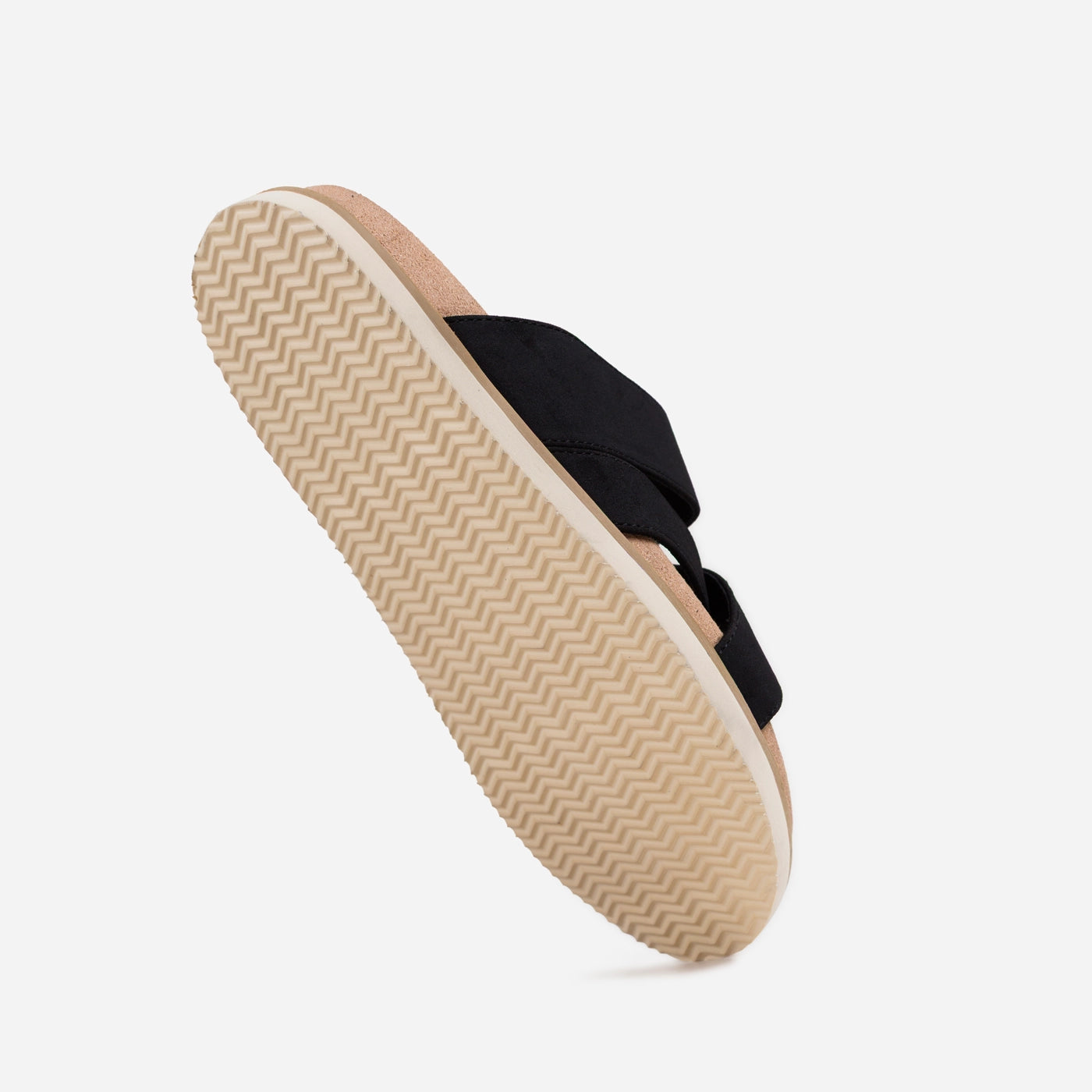 Effortless elegance meets modern design in these premium crossover slide sandals. Featuring intersecting wide straps in luxe faux suede, they create a sophisticated silhouette with architectural appeal. The cushioned tan footbed offers superior comfort, while the contrast stitching and lightweight sole add refined finishing touches to this contemporary essential.
