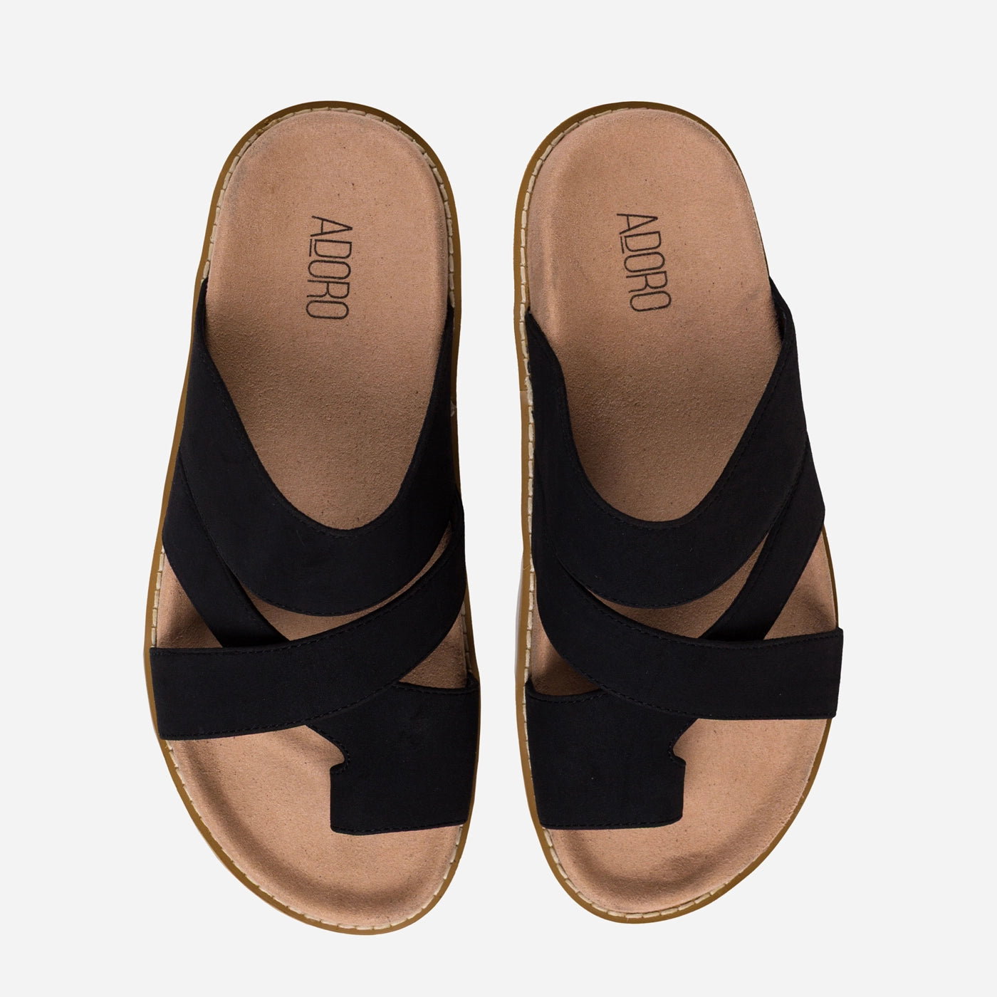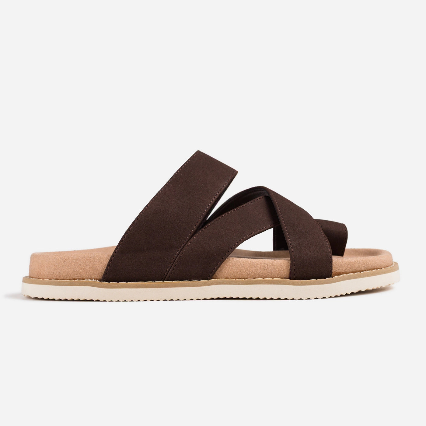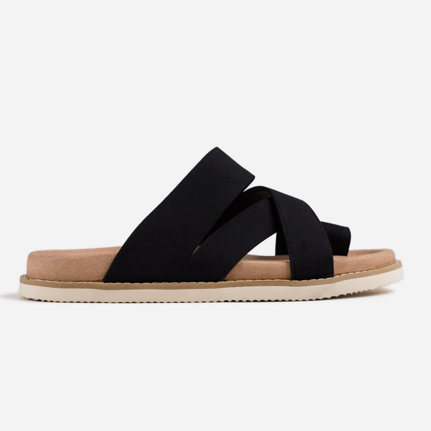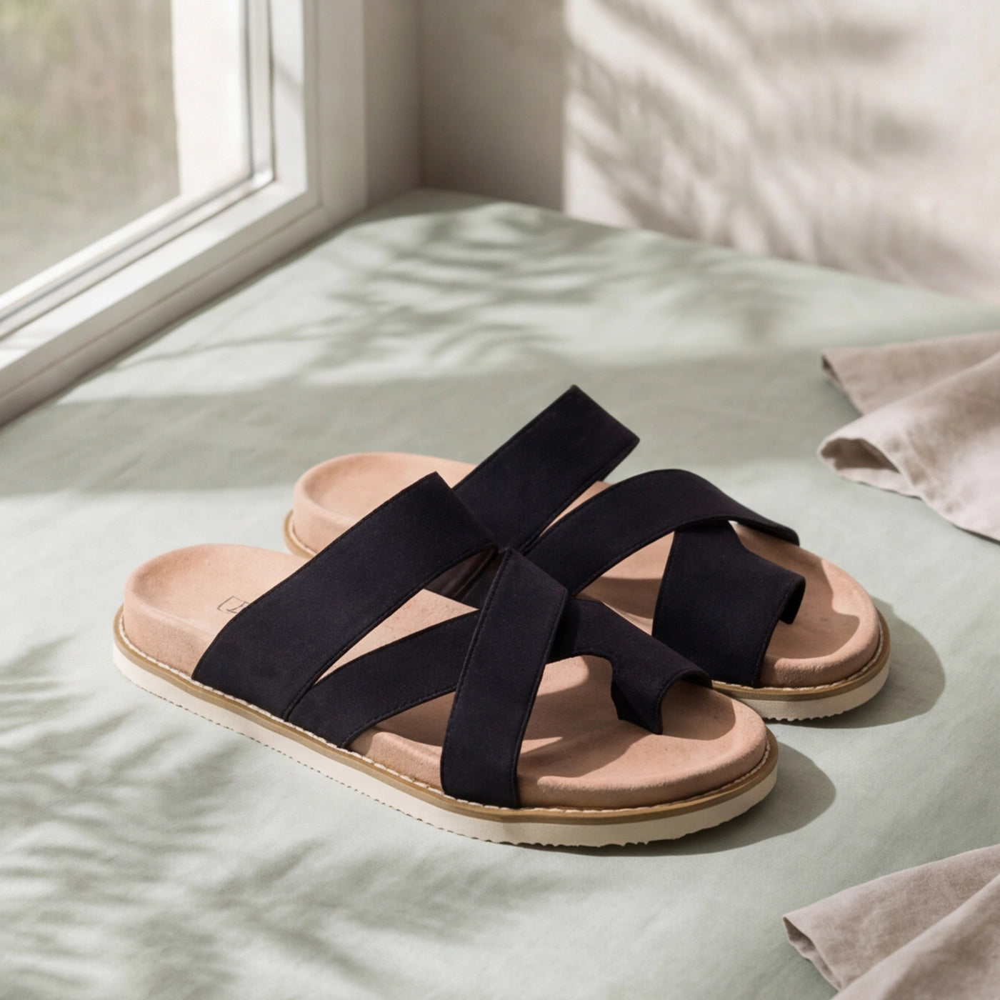 Effortless elegance meets modern design in these premium crossover slide sandals. Featuring intersecting wide straps in luxe faux suede, they create a sophisticated silhouette with architectural appeal. The cushioned tan footbed offers superior comfort, while the contrast stitching and lightweight sole add refined finishing touches to this contemporary essential.