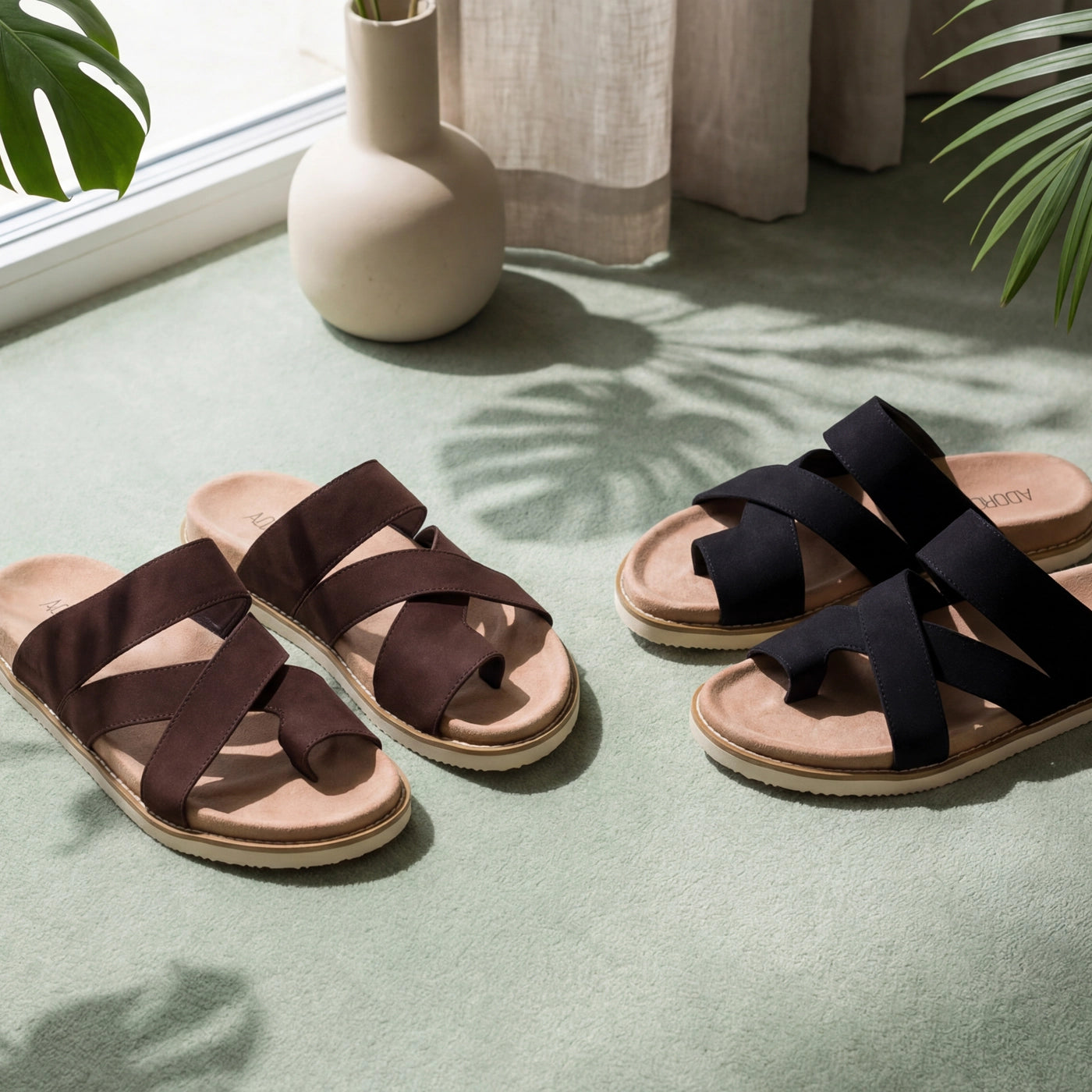 This essential slide collection features two timeless shades deep black and warm chocolate brown. Each pair showcases wide asymmetric leather straps with a contemporary crossover design and cushioned footbeds for superior comfort. The minimalist aesthetic with subtle branding maintains refined appeal. Perfect for building a versatile summer wardrobe with comfortable, stylish footwear that transitions effortlessly across casual settings.
