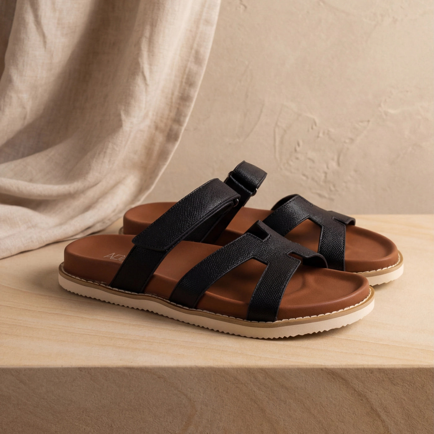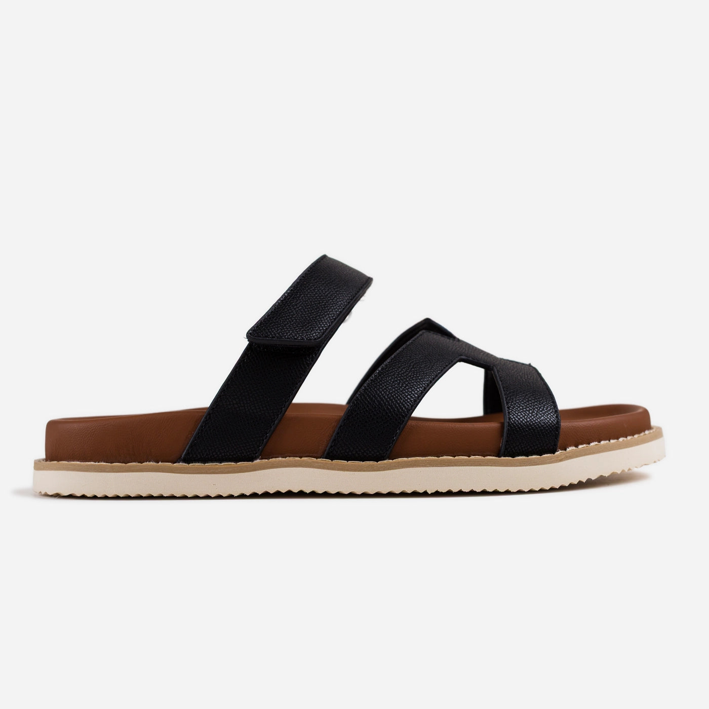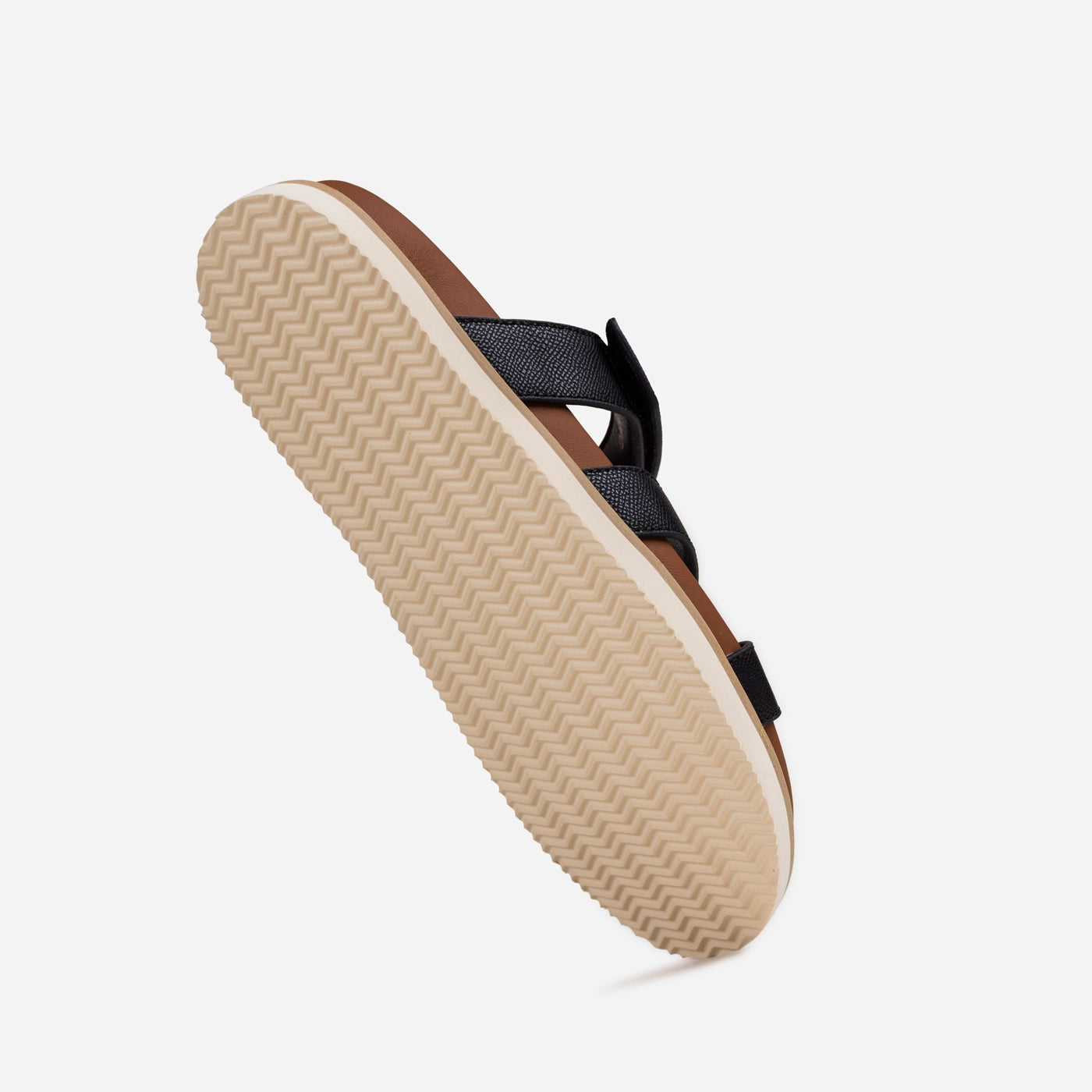 Designed for relaxed days with a touch of structure, these comfort strap slide sandals blend everyday ease with modern detailing. Featuring dual faux leather straps and an adjustable back strap for a secure fit, they rest on a cushioned footbed that supports all day comfort. The contrast sole adds a subtle style edge while keeping the look versatile and wearable.
