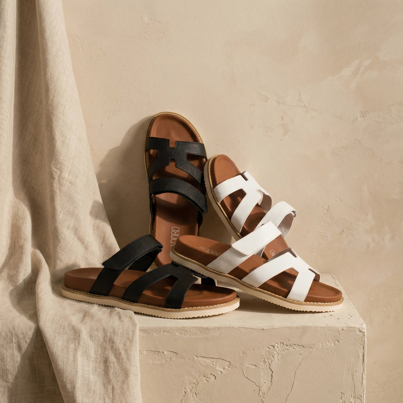 This essential sandal collection features two timeless colorways crisp white and deep black. Each pair showcases multiple adjustable straps with textured finish and contoured footbeds for superior comfort. The lightweight soles ensure easy wear throughout the day. Perfect for building a foundational summer wardrobe with comfortable, stylish footwear that transitions effortlessly between casual settings and relaxed occasions.