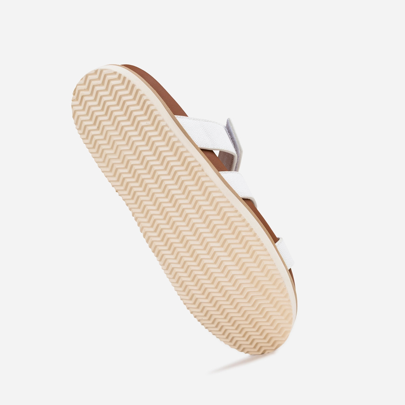These chic sandals showcase crisp white textured straps with an architectural H-inspired design. The multiple adjustable straps create secure fit and visual interest, while the warm tan footbed offers comfortable support. Gold tone logo detailing adds refined accents. Ideal for summer styling, casual gatherings, and versatile pairing with relaxed ensembles that demand fresh, clean aesthetics.