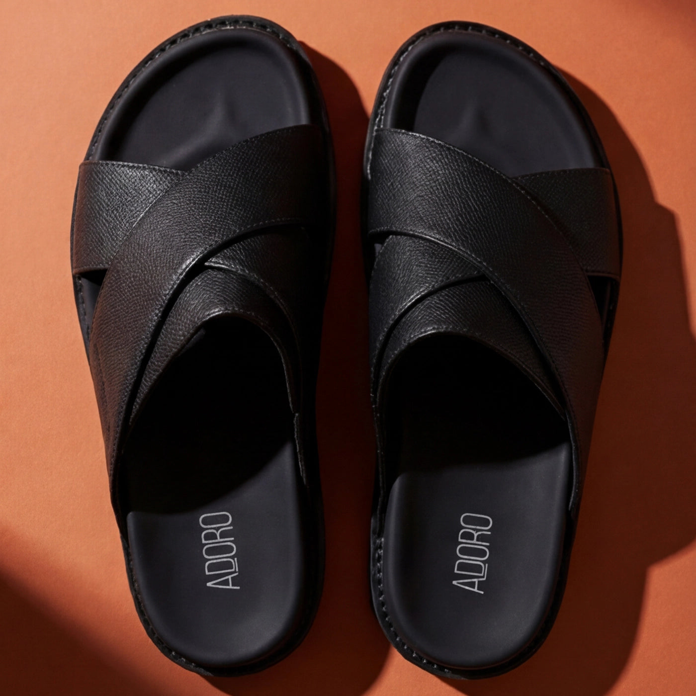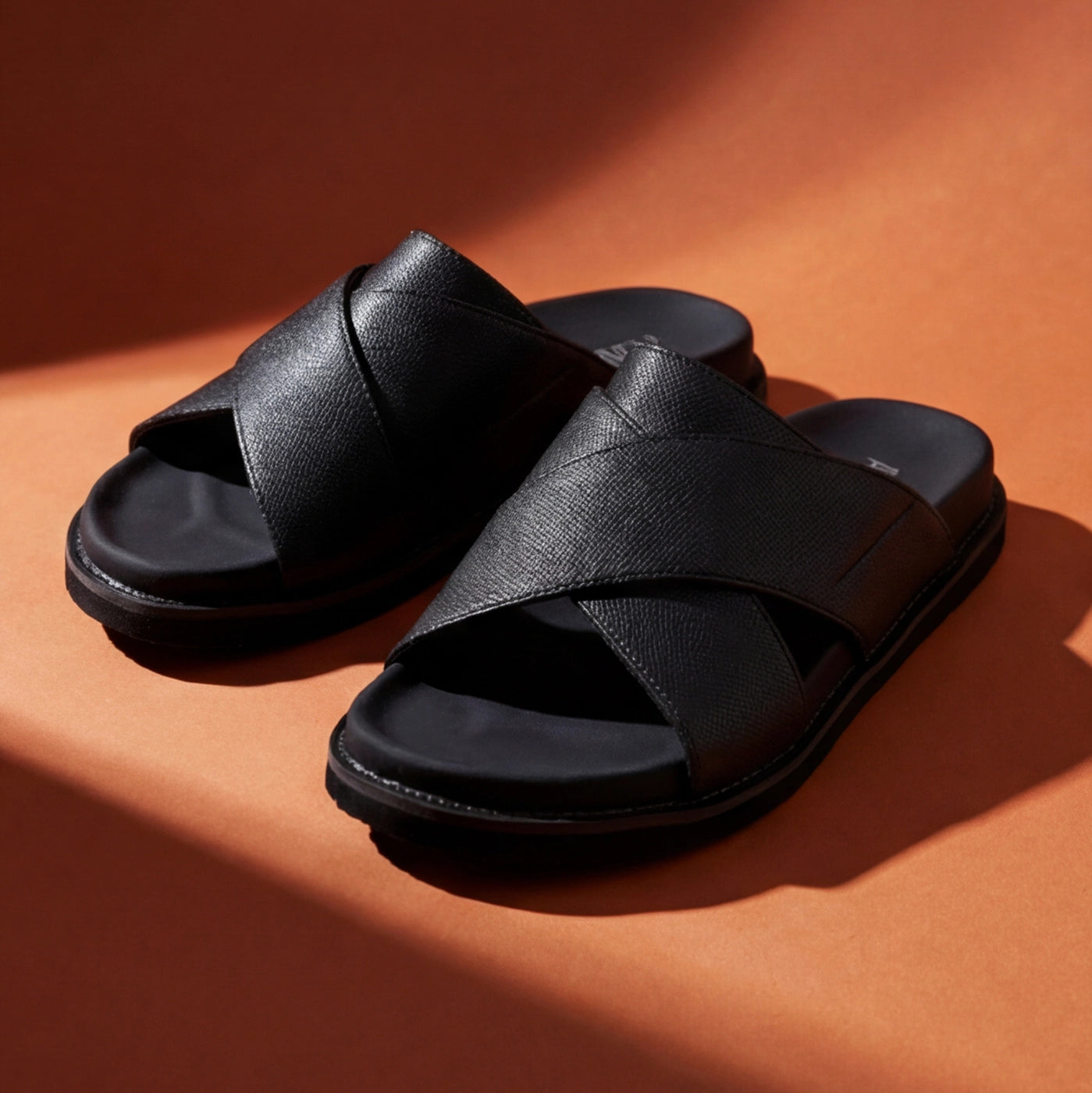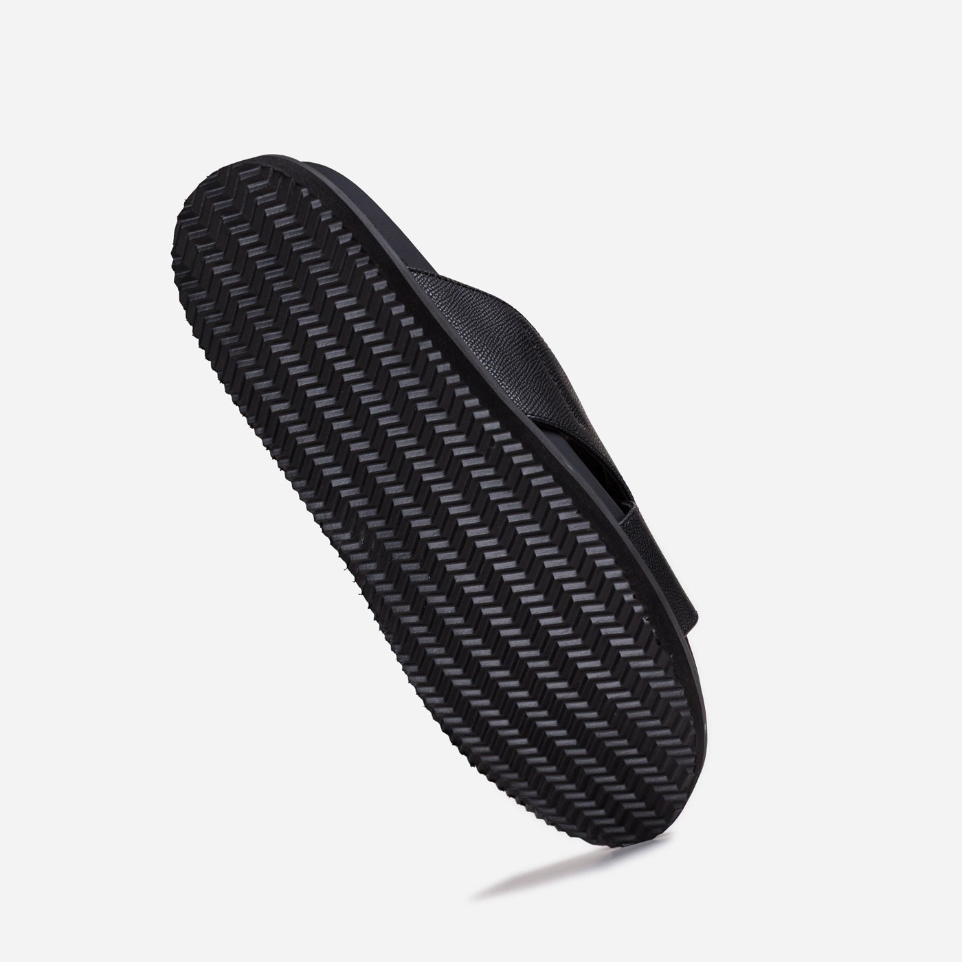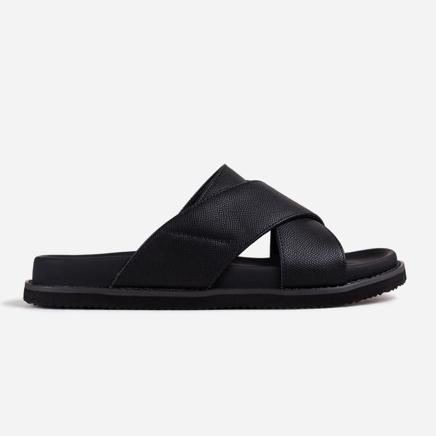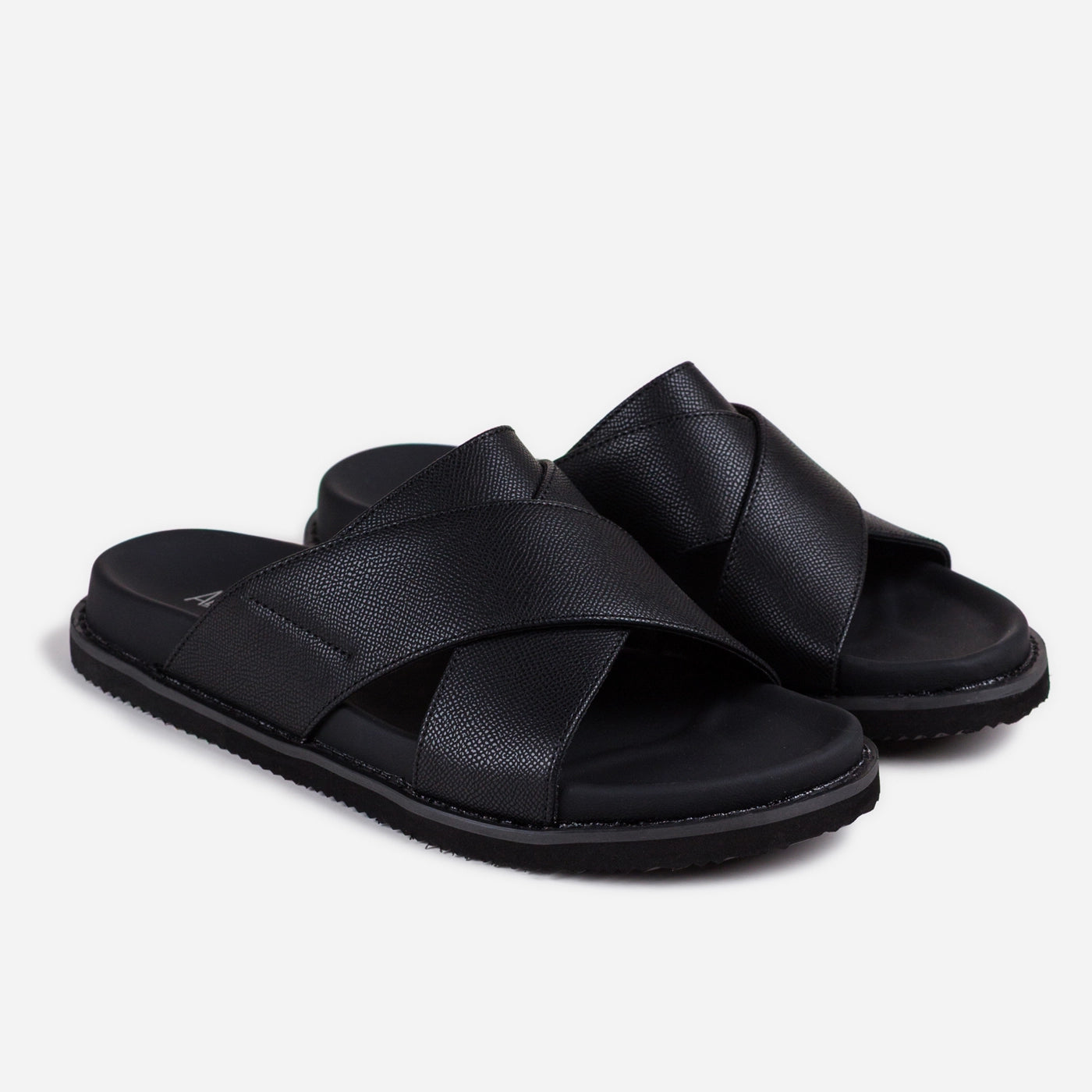 These sleek slides showcase wide crossover straps in rich black with subtle textured detailing. The smooth leather surface creates a polished look, while the cushioned footbed provides comfortable support. Clean branding and contrast stitching add quality touches. Ideal for versatile styling across casual ensembles, summer days, and relaxed occasions that demand understated sophistication.