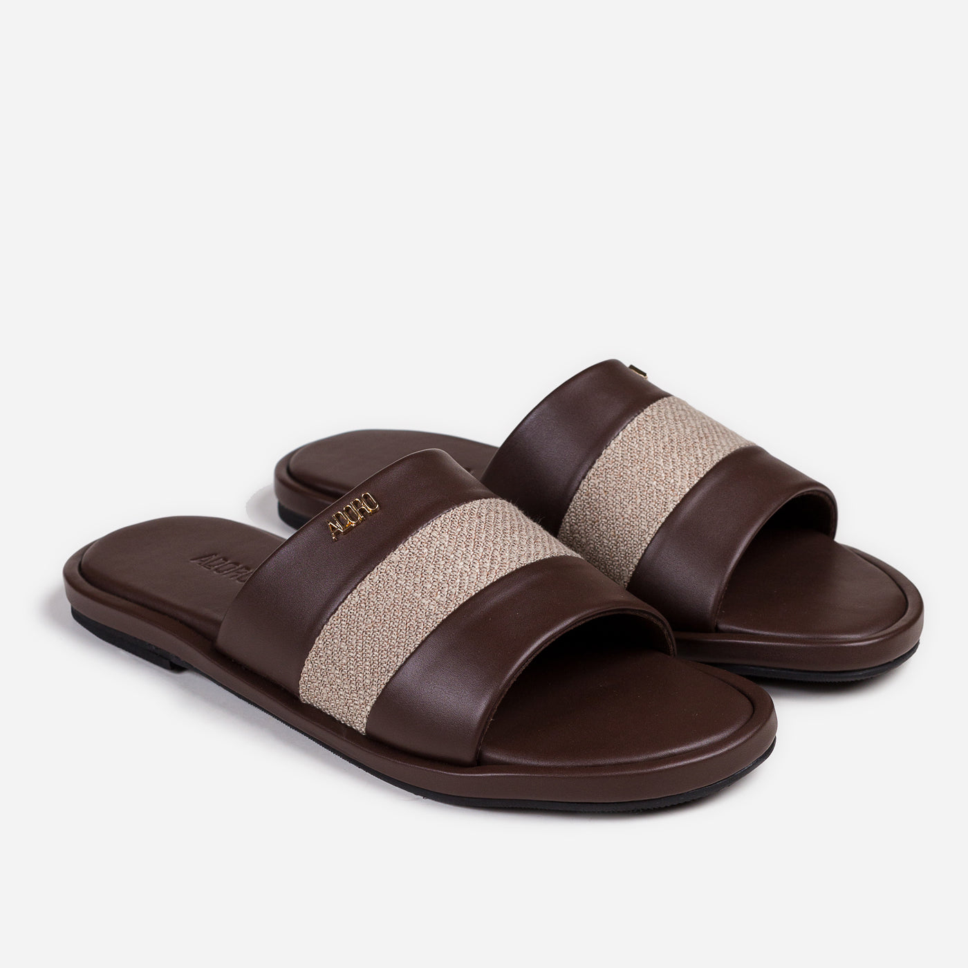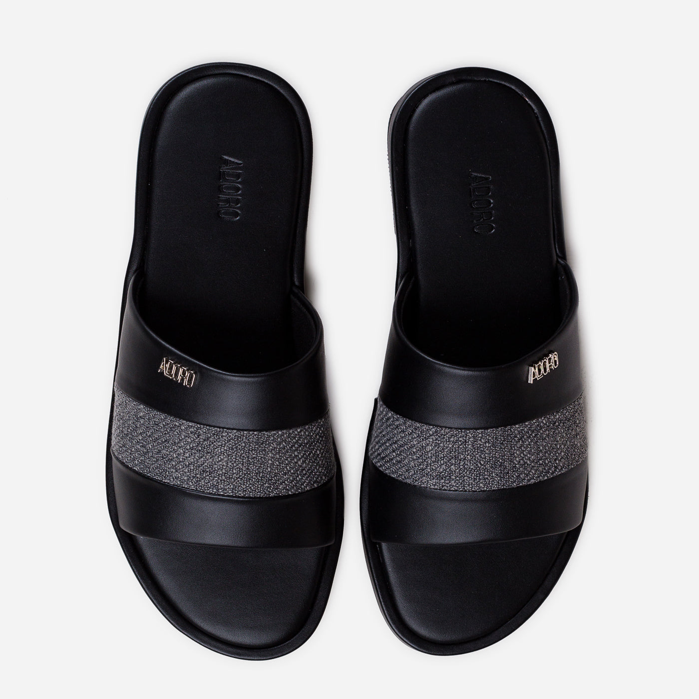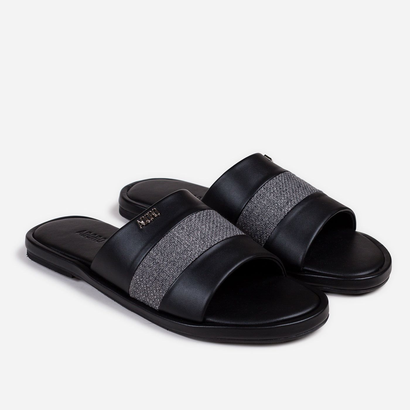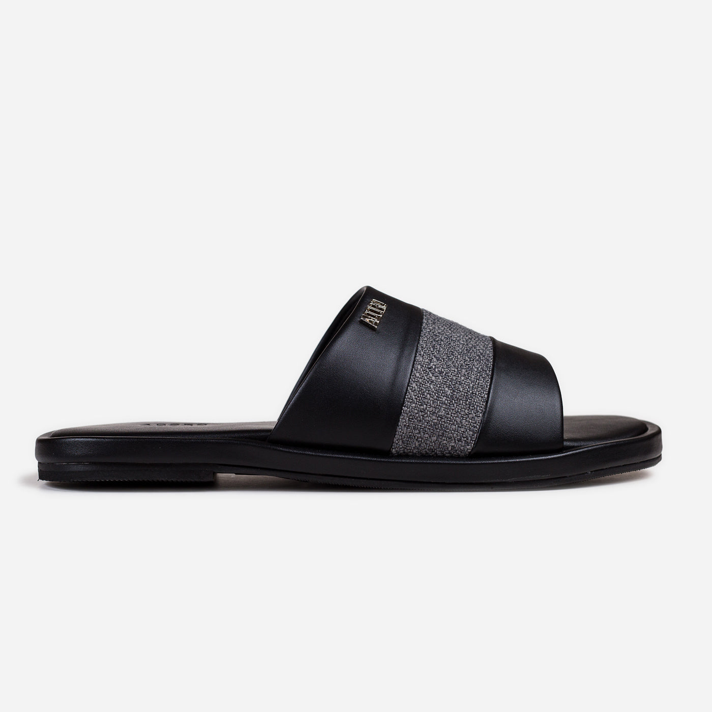 Modern refinement in a sleek slip-on silhouette. This piece showcases premium leather craftsmanship with contrasting textured panel creating sophisticated dimensional detail. The wide overlapping straps provide comfortable coverage, while the cushioned footbed ensures all-day ease. Durable flat sole offers reliable traction with effortless casual elegance.