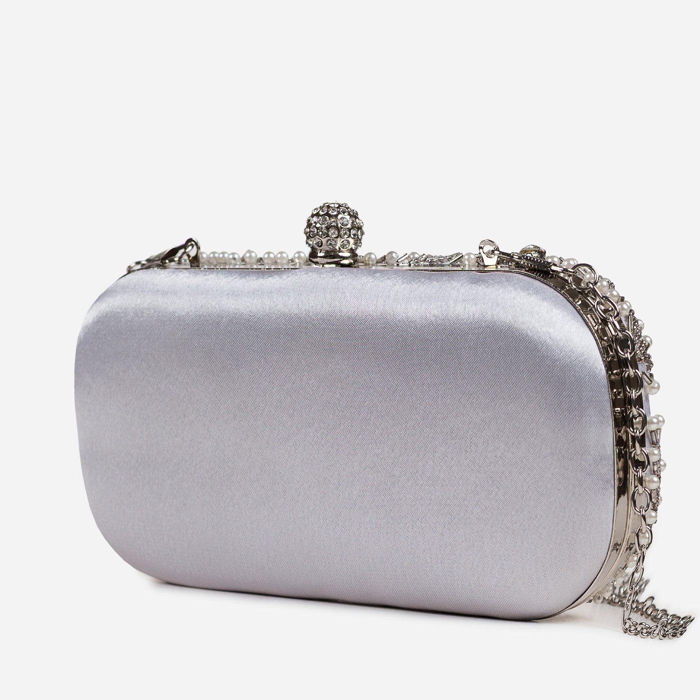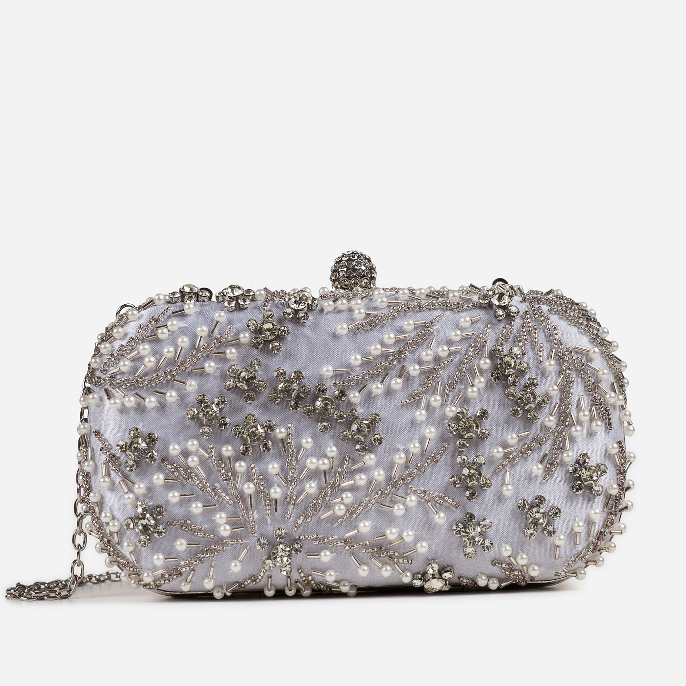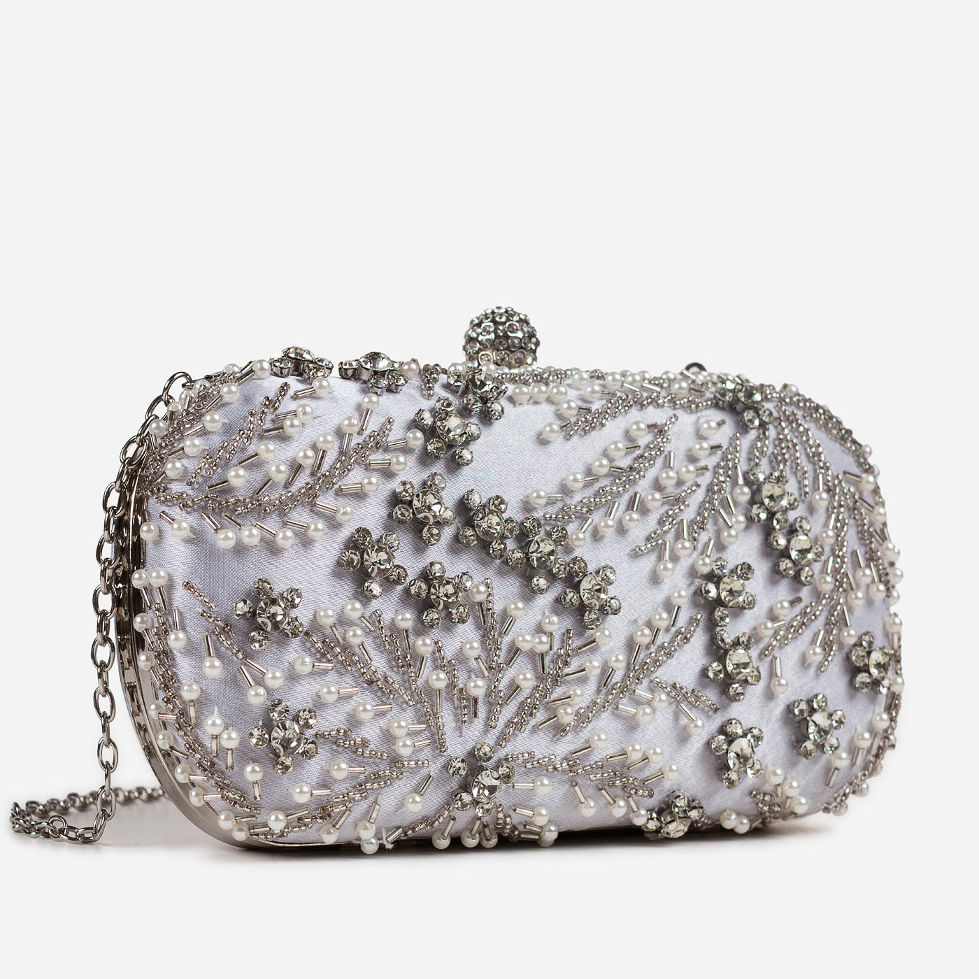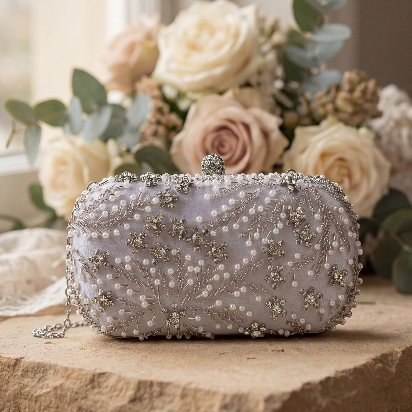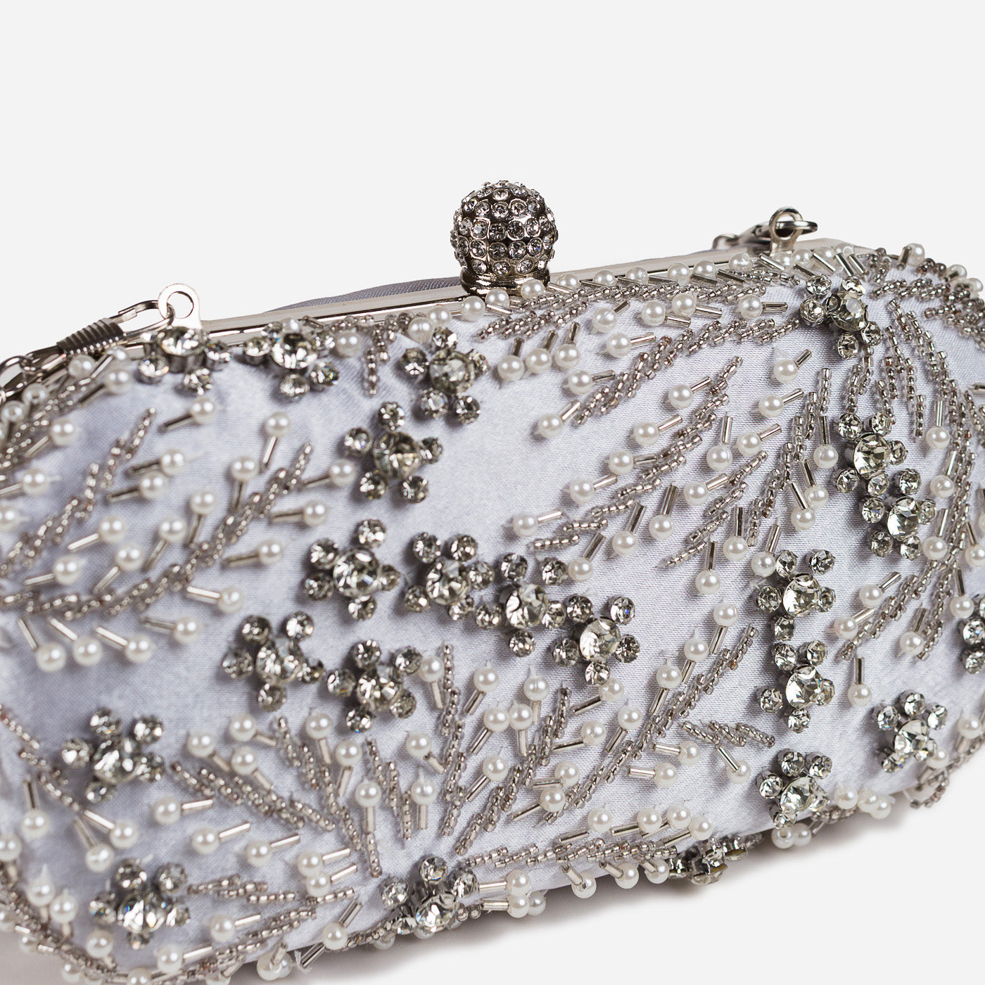 Elegant and intricately detailed, this clutch is adorned with delicate pearl and crystal embellishments arranged in a floral inspired pattern. The soft satin base adds a refined touch, while the hand embroidered design creates a luxurious, statement worthy accessory perfect for special occasions and celebrations.