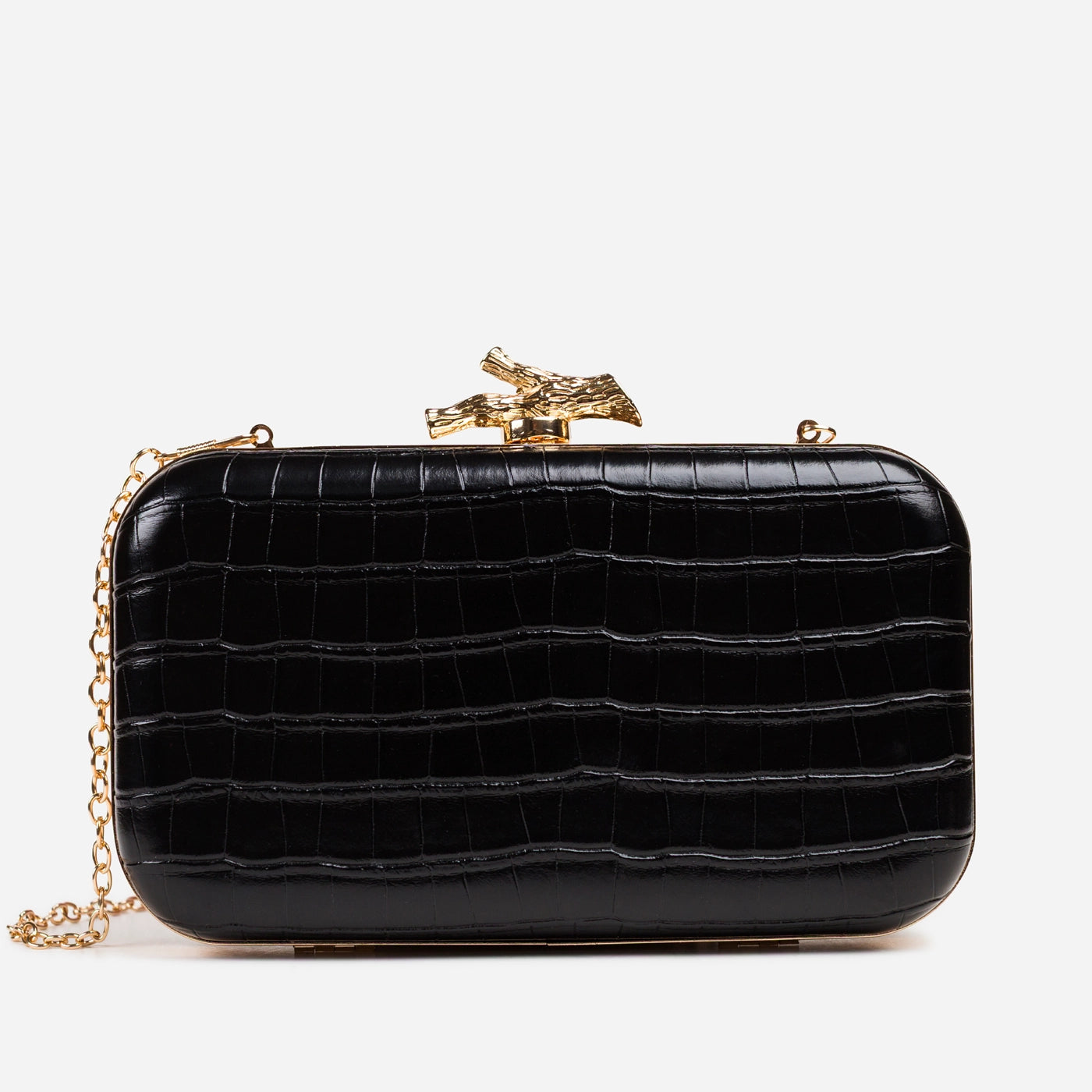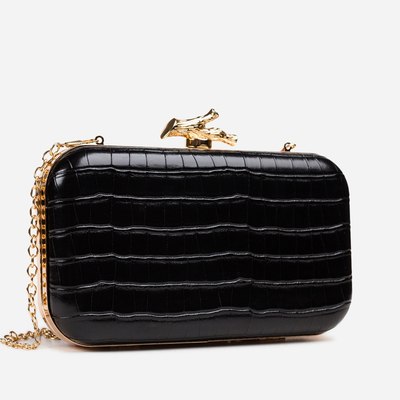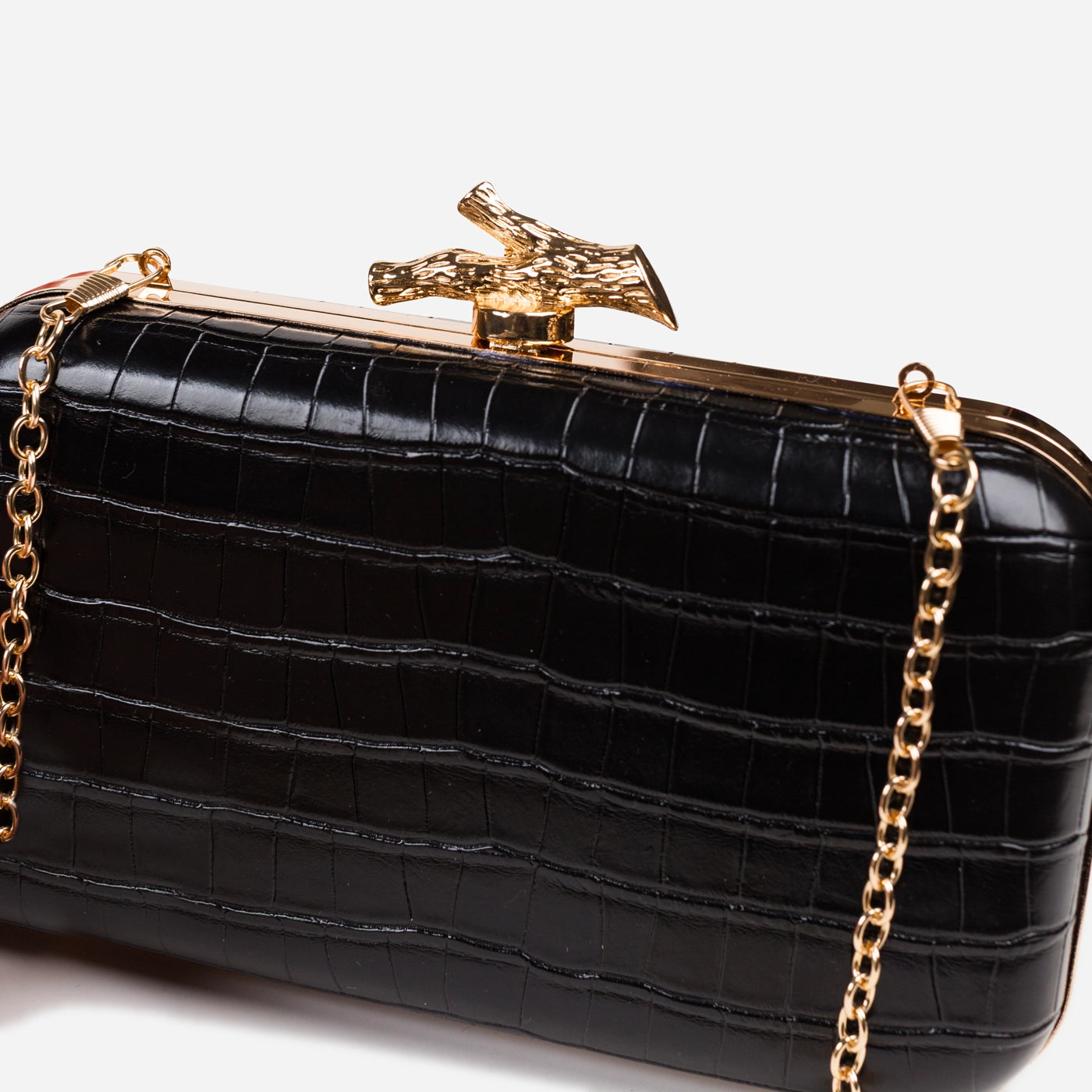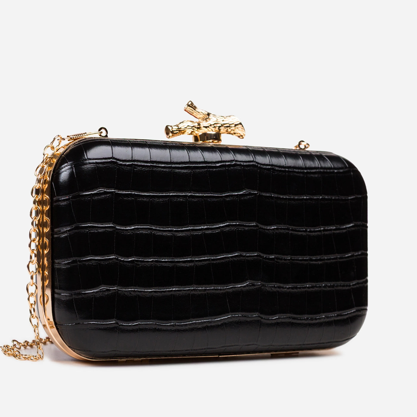 This sophisticated clutch features rich black croc-embossed leather with a glossy finish and gold frame detailing. The signature bow clasp creates a refined focal point, while the sleek rectangular silhouette maintains classic appeal. The delicate gold chain strap tucks away for handheld elegance. Ideal for evening events, cocktail parties, formal dinners, and moments that call for polished sophistication with luxurious texture.