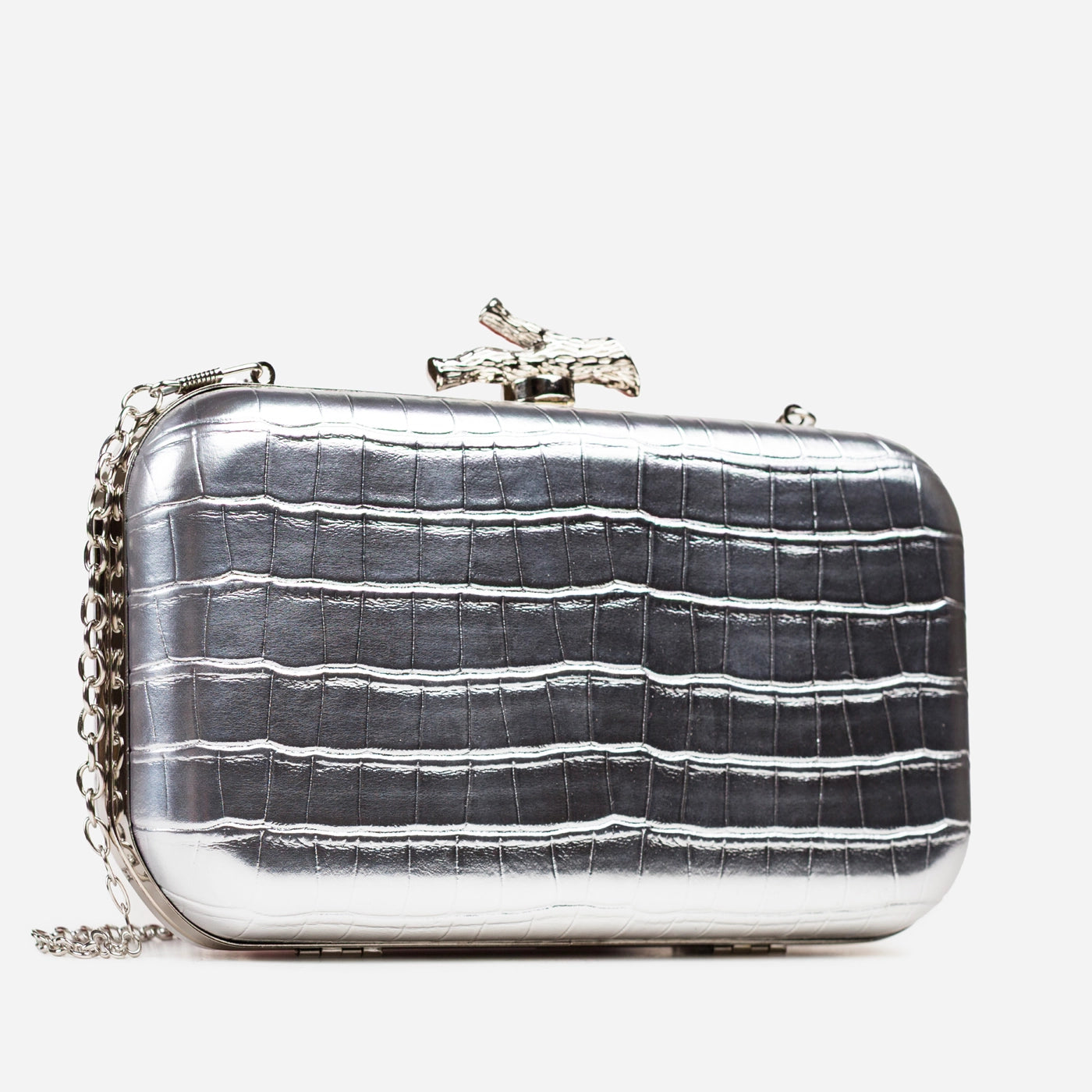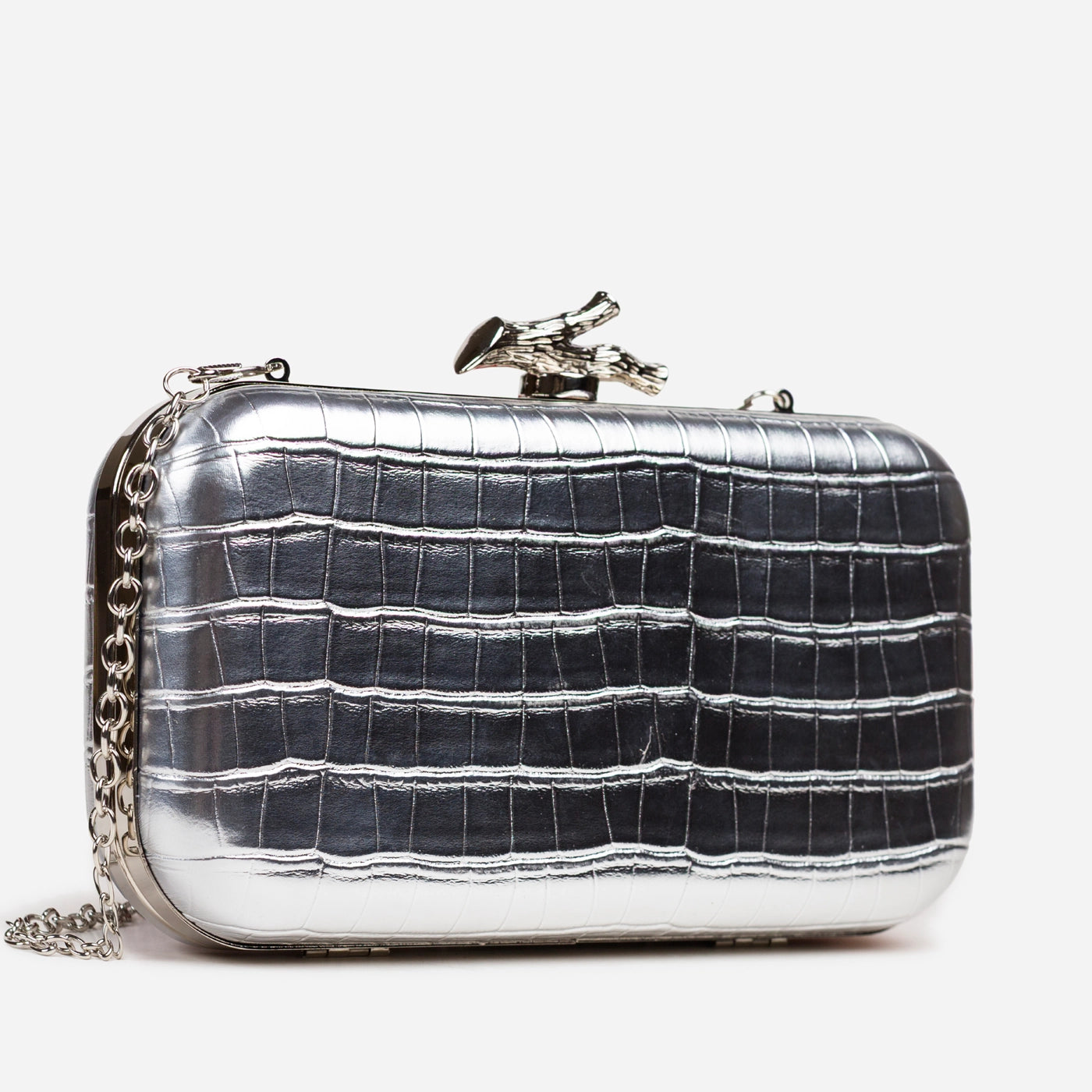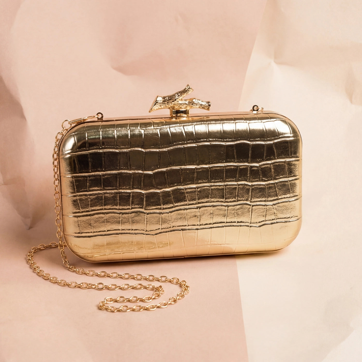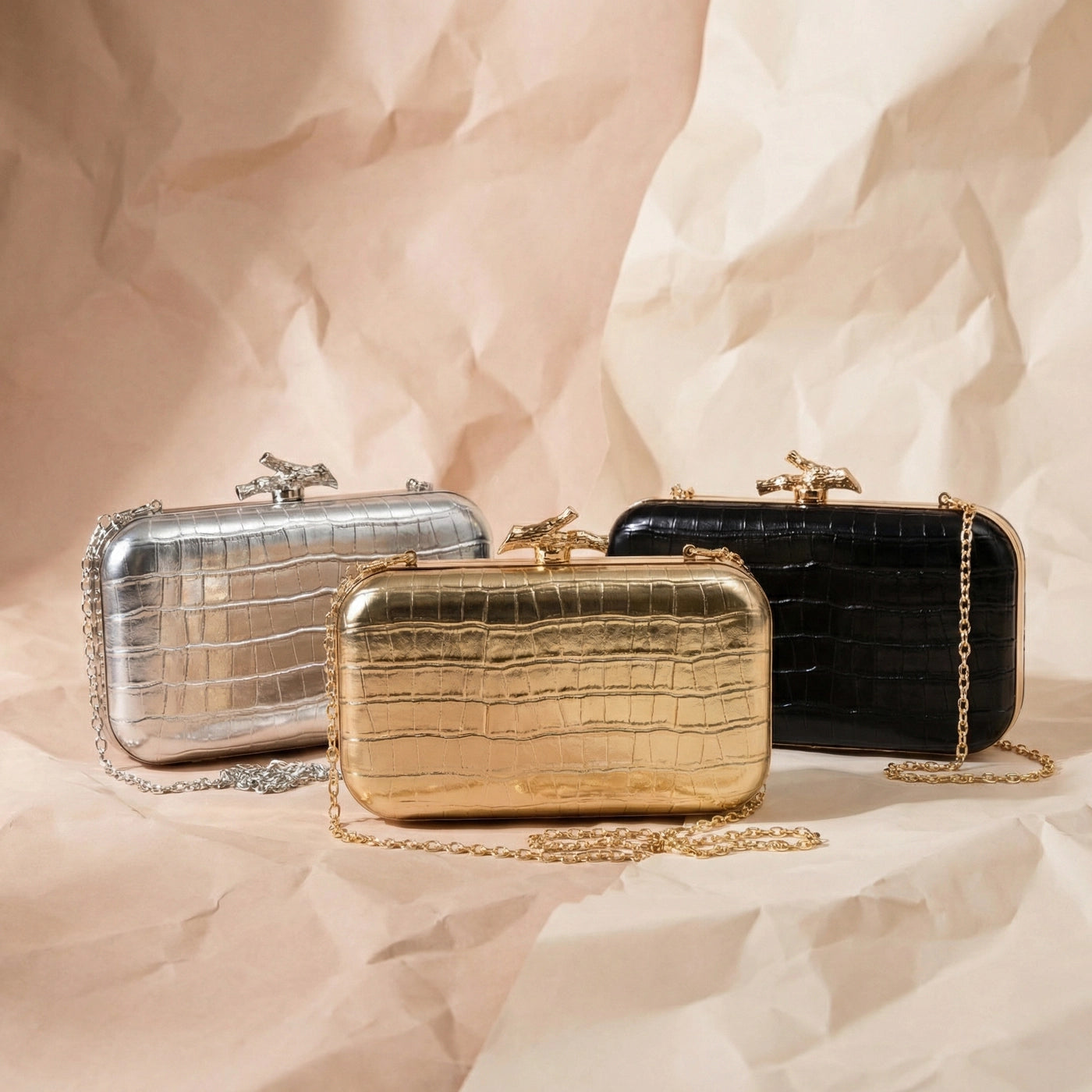 This stunning clutch collection features three show stopping finishes lustrous silver, radiant gold, and classic black. Each piece showcases a croc embossed texture that catches light beautifully, while the signature bow clasp in coordinating metallic tones adds elegant detail. Delicate chain straps offer versatile carrying options. Perfect for weddings, galas, formal celebrations, and occasions that demand unforgettable glamour.