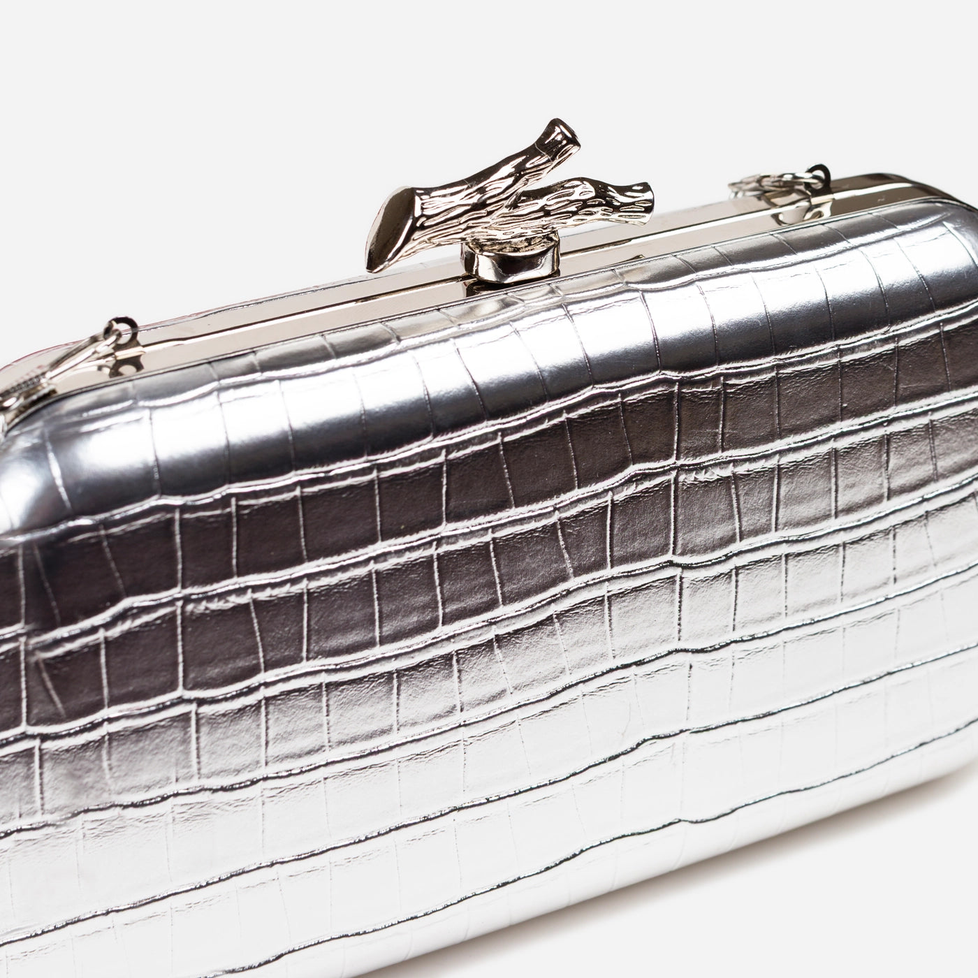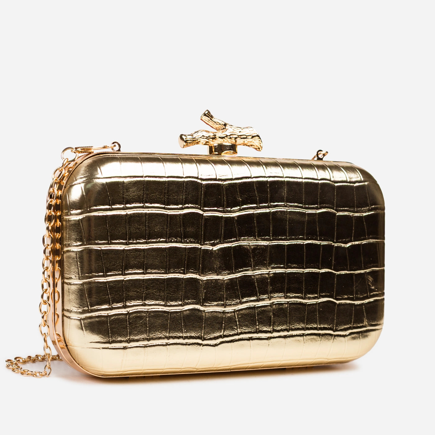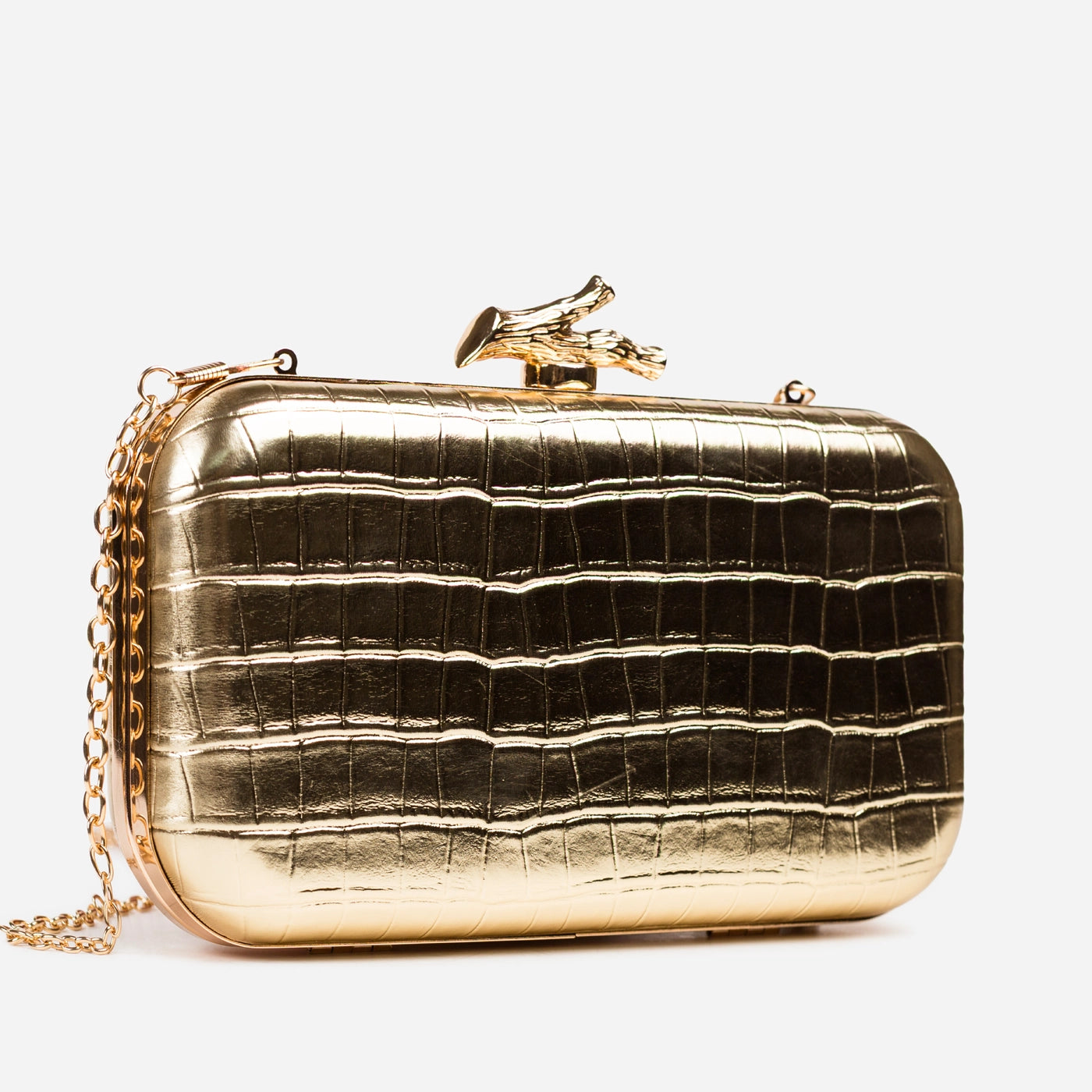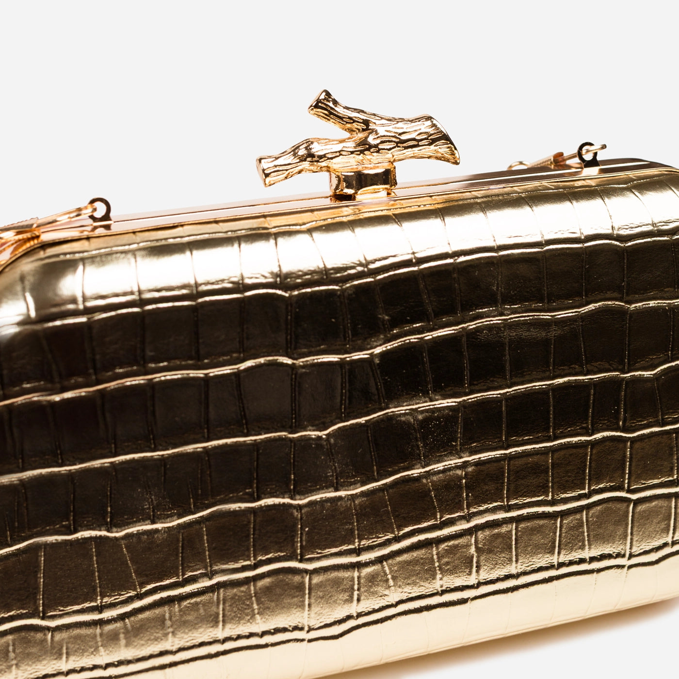 Statement luxury in a structured silhouette. This evening clutch features a high shine croc embossed finish in radiant gold, creating instant visual impact. The sculptural branch clasp adds artistic detail, while the detachable chain strap offers versatile carrying options. Compact interior holds evening essentials with refined organization.