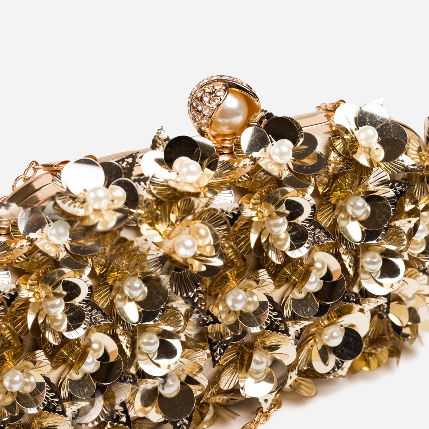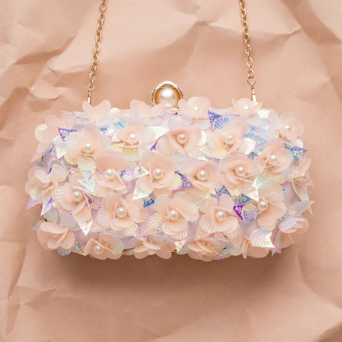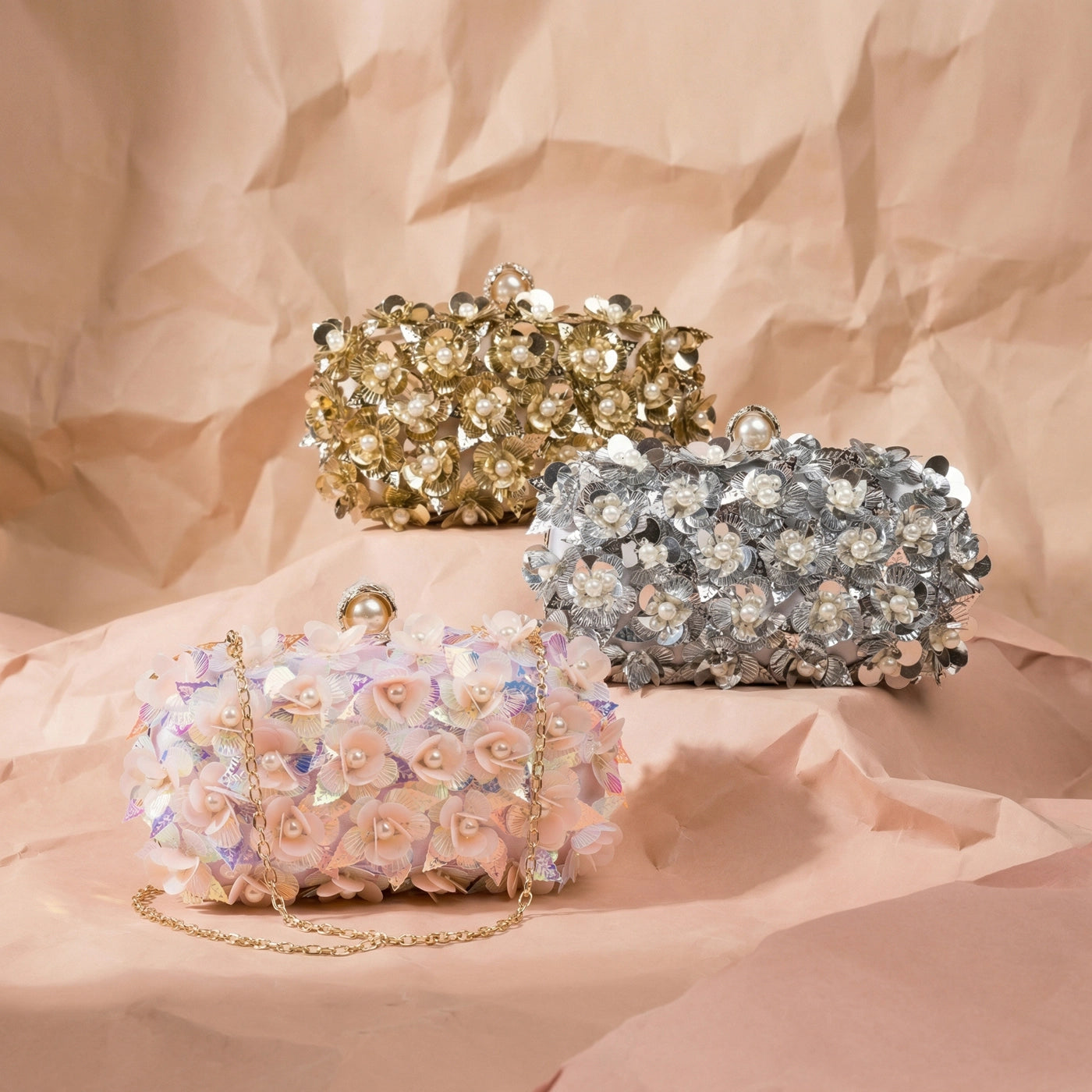 This exquisite collection showcases three luxurious colorways soft iridescent pink, warm champagne gold, and cool metallic silver. Each double sided clutch features intricate 3D floral embellishments with pearl accents and shimmering sequins. The pearl clasp closures and chain straps complete the refined aesthetic. Perfect for creating coordinated bridal party looks or selecting the ideal shade for special occasions.
