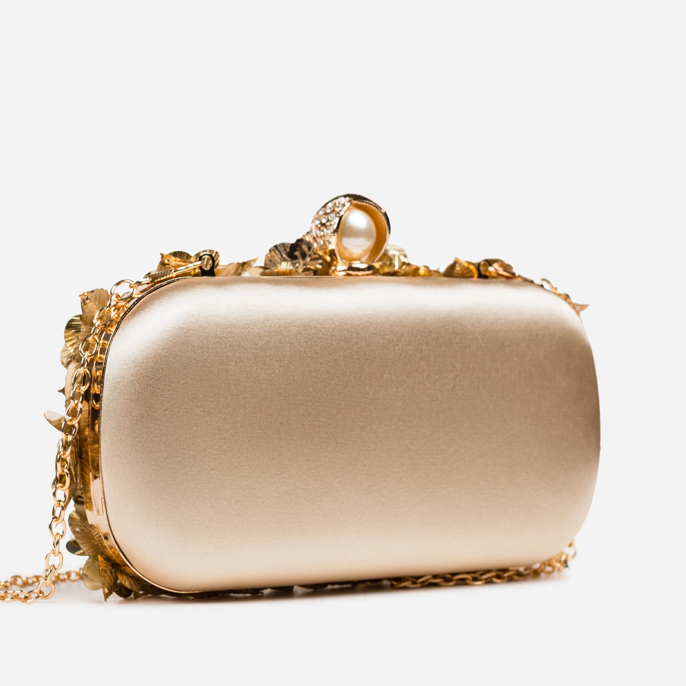 - Design: Structured box clutch with dual-sided versatility and jeweled pearl clasp