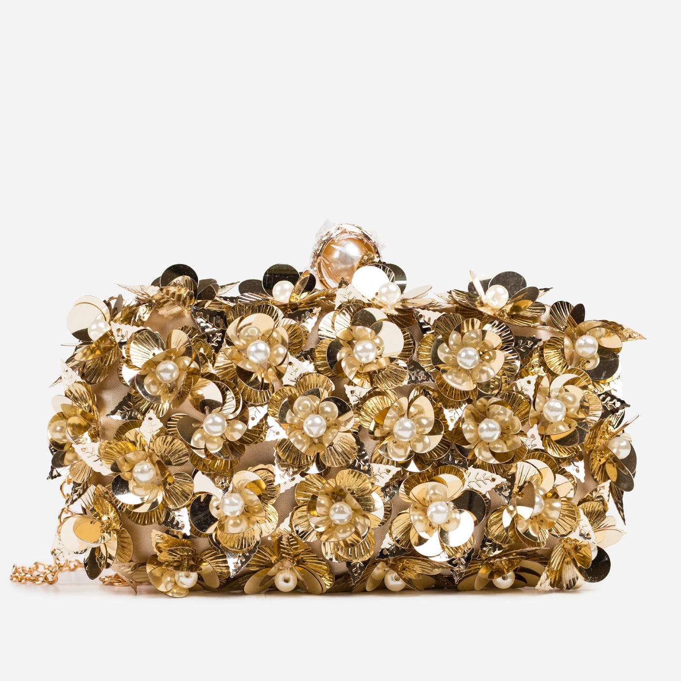 This enchanting double sided clutch features delicate floral appliqués with iridescent sequins that shimmer in soft pink and lavender hues. Each handcrafted flower is adorned with pearl centers, creating a romantic garden effect. The pearl topped clasp and delicate gold chain add refined elegance. Perfect for weddings, bridal events, and moments that call for whimsical sophistication with dimensional artistry.