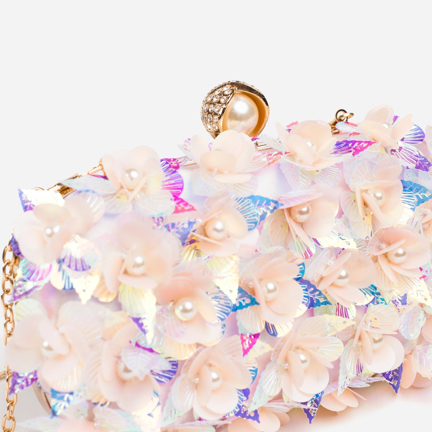 Enchanting artistry in a versatile evening piece. This dual sided clutch features two distinct looks: one side adorned with dimensional floral appliqués and pearl accents in soft pink tones with iridescent shimmer, the other a smooth satin finish in delicate blush. The jeweled pearl clasp adds refined detail, while the detachable chain strap offers flexible carrying options.