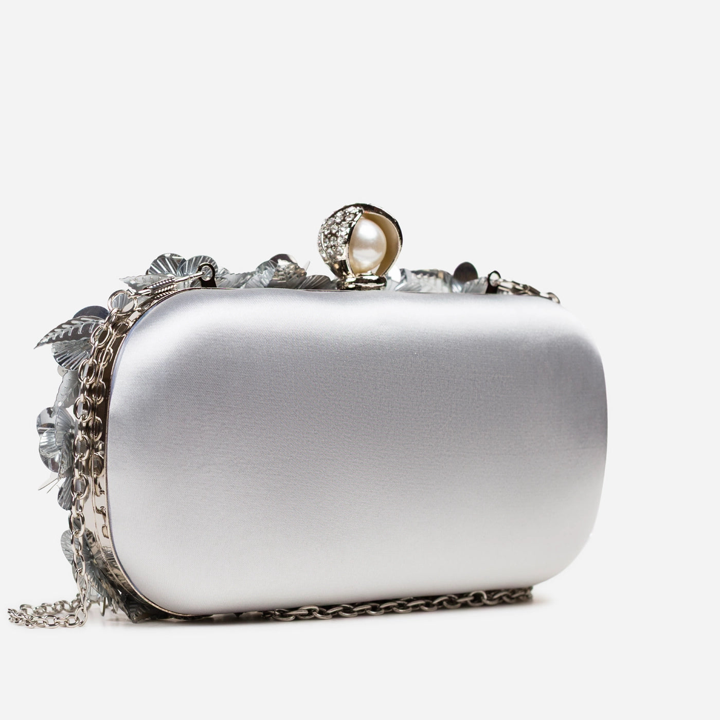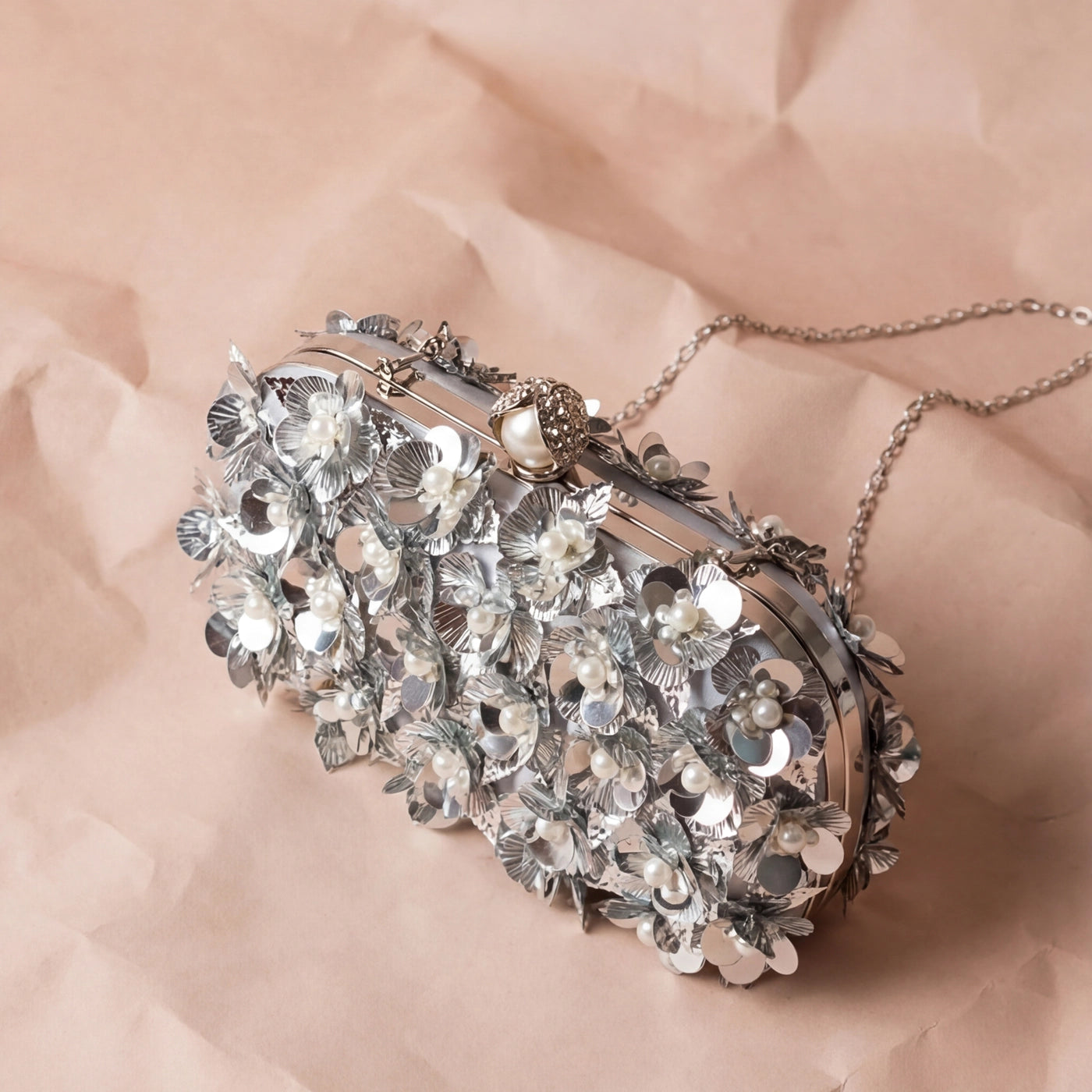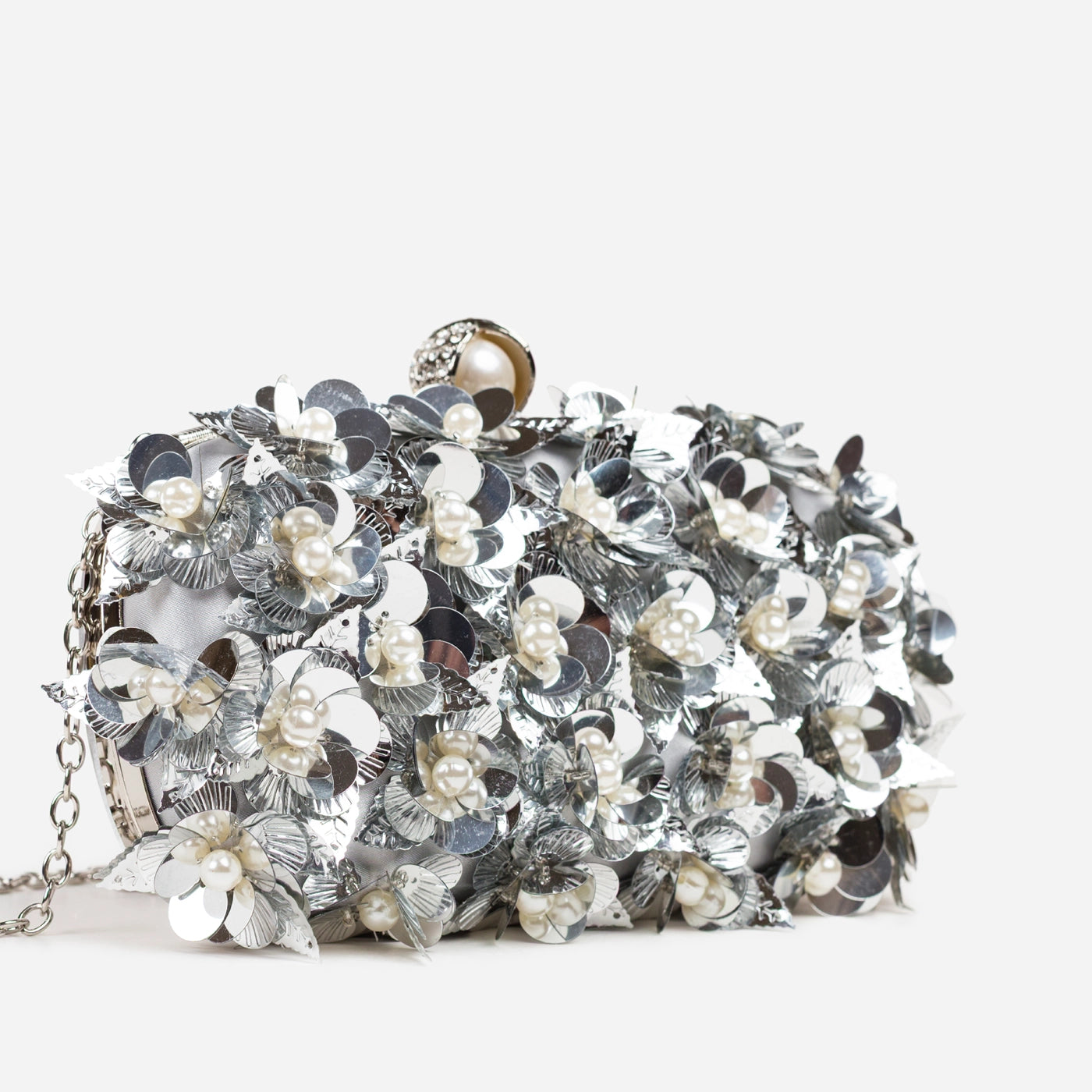 This sophisticated double sided clutch showcases silver metallic flowers with dimensional petals and lustrous pearl centers. The intricate floral arrangement creates textural depth, while the pearl topped frame clasp adds classic refinement. The delicate chain strap offers versatile carrying. Ideal for formal galas, evening celebrations, and occasions that demand statement elegance with artisan craftsmanship.