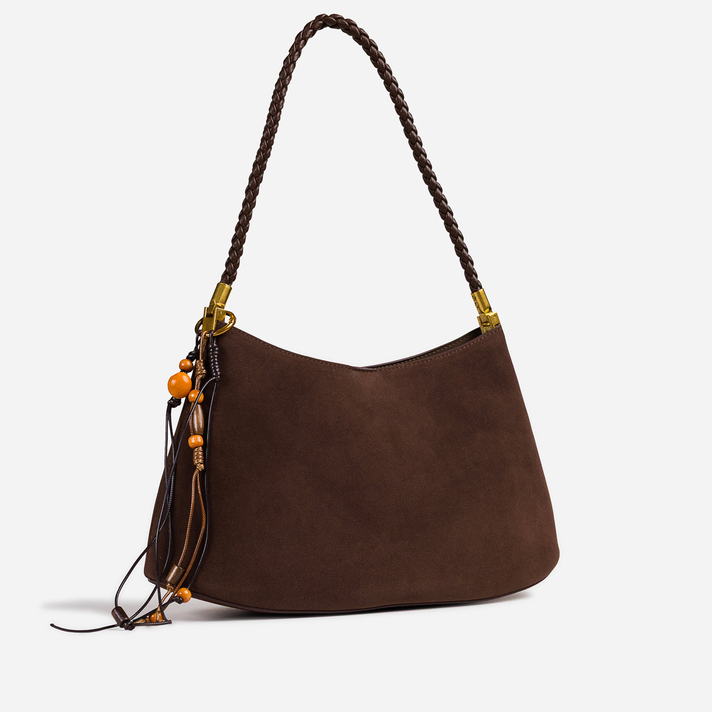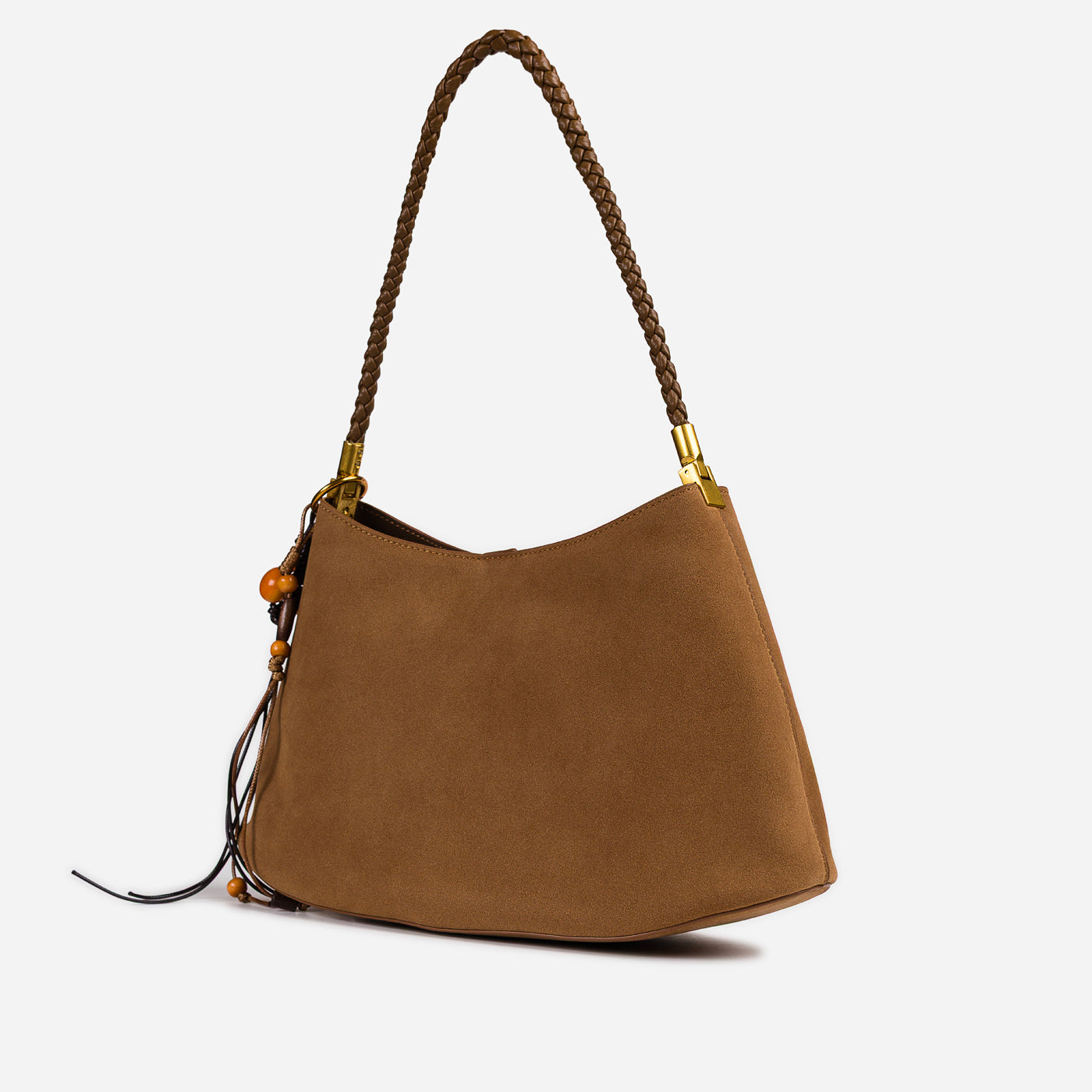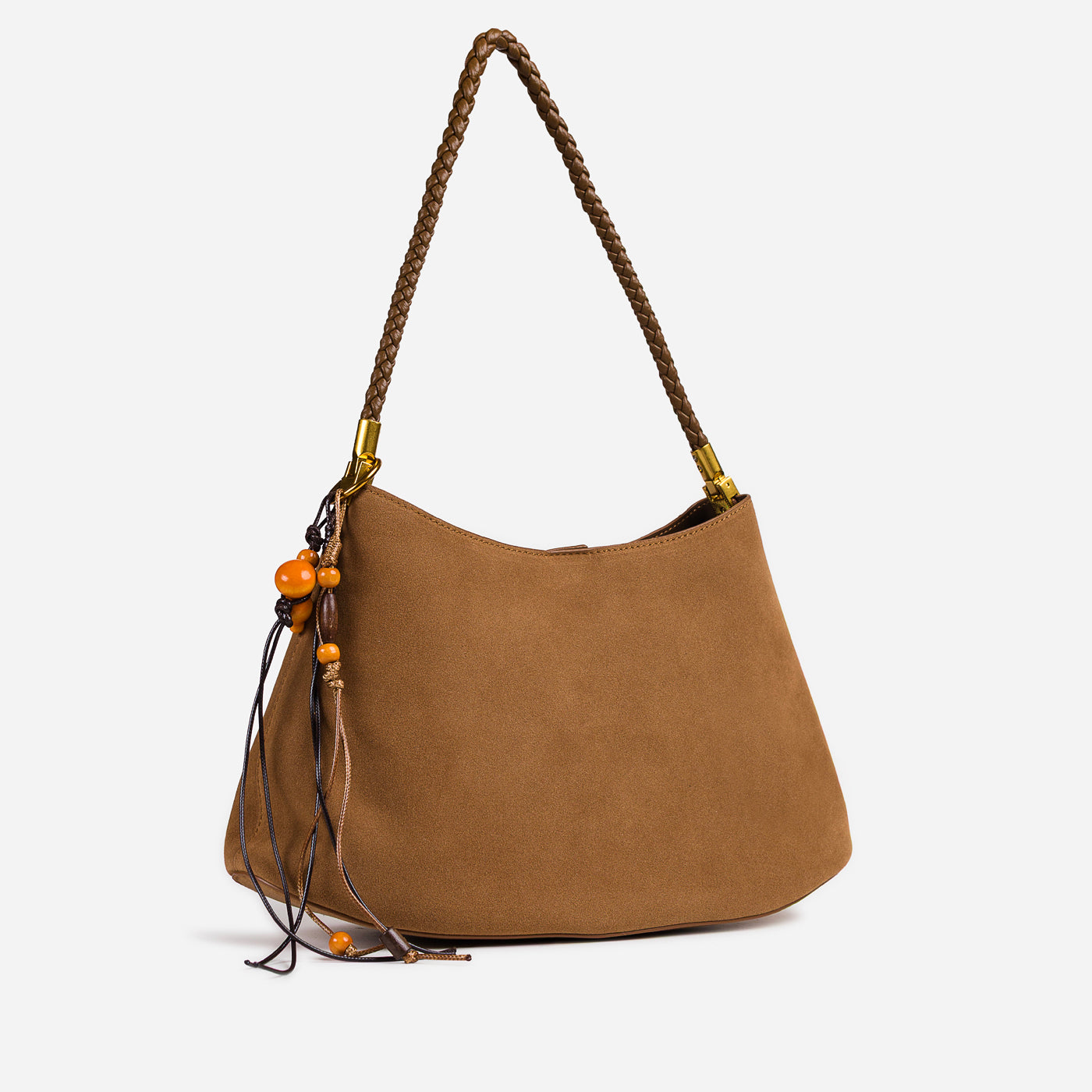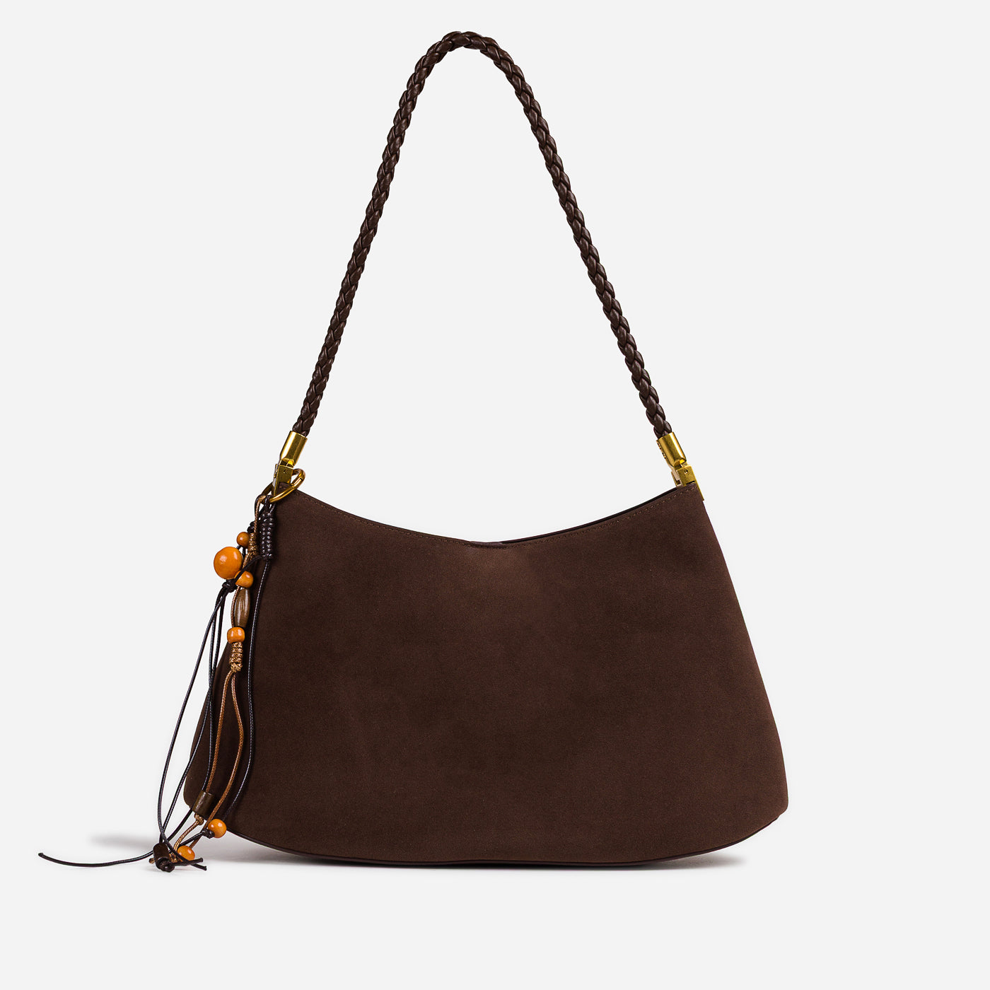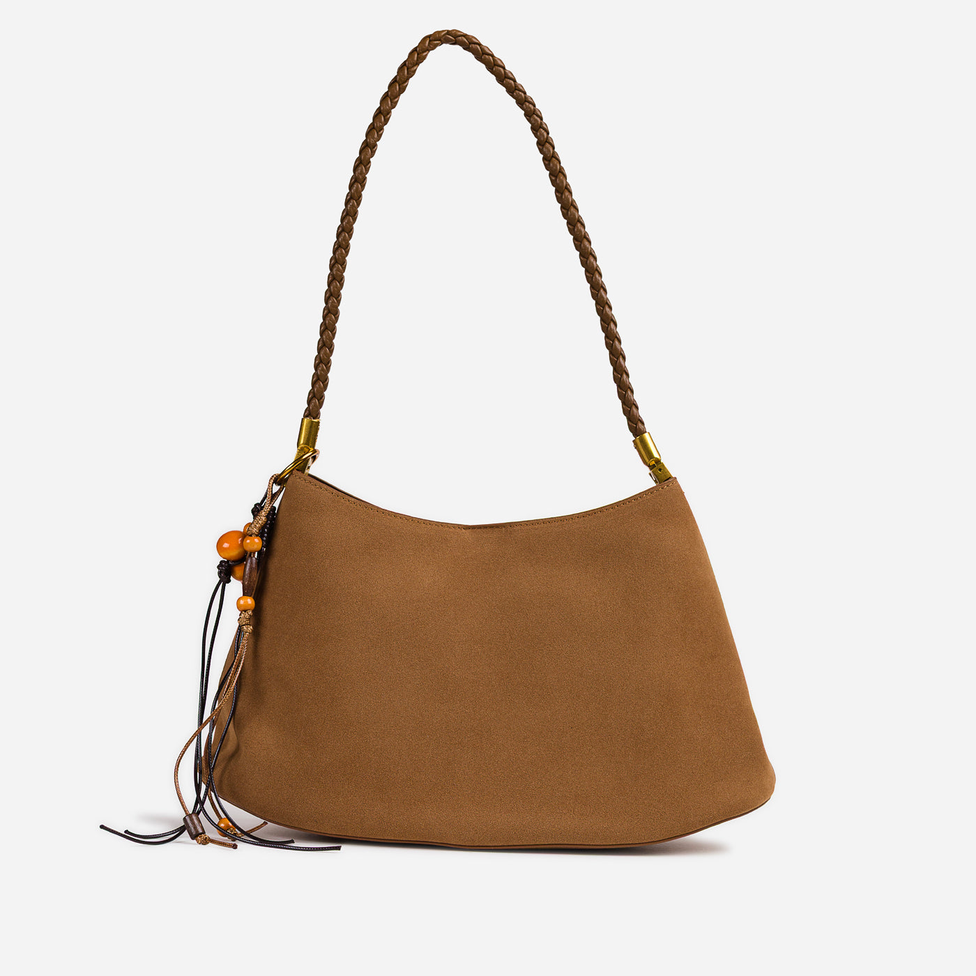 Soft texture meets artisanal detail in this effortlessly stylish shoulder bag. Designed with a gently curved silhouette, it features a suede-like finish complemented by a braided handle and playful tassel accents. Lightweight yet functional, this bag adds warmth and character to everyday looks while remaining easy to carry from day to night.