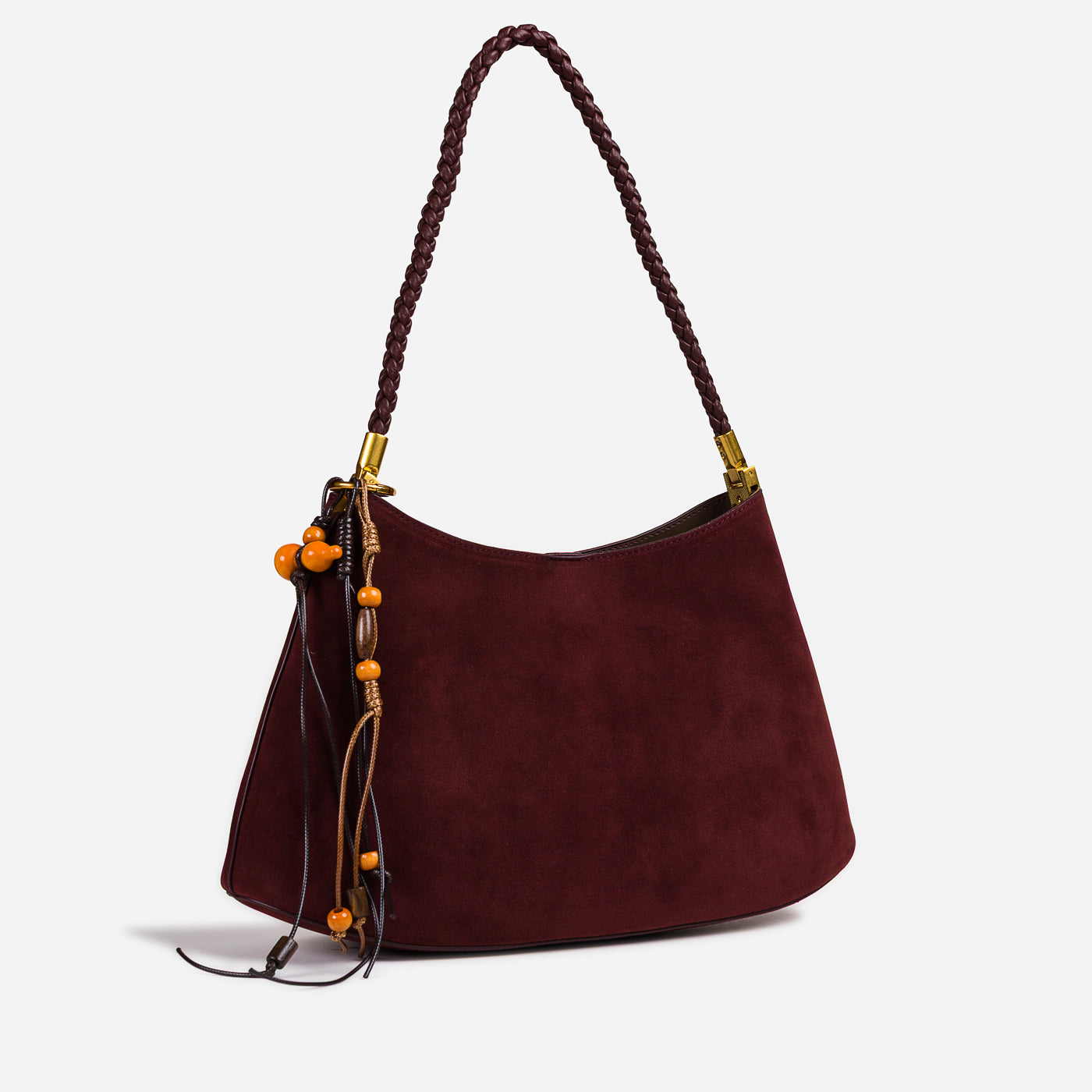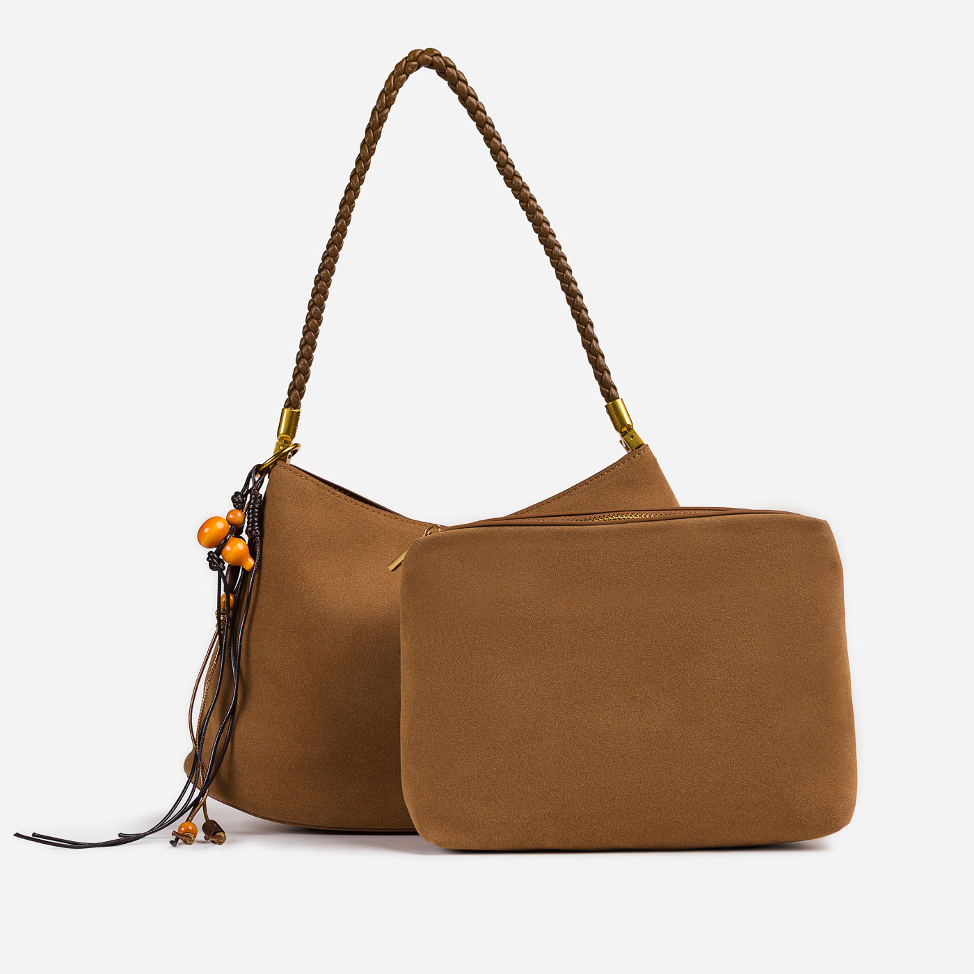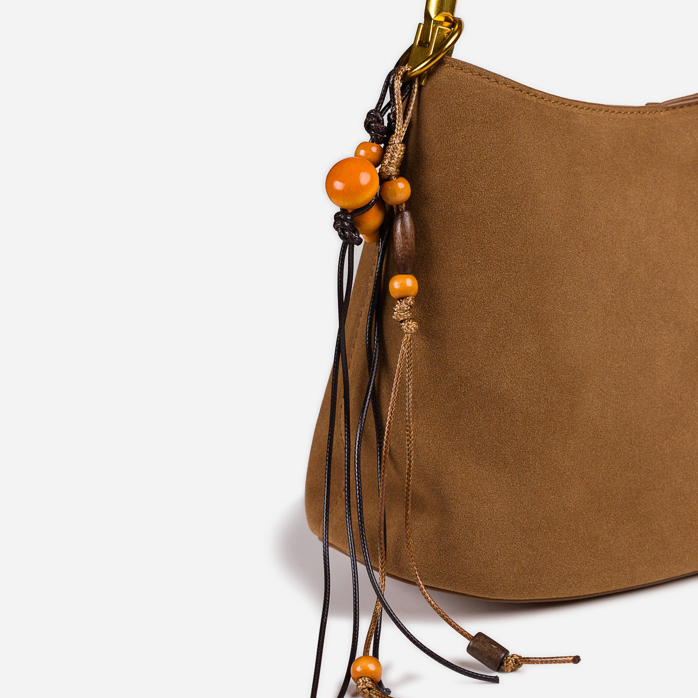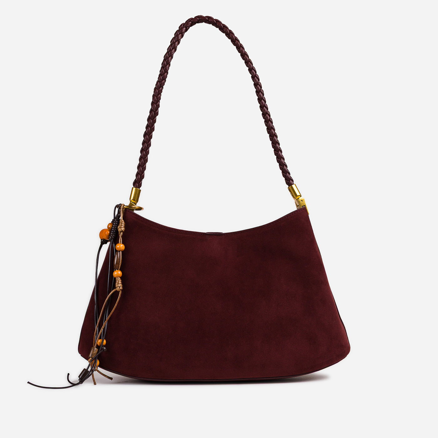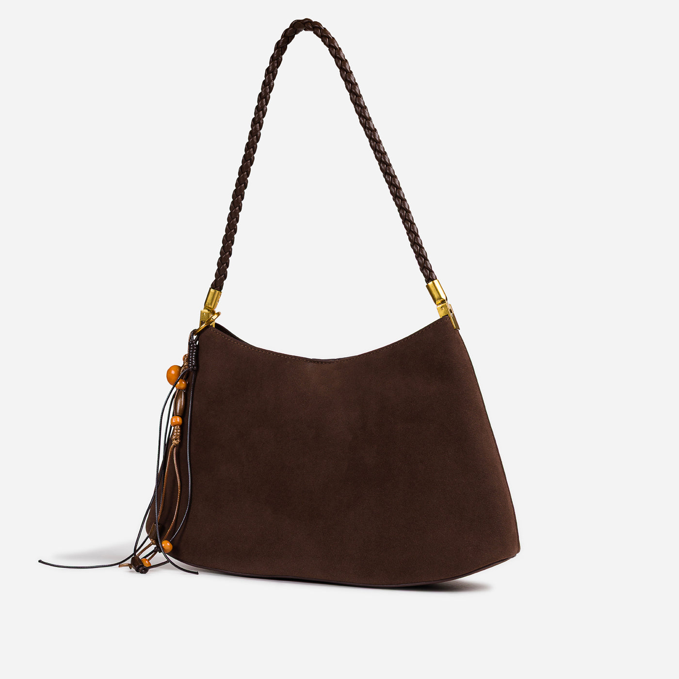 Soft texture meets artisanal detail in this effortlessly stylish shoulder bag. Designed with a gently curved silhouette, it features a suede-like finish complemented by a braided handle and playful tassel accents. Lightweight yet functional, this bag adds warmth and character to everyday looks while remaining easy to carry from day to night.