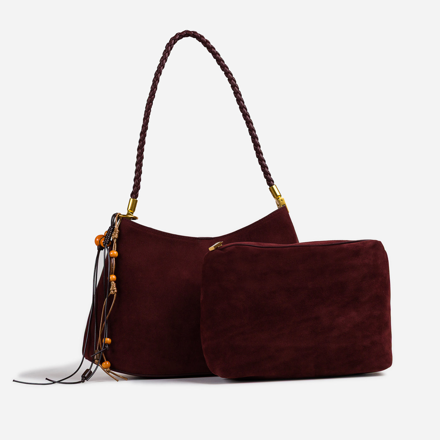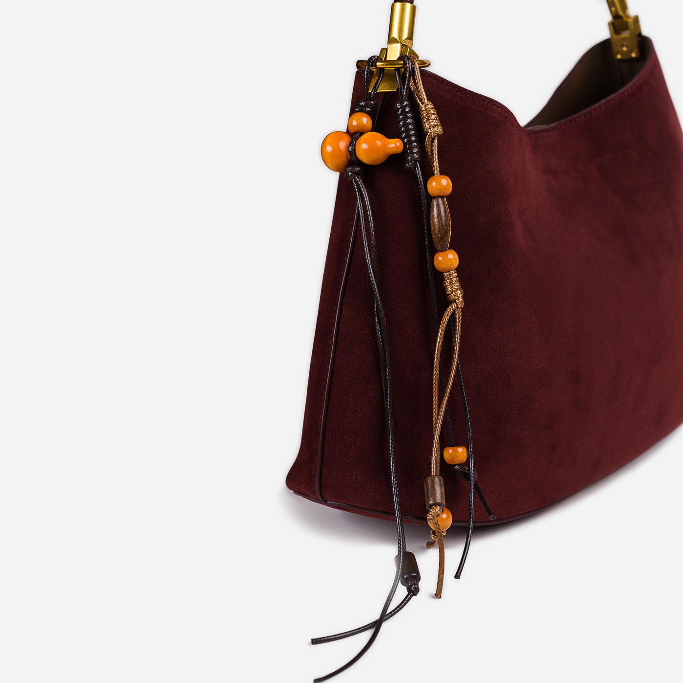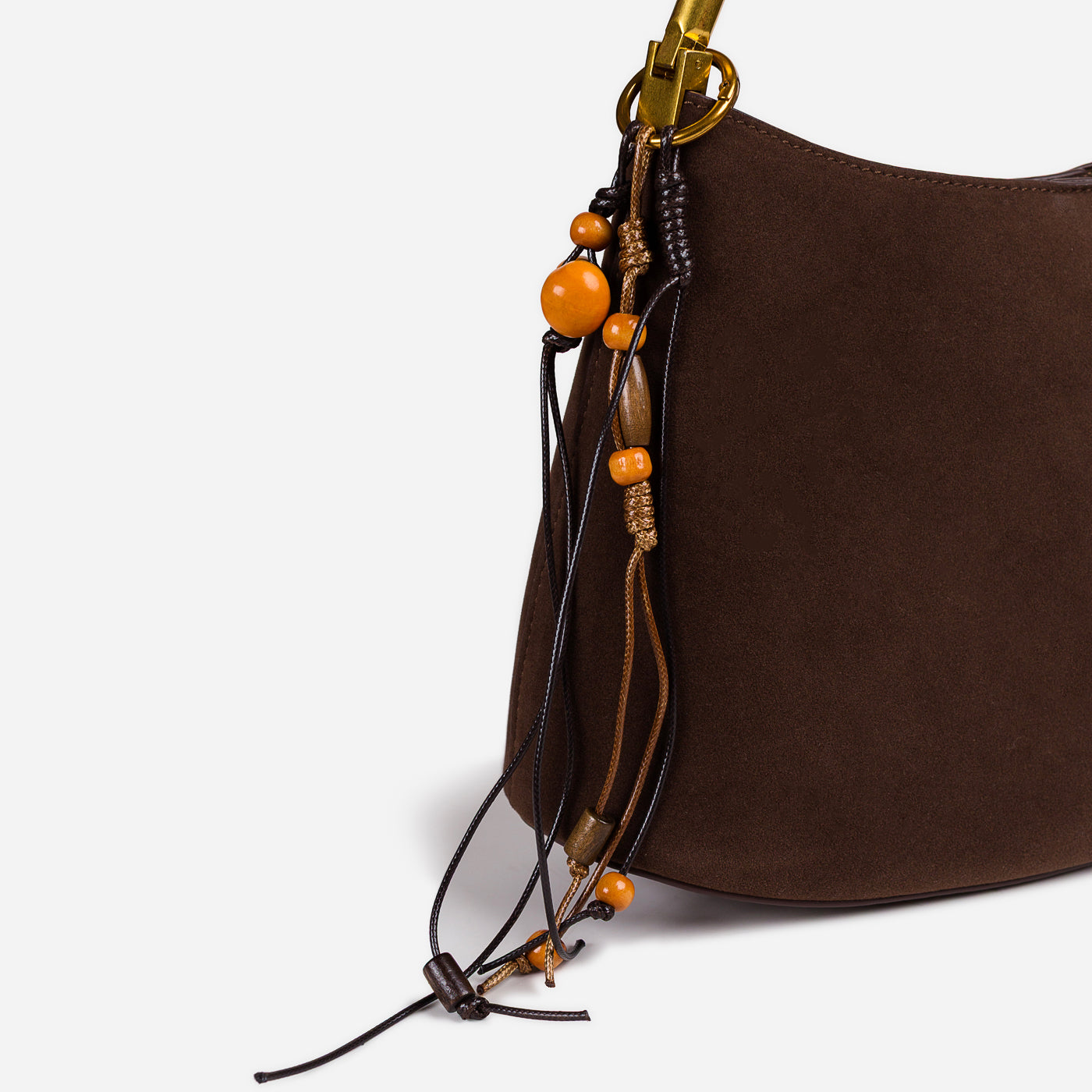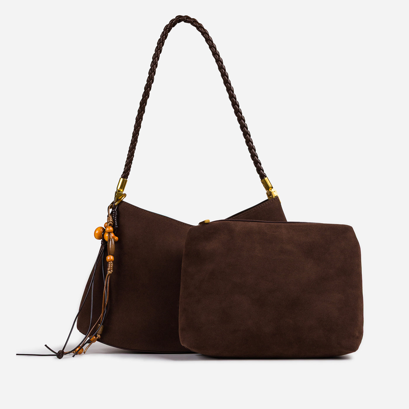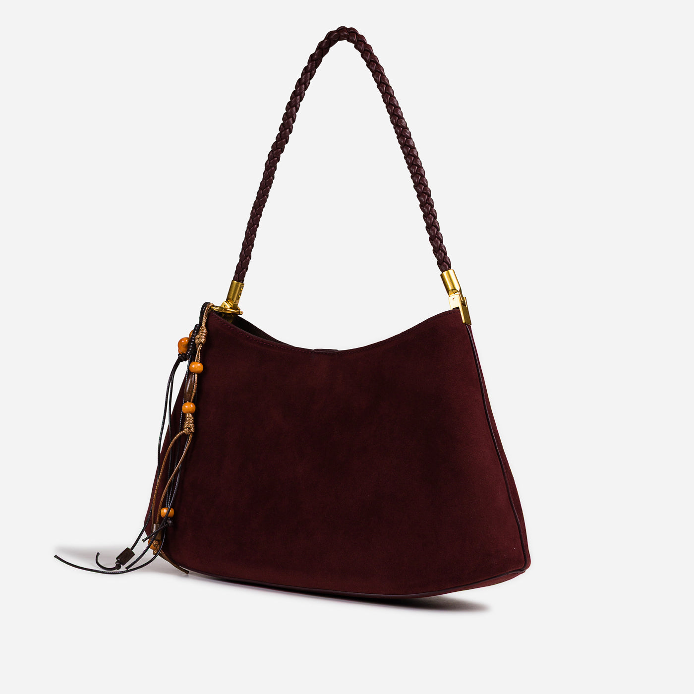 Soft texture meets artisanal detail in this effortlessly stylish shoulder bag. Designed with a gently curved silhouette, it features a suede-like finish complemented by a braided handle and playful tassel accents. Lightweight yet functional, this bag adds warmth and character to everyday looks while remaining easy to carry from day to night.