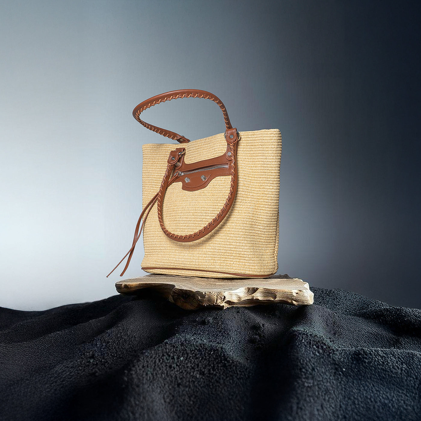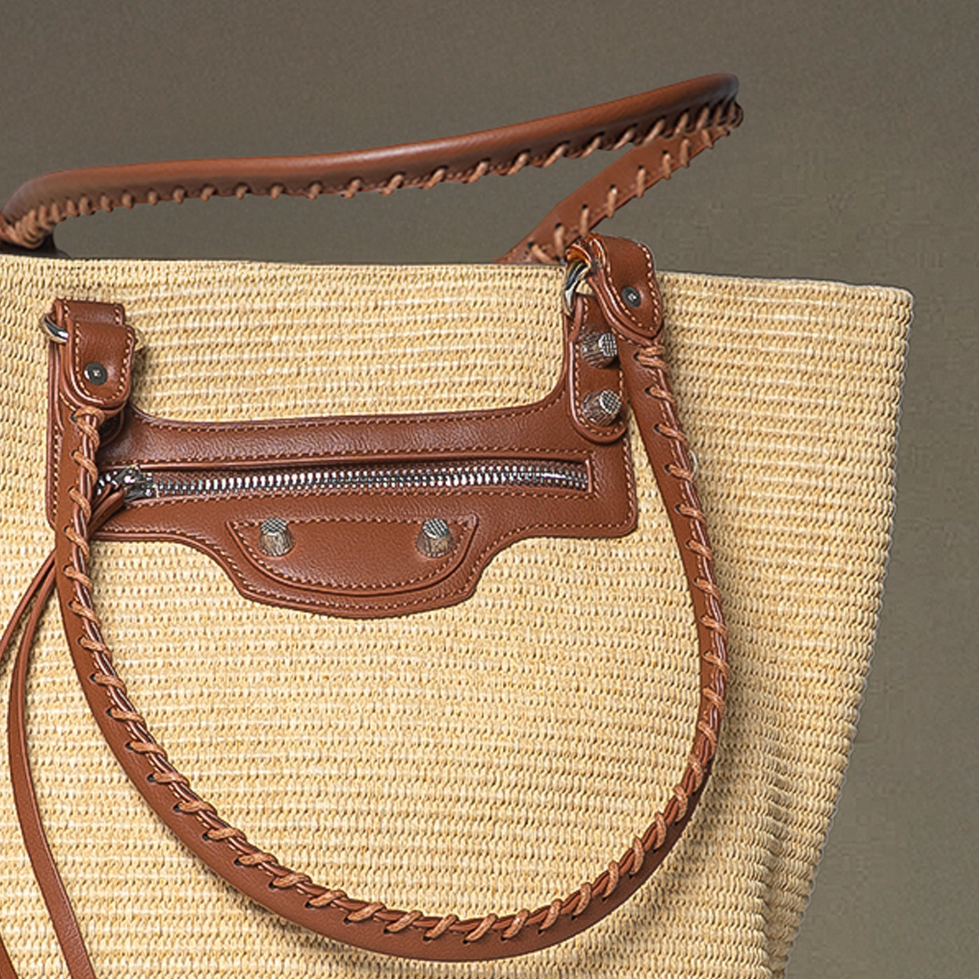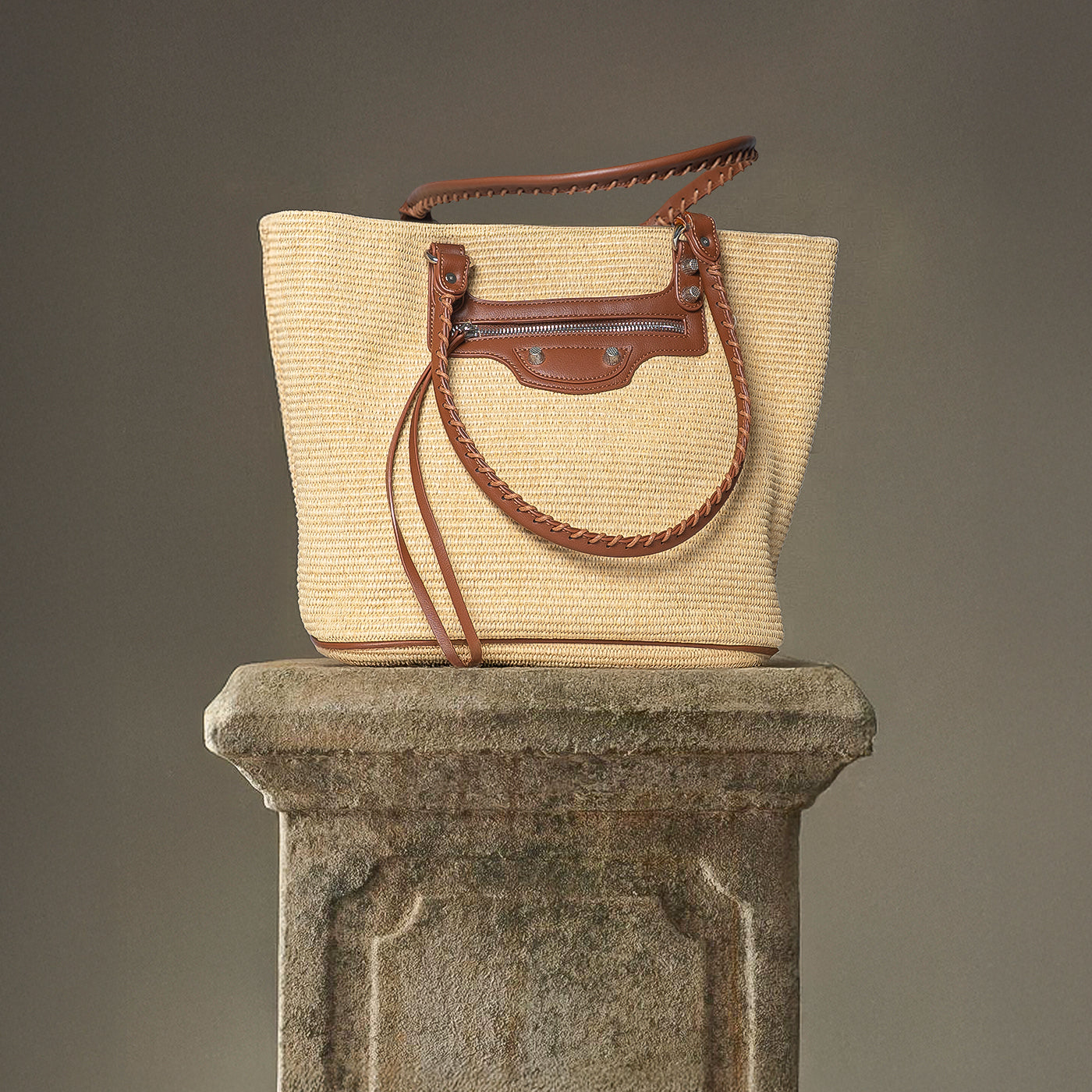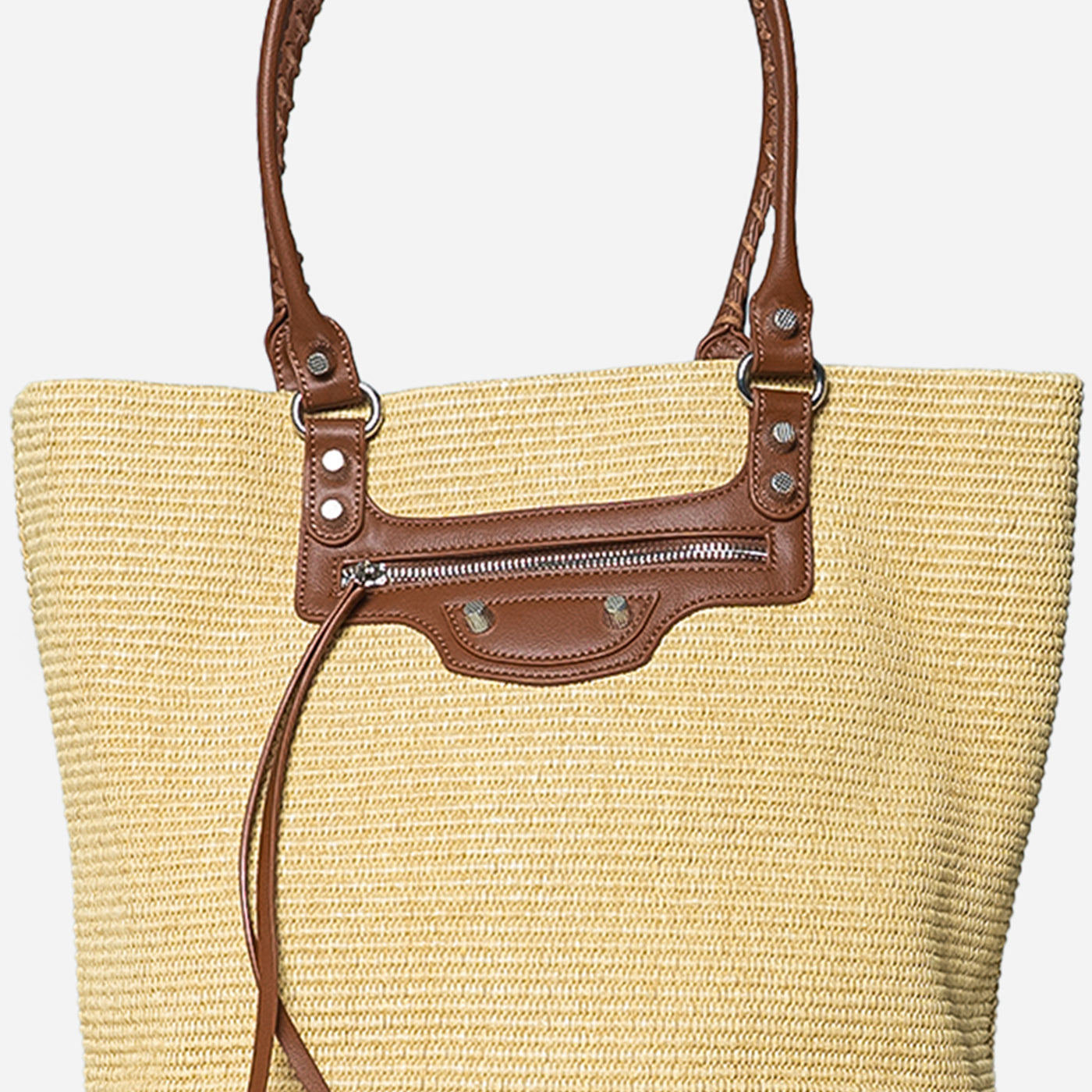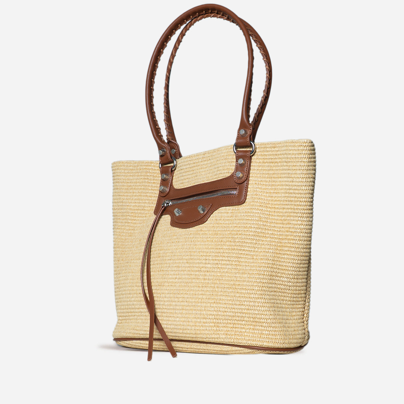 This versatile woven tote showcases natural raffia weaving paired with cognac leather trim. The structured rectangular silhouette offers generous storage, while the braided leather handles ensure comfortable carrying. A front zip pocket with decorative hardware adds functional elegance. Ideal for vacation getaways, farmers market visits, and relaxed daytime outings that call for laid-back refinement.