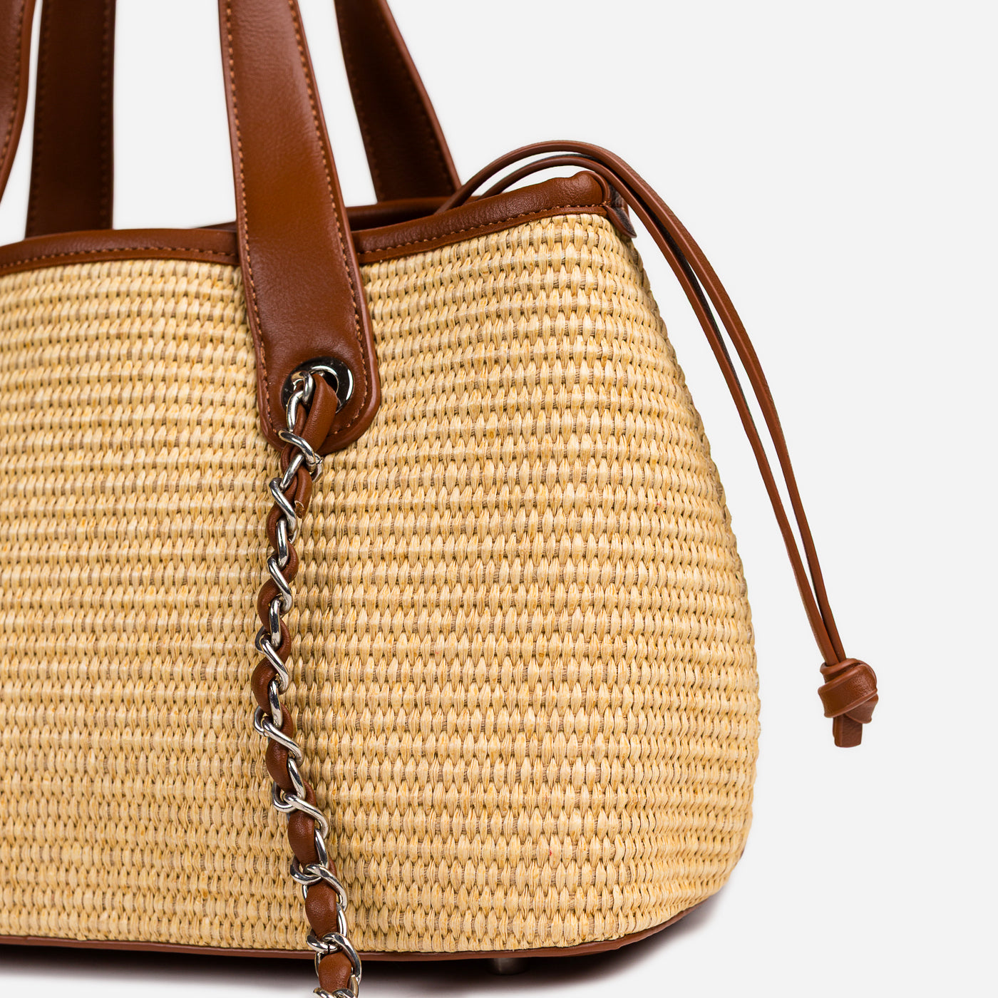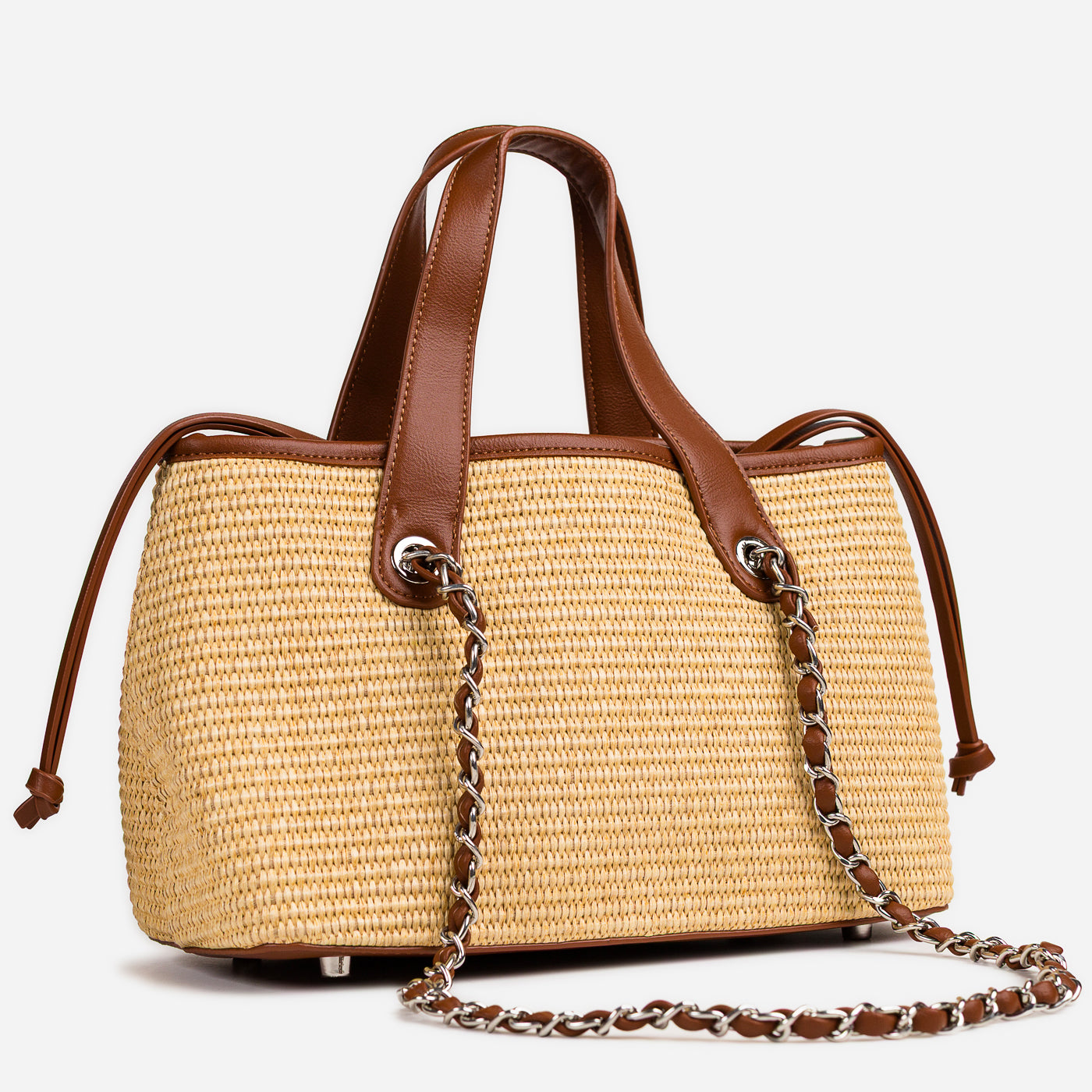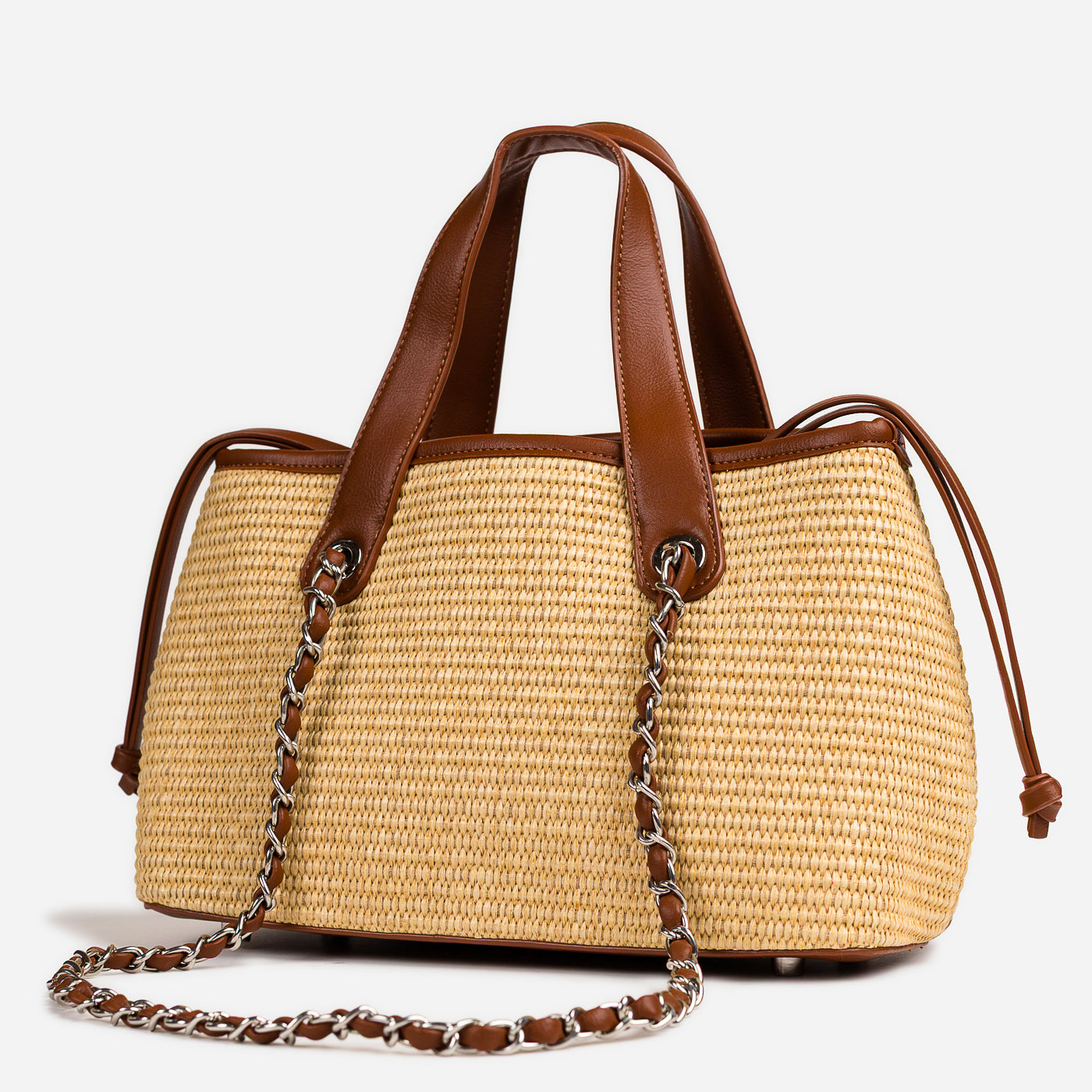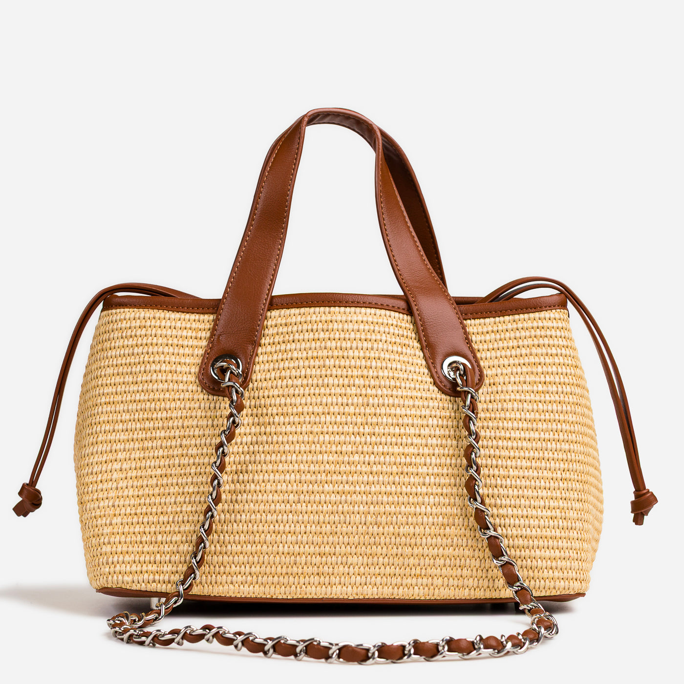 Blending relaxed texture with refined detailing, this handbag brings effortless charm to everyday styling. The woven body creates a lightweight, summery appeal, while smooth contrasting trims and chain accents add a touch of sophistication. Spacious yet easy to carry, it’s a versatile choice for casual days, brunch outings, or weekend getaways.