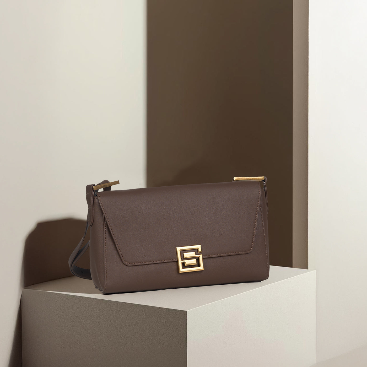 This sophisticated shoulder bag features smooth taupe leather with a clean, structured silhouette. The distinctive gold geometric clasp adds architectural interest, while the gold tone metal frame at the top creates a polished finish. The adjustable shoulder strap ensures comfortable wear. Perfect for professional settings, dinner engagements, and occasions that demand understated elegance with modern appeal.