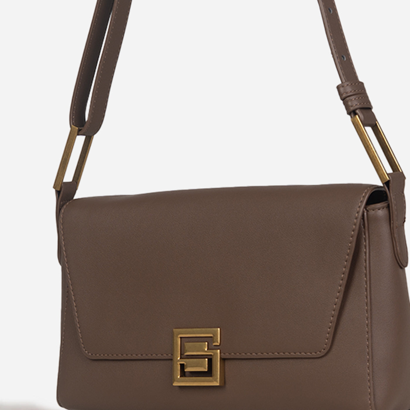This close up reveals the impeccable construction and quality leather finish. The geometric gold clasp creates a striking focal point against the smooth taupe surface, while the gold metal frame adds structural elegance. Precise stitching and clean lines showcase meticulous attention to detail. A refined accessory that combines minimalist aesthetics with functional sophistication.
