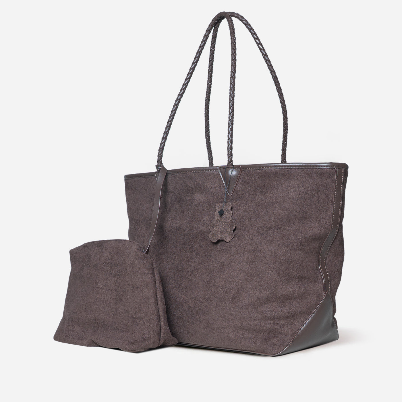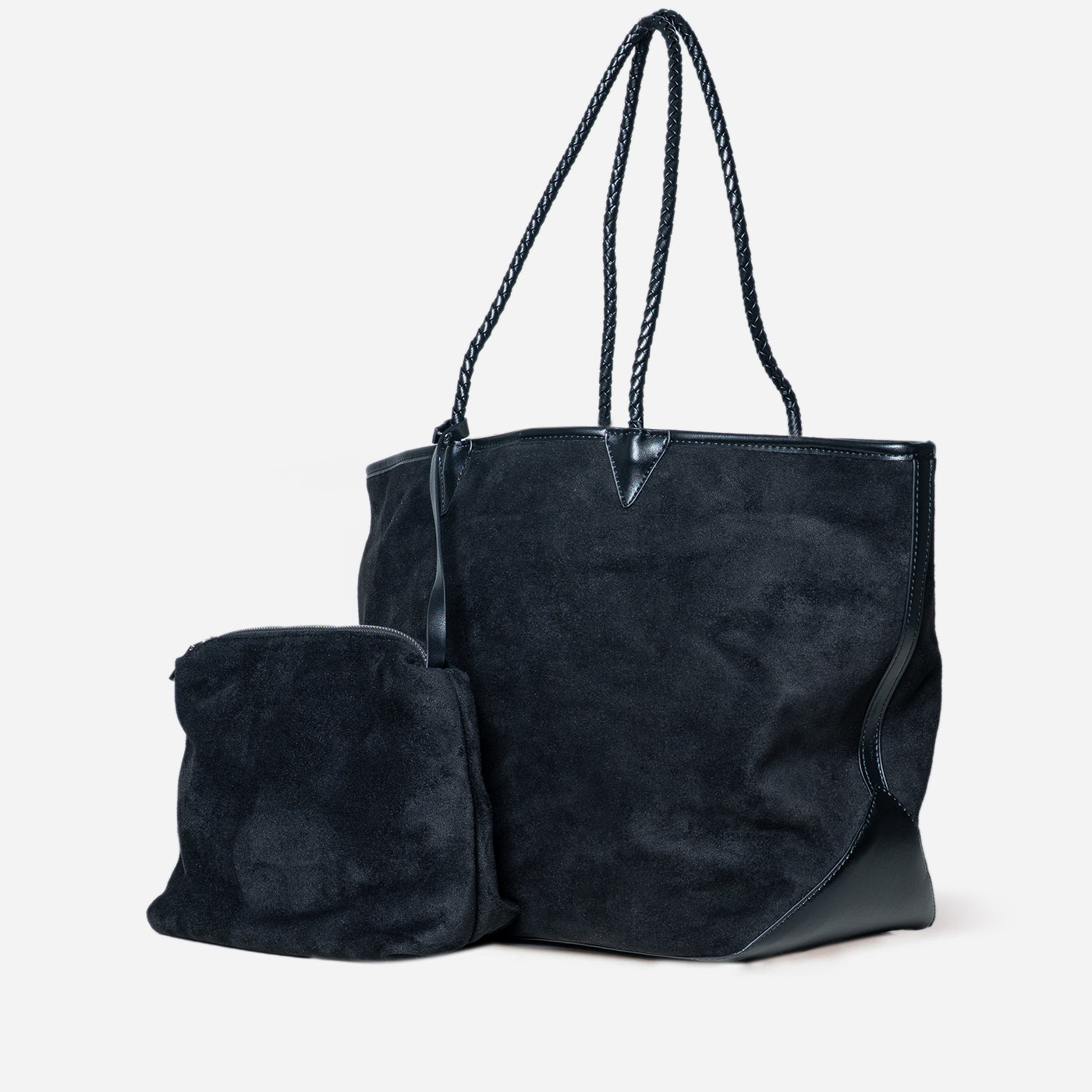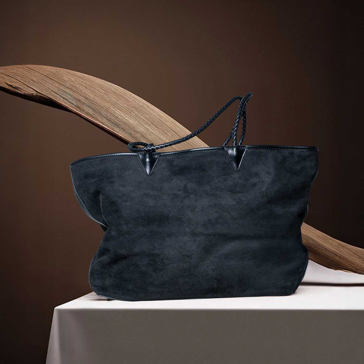 This versatile set features a spacious suede tote paired with a matching drawstring pouch. The soft suede exterior creates luxurious texture, while braided handles add refined detail. The included pouch keeps smaller items organized within the roomy main compartment. A practical everyday companion that combines elegant materials with functional design for modern, on the go lifestyles.