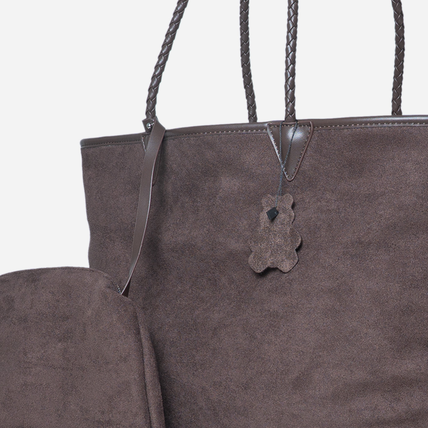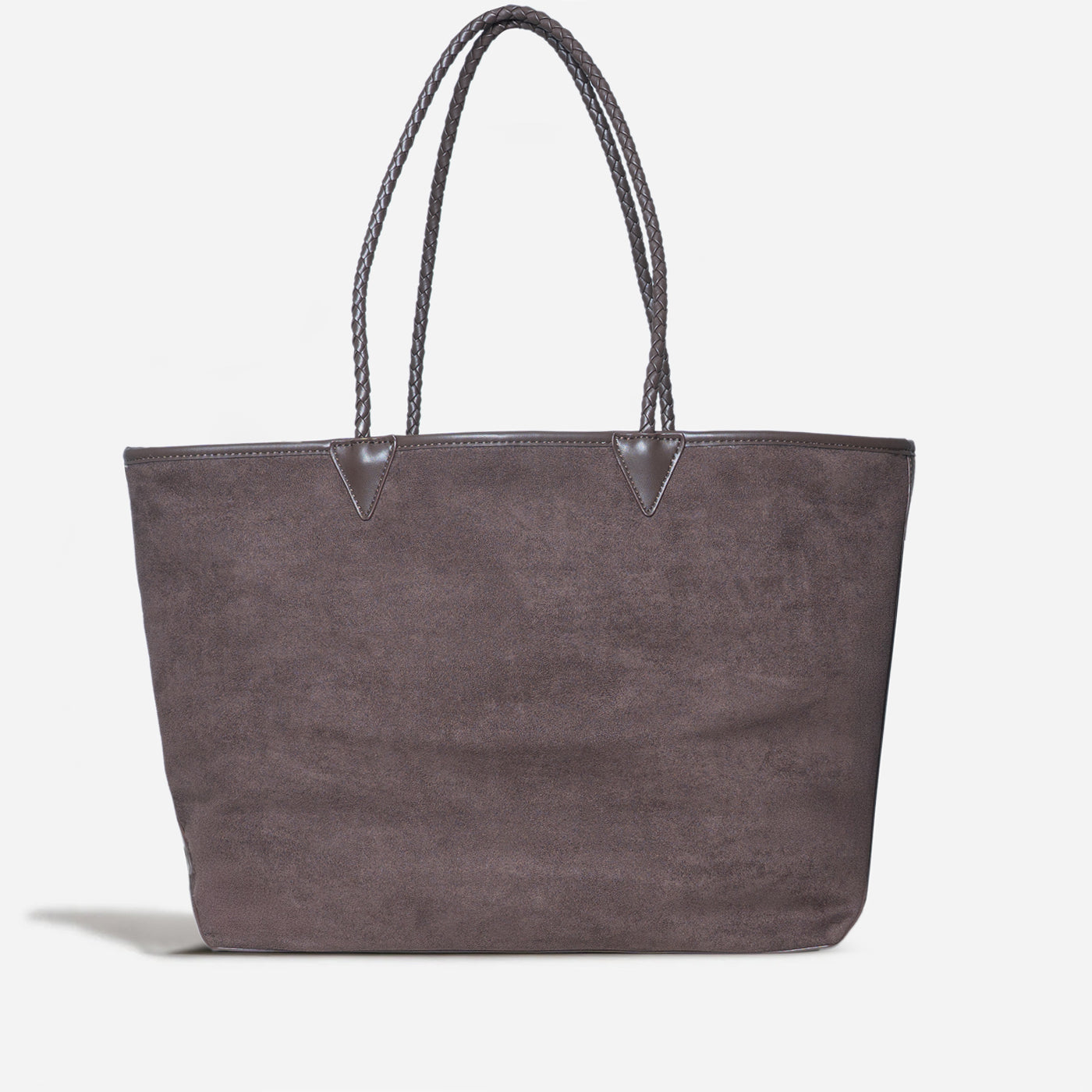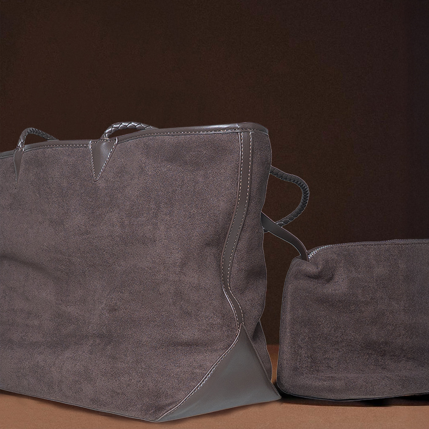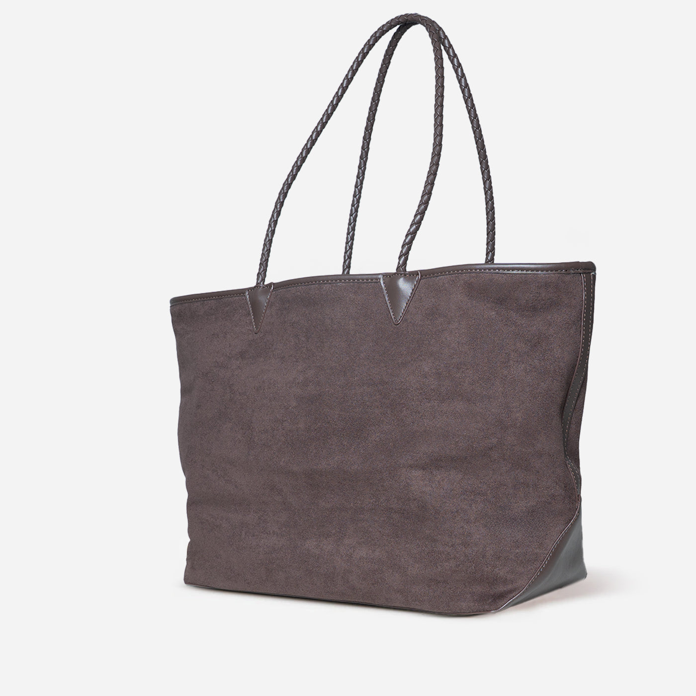 This sophisticated tote features soft taupe suede with a subtle textured finish. The spacious rectangular silhouette offers generous storage, while braided leather handles add artisan detail. The clean, unstructured design creates a relaxed yet refined aesthetic. Perfect for everyday errands, casual work settings, and weekend outings that call for understated elegance with practical functionality.