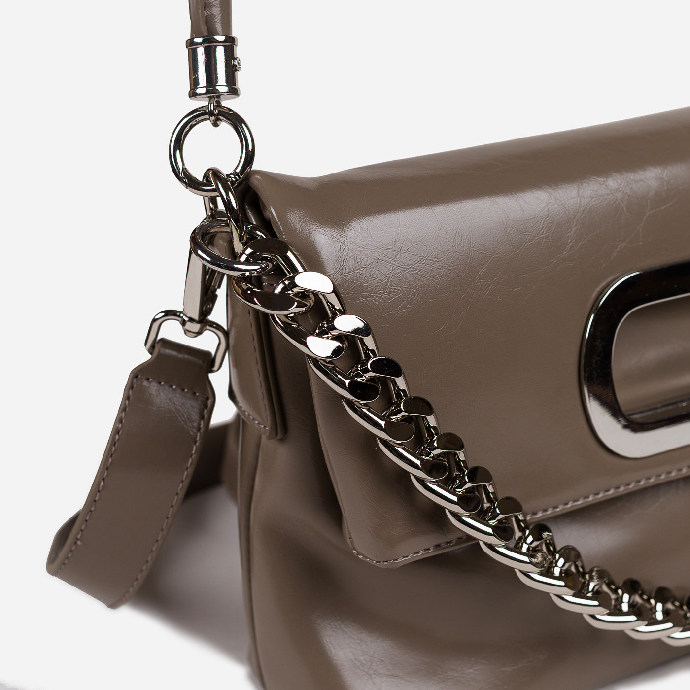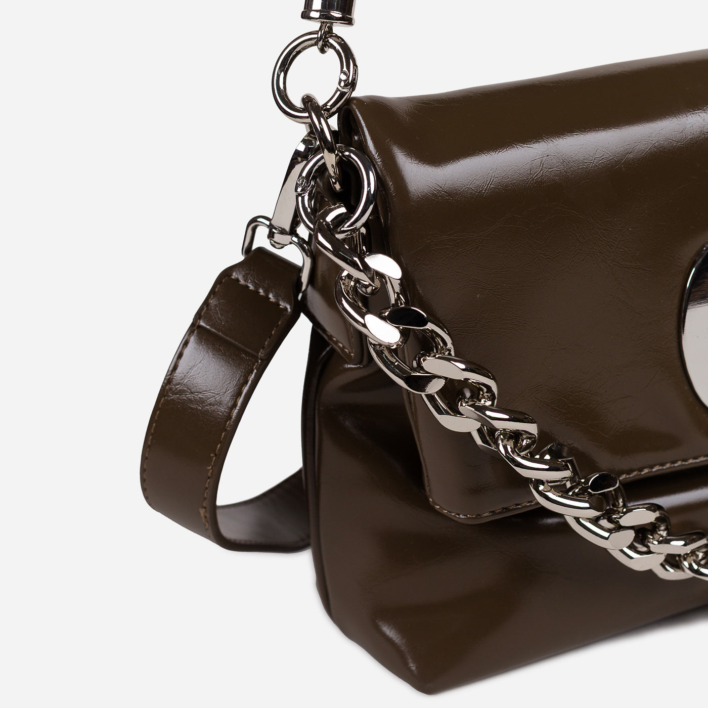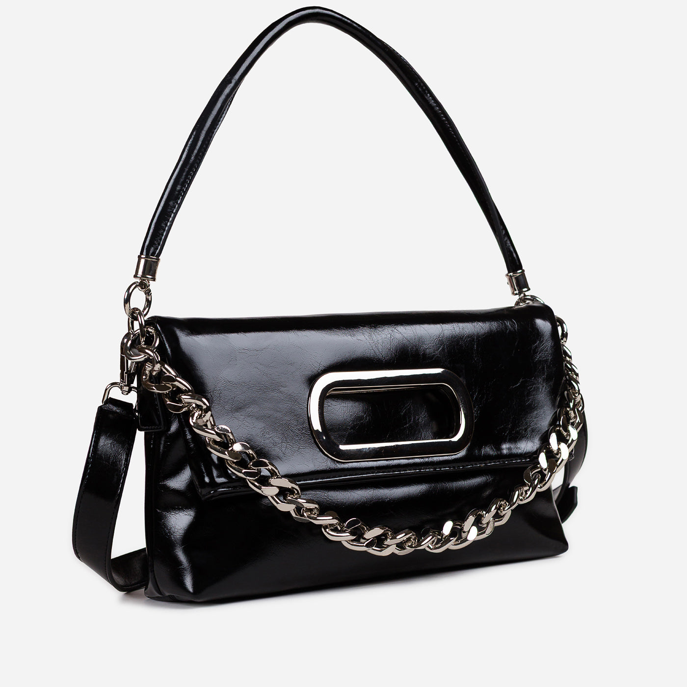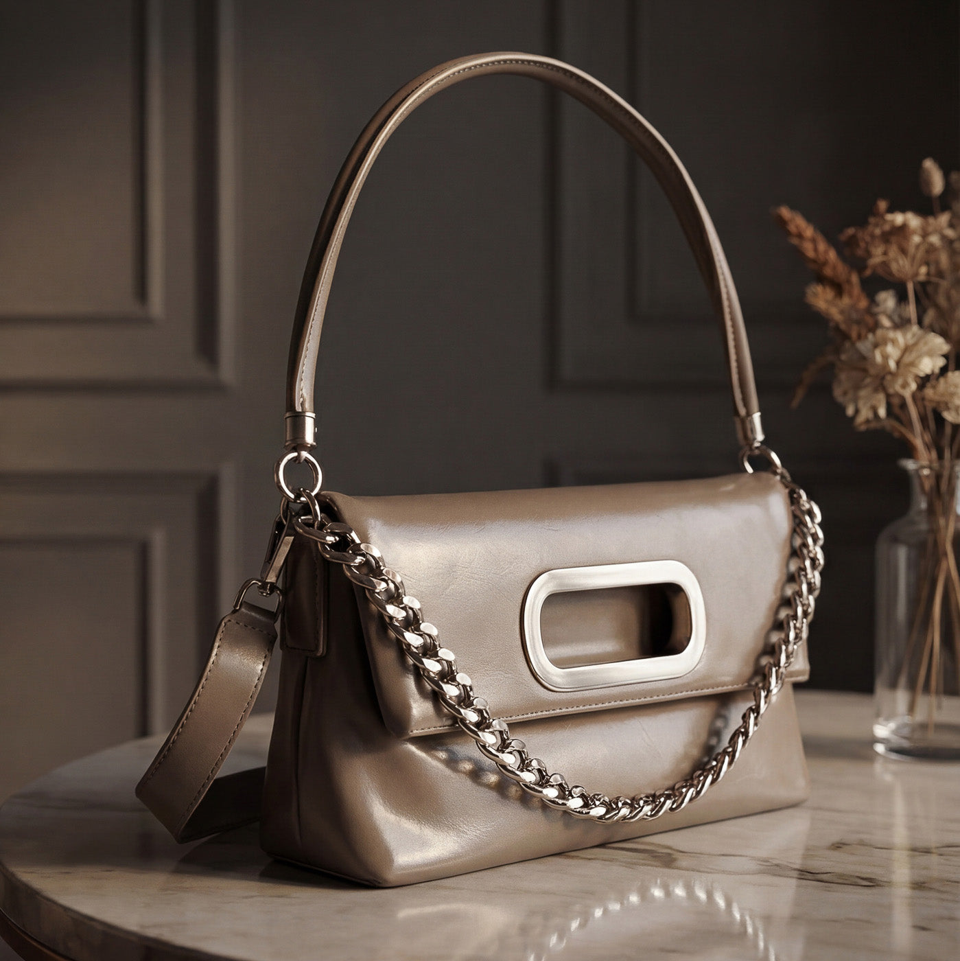 Sleek and contemporary, this compact shoulder bag brings a refined edge to everyday styling. Crafted with a smooth faux leather finish, it features a structured silhouette accented by a bold metallic chain that adds just the right amount of shine. Designed for versatility, it transitions effortlessly from daytime outings to evening plans while keeping essentials neatly in place.