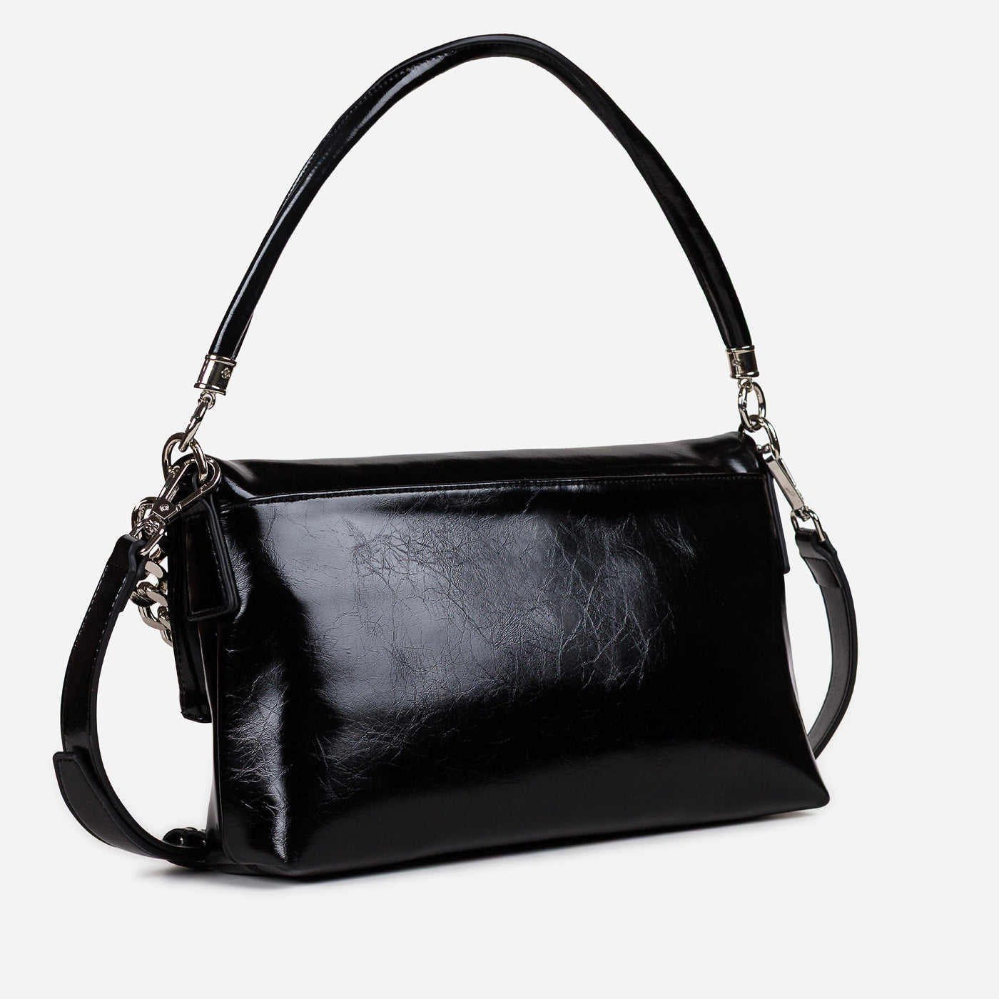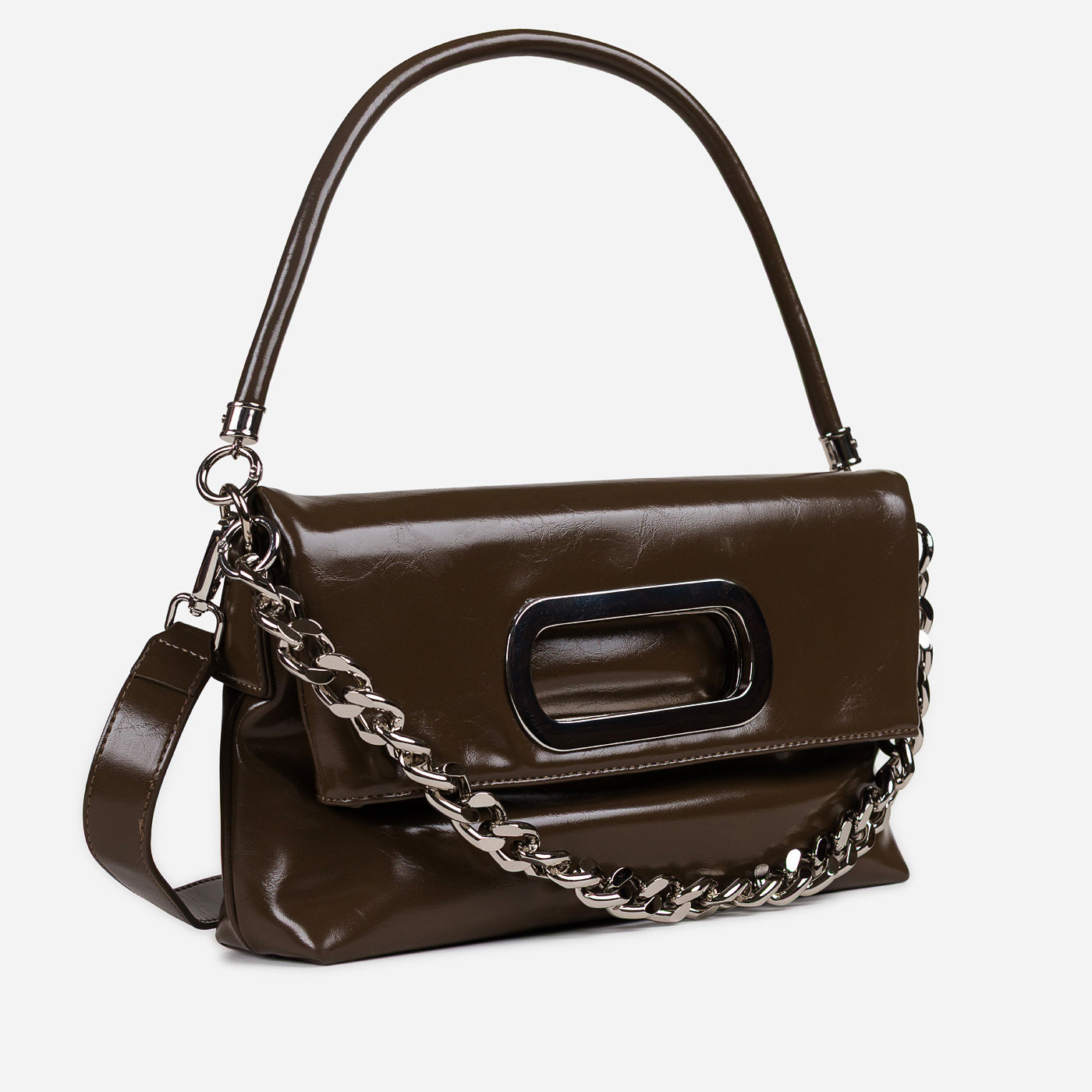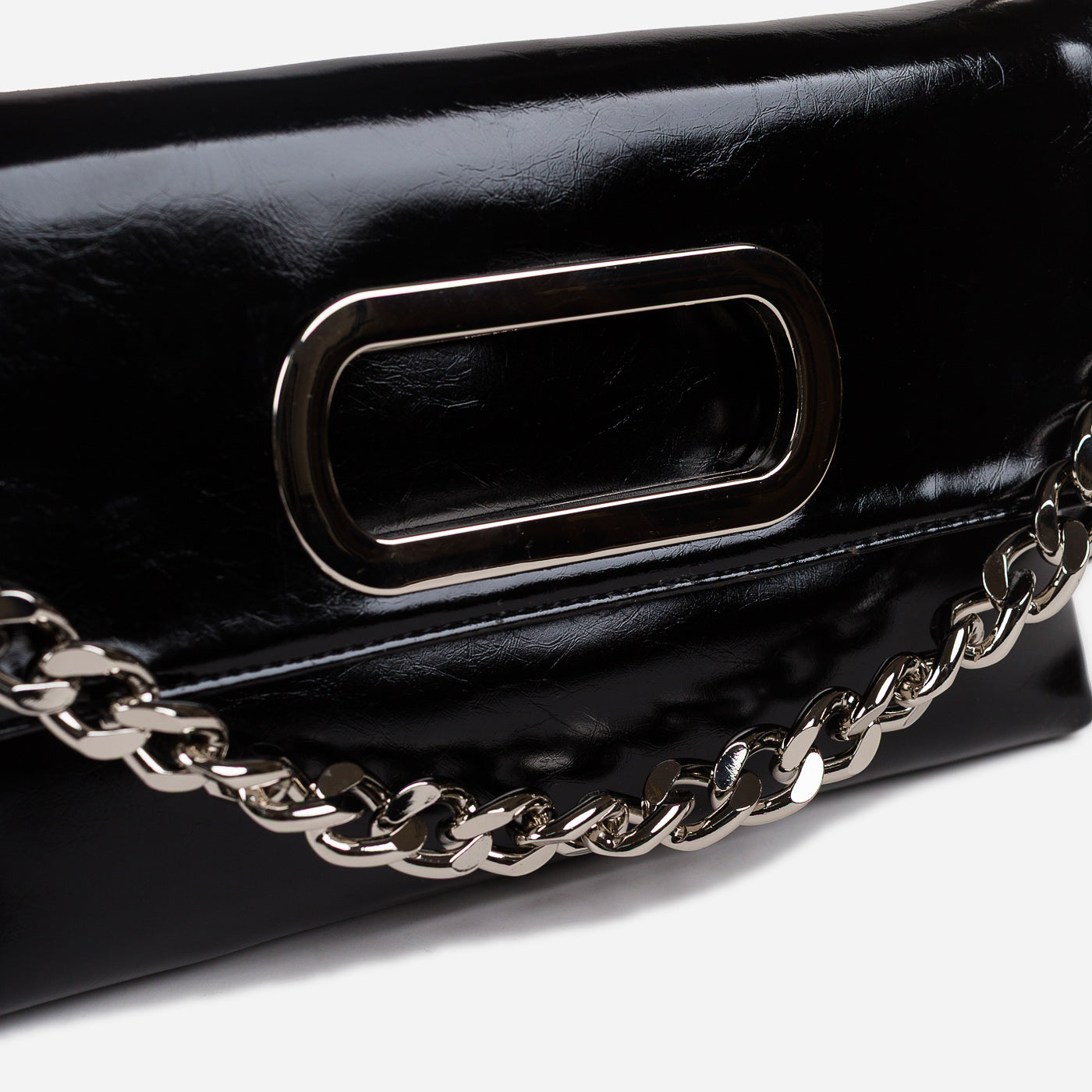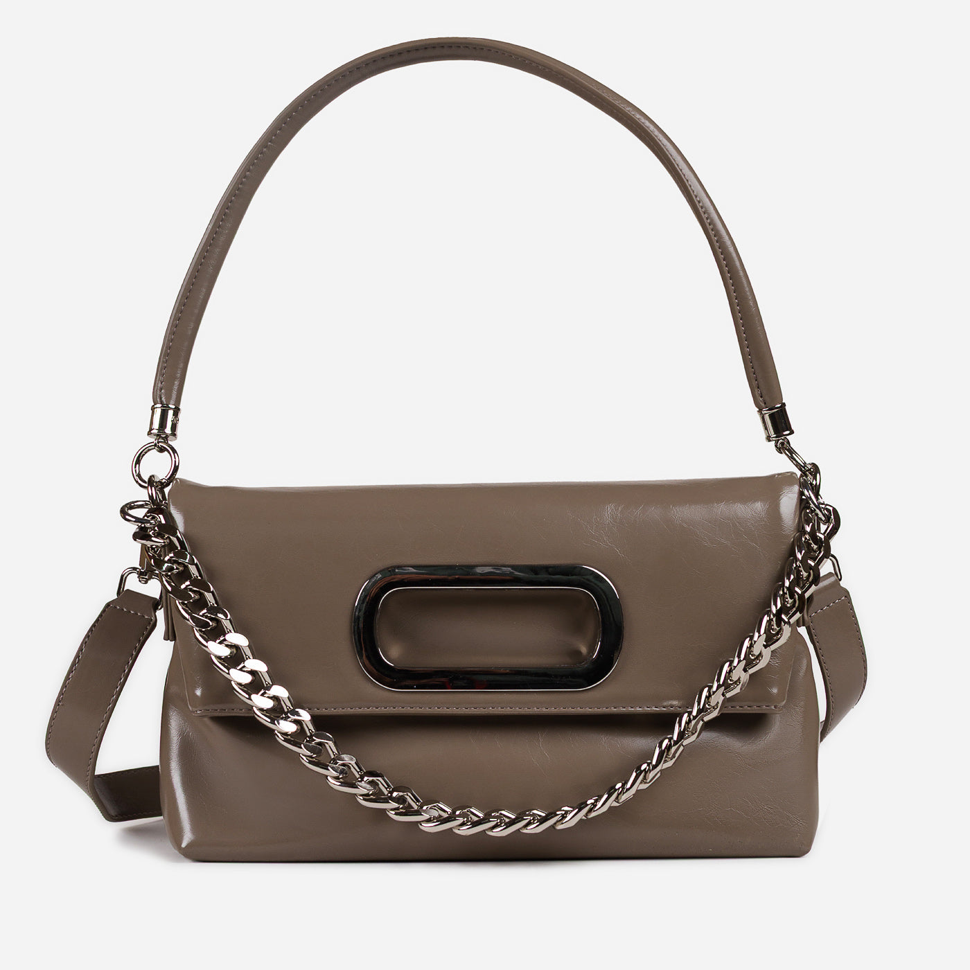 Sleek and contemporary, this compact shoulder bag brings a refined edge to everyday styling. Crafted with a smooth faux leather finish, it features a structured silhouette accented by a bold metallic chain that adds just the right amount of shine. Designed for versatility, it transitions effortlessly from daytime outings to evening plans while keeping essentials neatly in place.