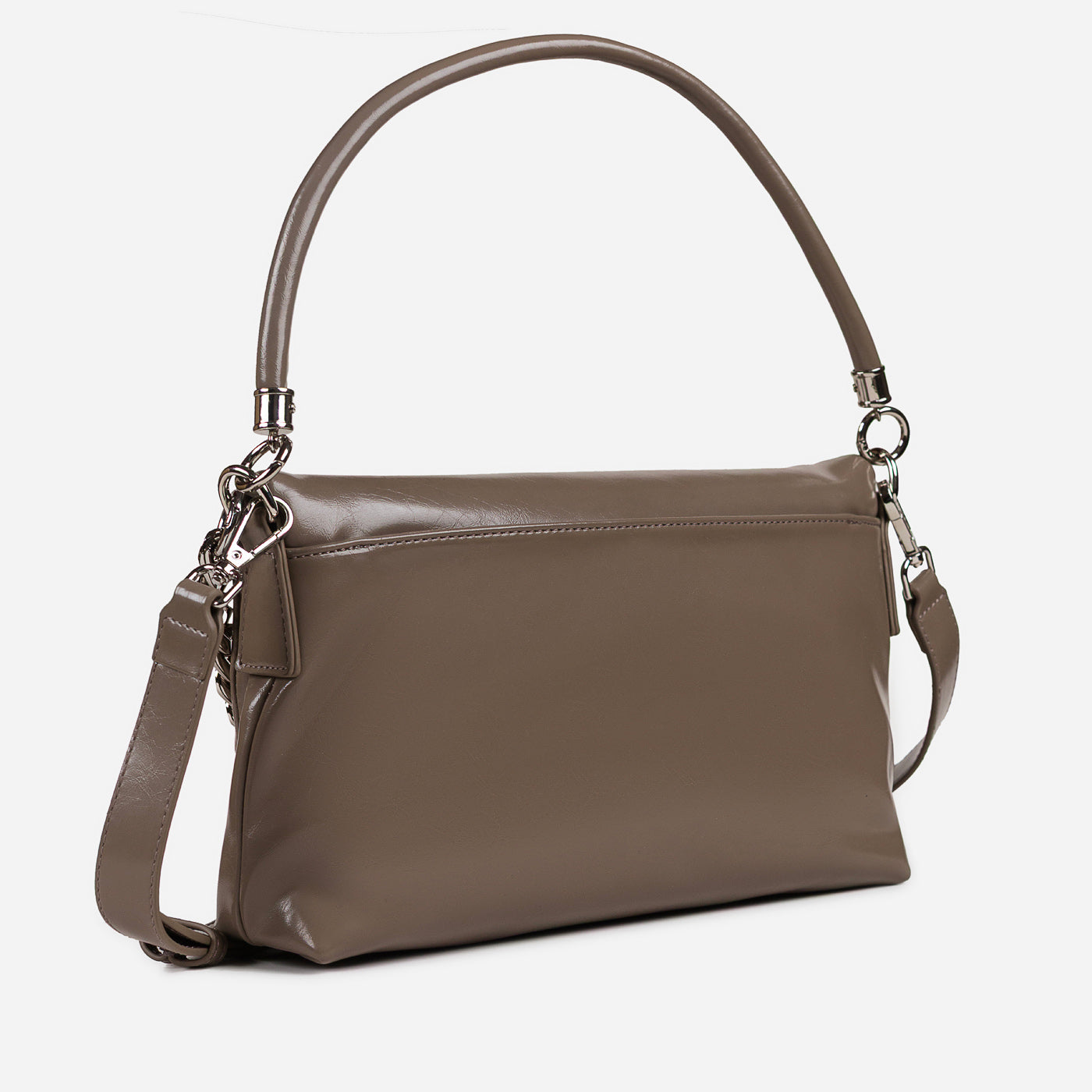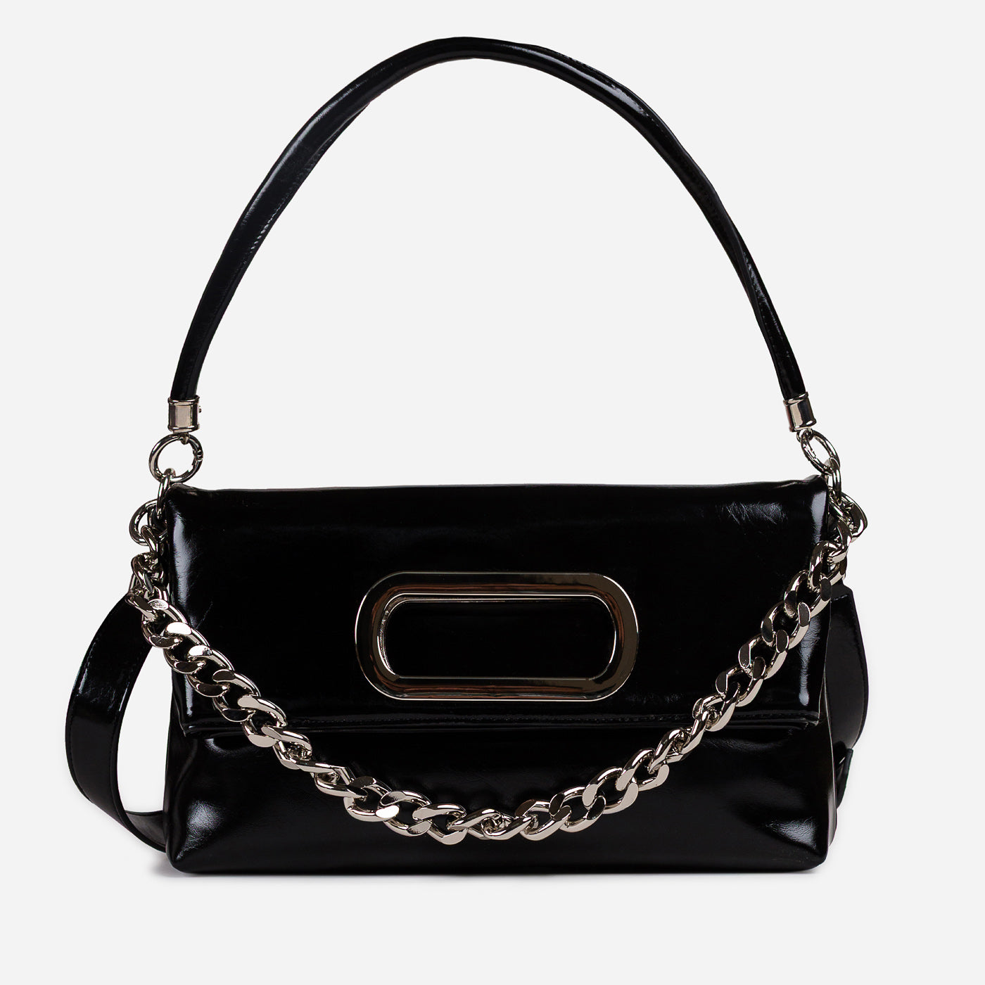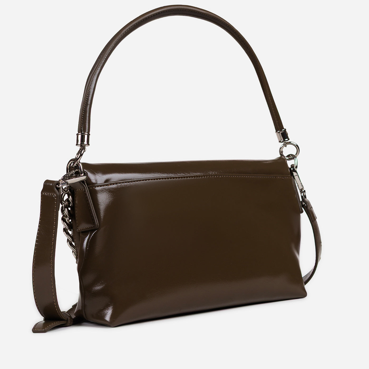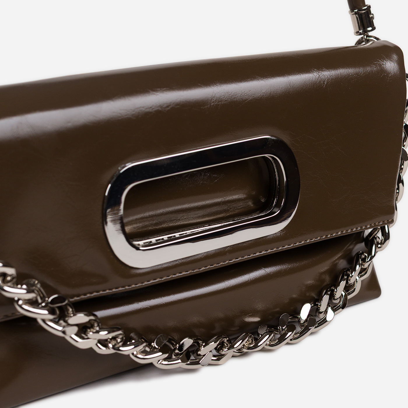 Sleek and contemporary, this compact shoulder bag brings a refined edge to everyday styling. Crafted with a smooth faux leather finish, it features a structured silhouette accented by a bold metallic chain that adds just the right amount of shine. Designed for versatility, it transitions effortlessly from daytime outings to evening plans while keeping essentials neatly in place.
