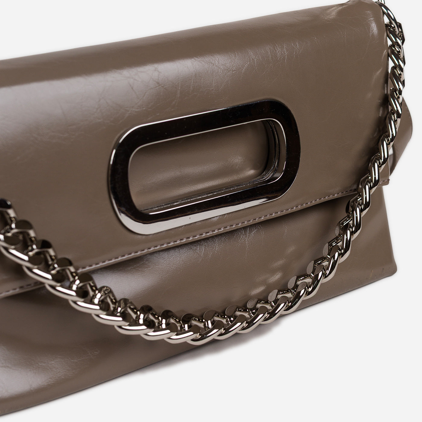 This elegant handbag features a soft taupe finish with a signature oval cutout handle framed in polished silver. The chunky chain detail adds modern edge while the smooth leather construction ensures lasting quality. The structured shape provides ample storage with a sophisticated presence. Perfect for work, dinner engagements, and upscale casual events that demand polished style.