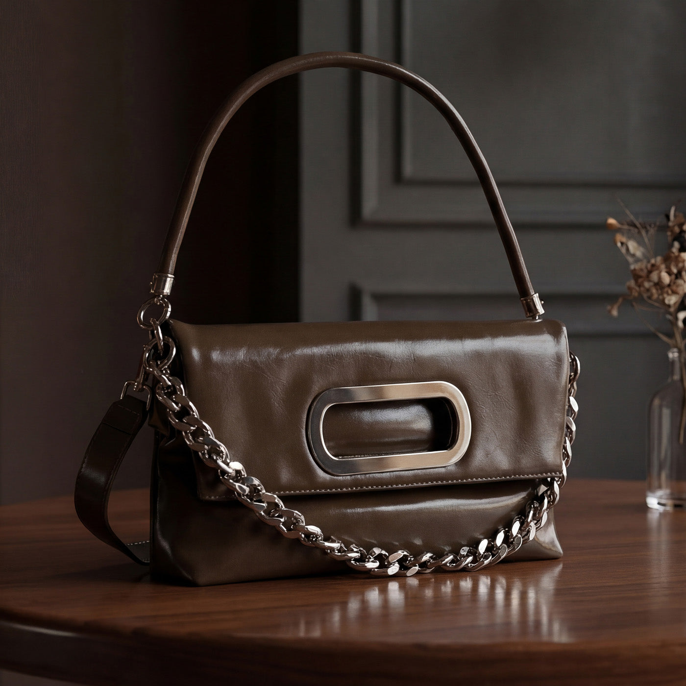 This striking handbag showcases a luxurious chocolate brown leather with subtle sheen. The distinctive oval handle cutout with metallic trim creates architectural interest, while the chunky chain accent adds contemporary flair. The structured silhouette maintains shape beautifully while offering practical storage. An essential piece for the modern professional who values both function and refined aesthetics.
