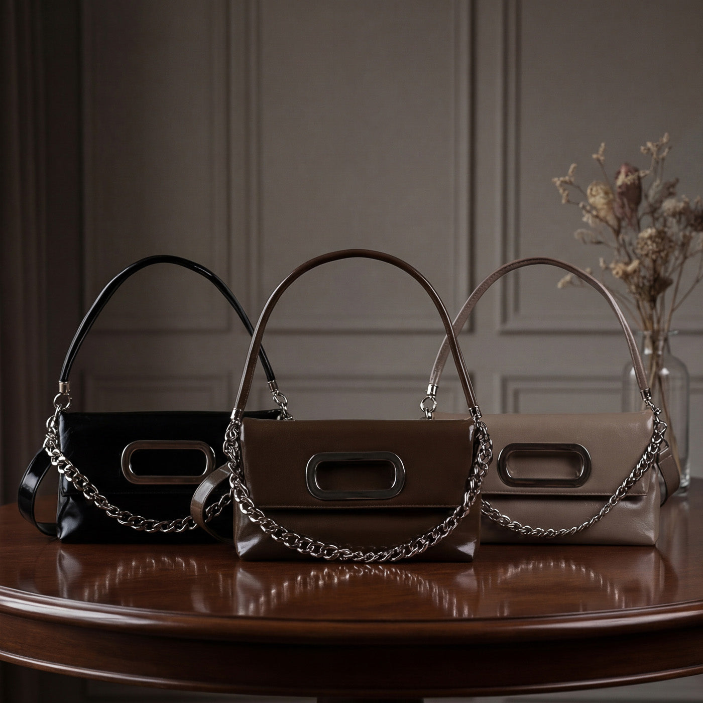 This sophisticated collection features three timeless colorways classic black, warm taupe, and rich chocolate brown. Each bag showcases a distinctive cutout handle detail with silver tone hardware and a statement chain accent. The structured silhouette offers generous space while maintaining a refined profile. Versatile pieces that transition seamlessly from professional settings to evening occasions.