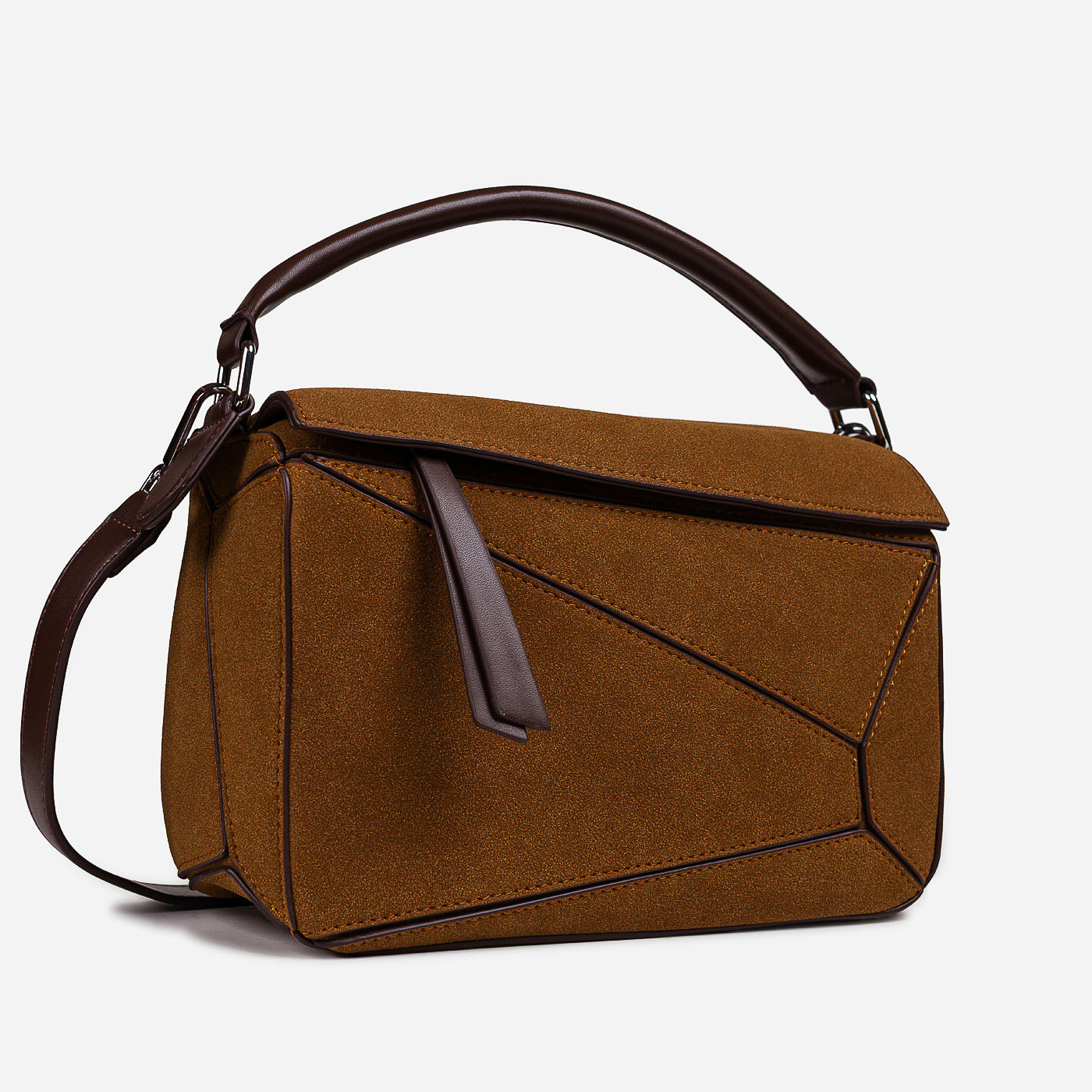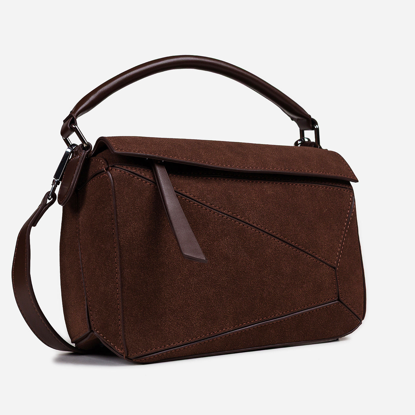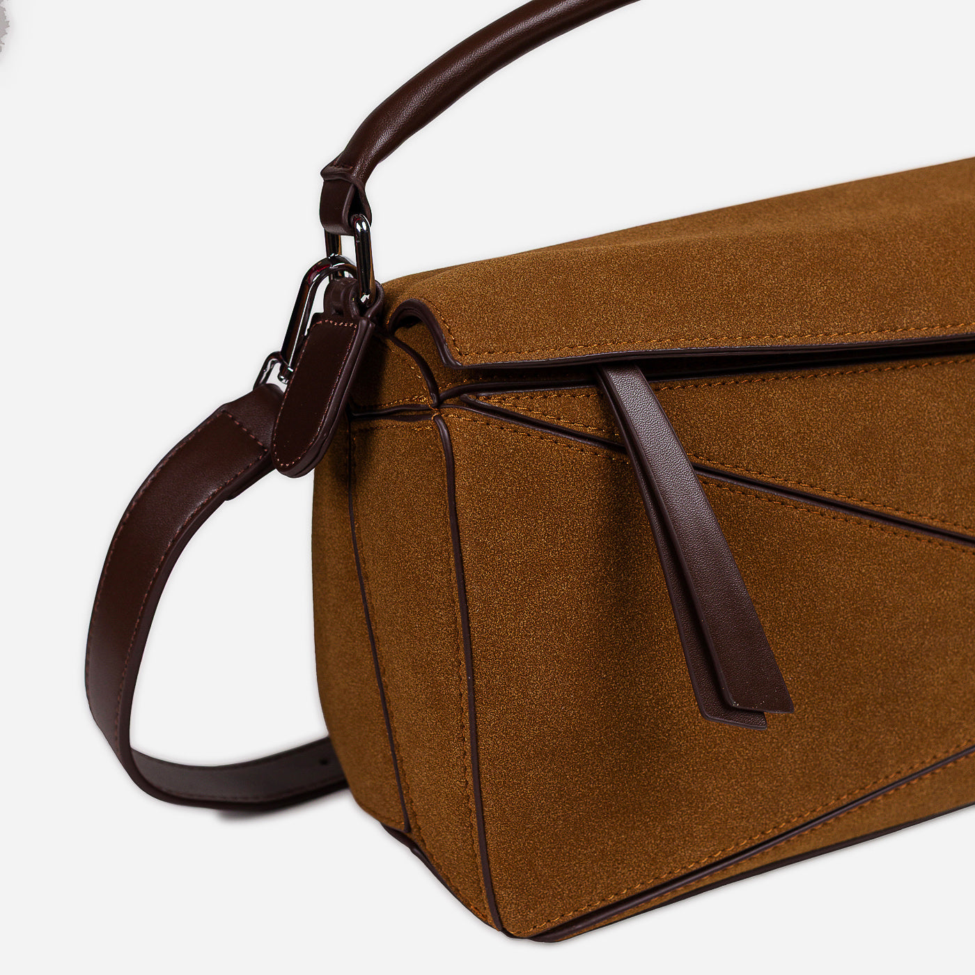 Rich and distinctive, this structured shoulder bag stands out with its soft suede-textured finish and striking geometric panel design. Accented with smooth faux leather trim and a sleek top handle, it brings a refined yet modern feel to everyday styling. Compact in size but thoughtfully designed, it’s perfect for carrying essentials while making a subtle statement.